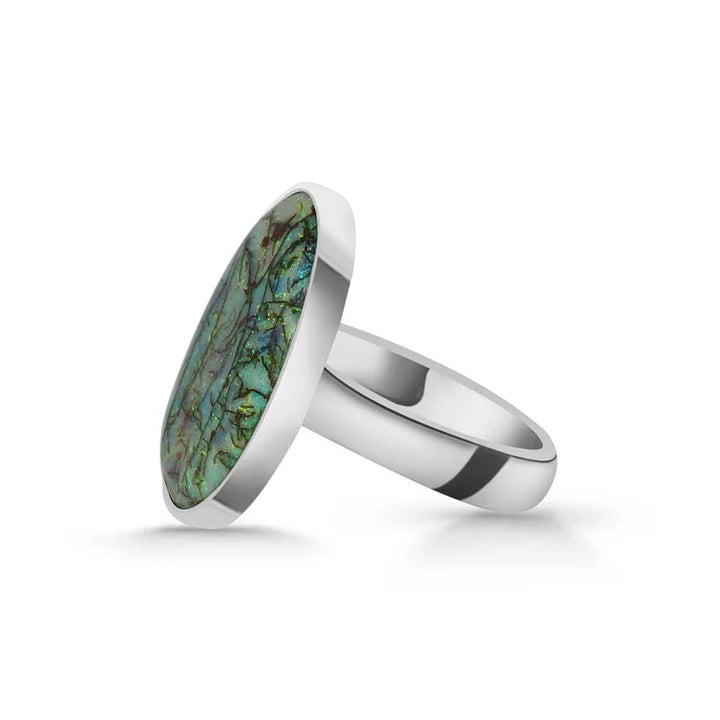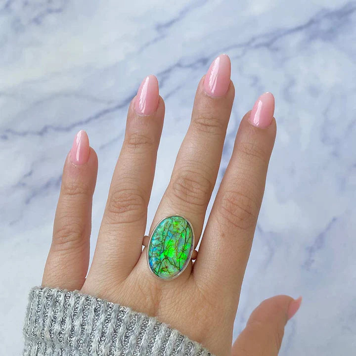 Ein eleganter und raffinierter Ring aus 925er Silbermit einem natürlichen äthiopischen Opal, bekannt für seine irisierenden Reflexe in Grün-, Rot- und Blautönen. Das minimalistische Design lässt den Stein im Mittelpunkt stehen und fängt das Licht aus jedem Winkel ein.