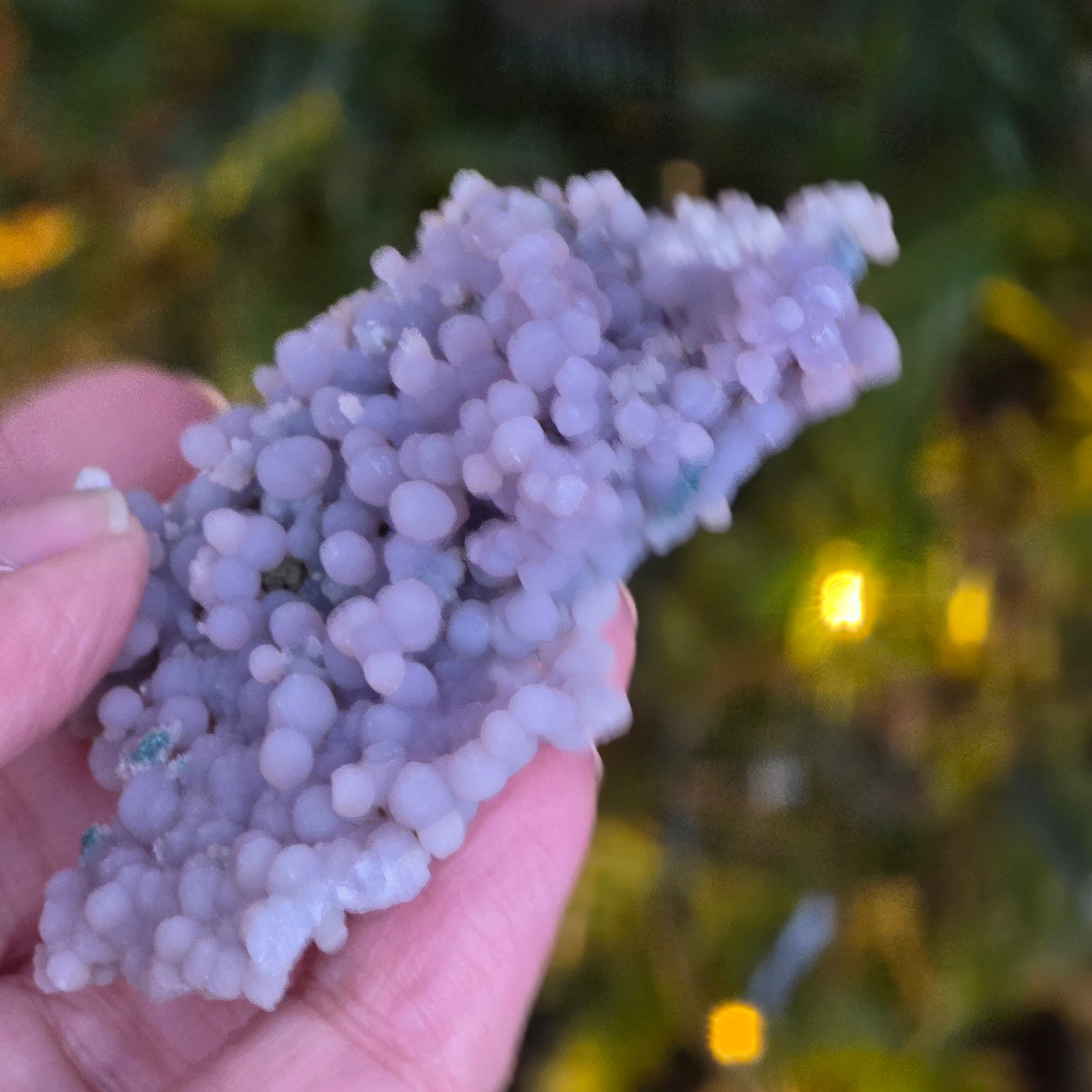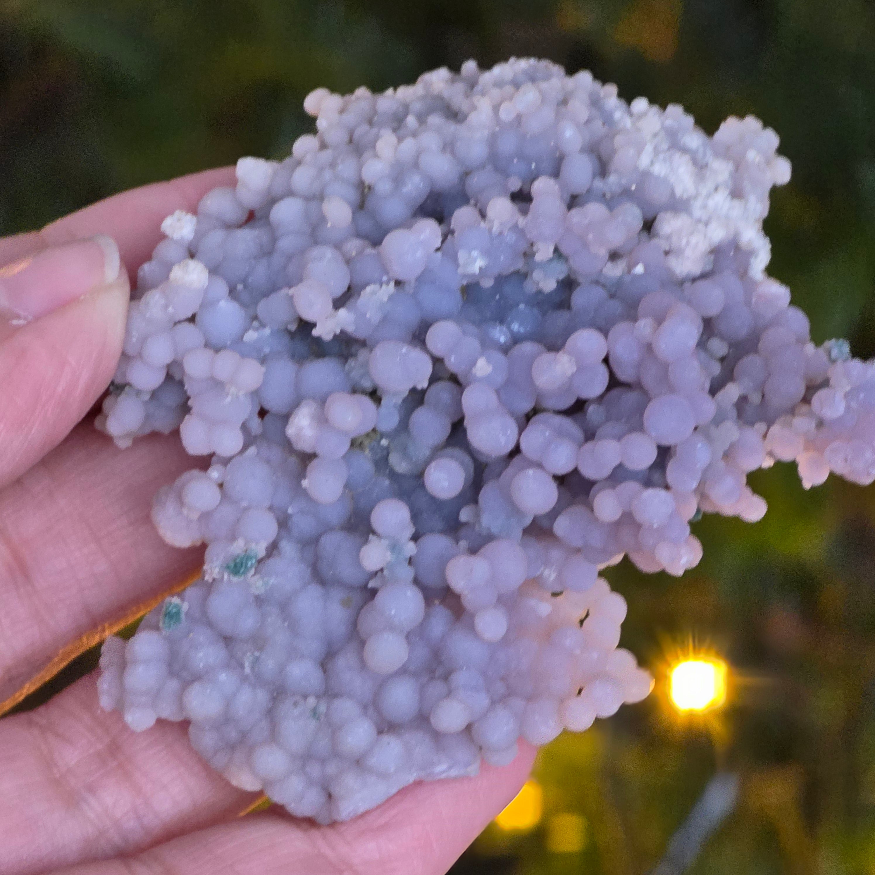 Traubenachat zeichnet sich durch seine einzigartigen Muster aus, die denen von Trauben ähneln. Diese Muster können in der Regel kugelförmige oder elliptische Formen haben, die regelmäßig oder zufällig auf der Oberfläche des Steins angeordnet sind. Die Farbe des Traubenachats kann von Violett-, Rosa-, Blau-, Grün- und Brauntönen bis zu neutraleren Nuancen wie Grau und Weiß reichen.