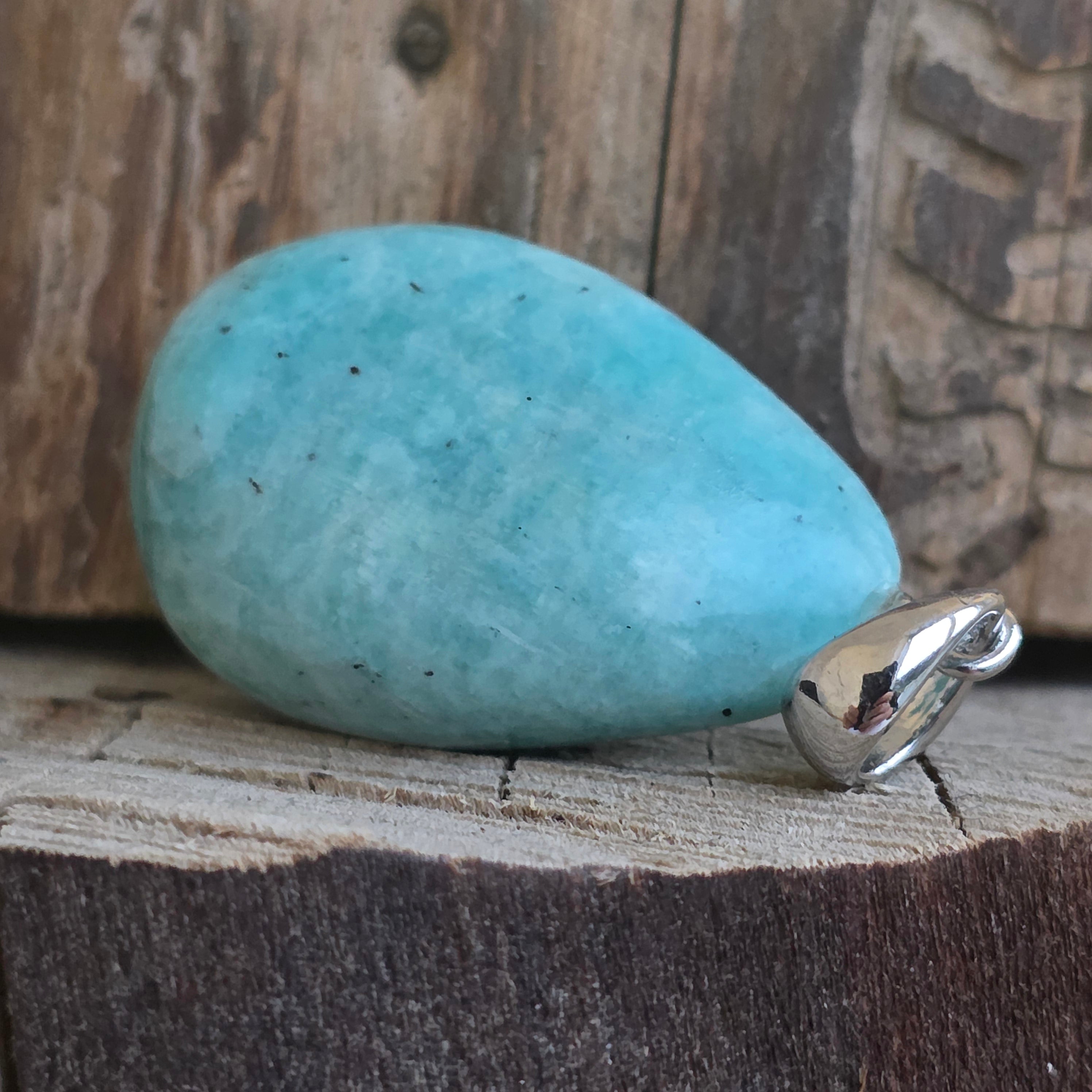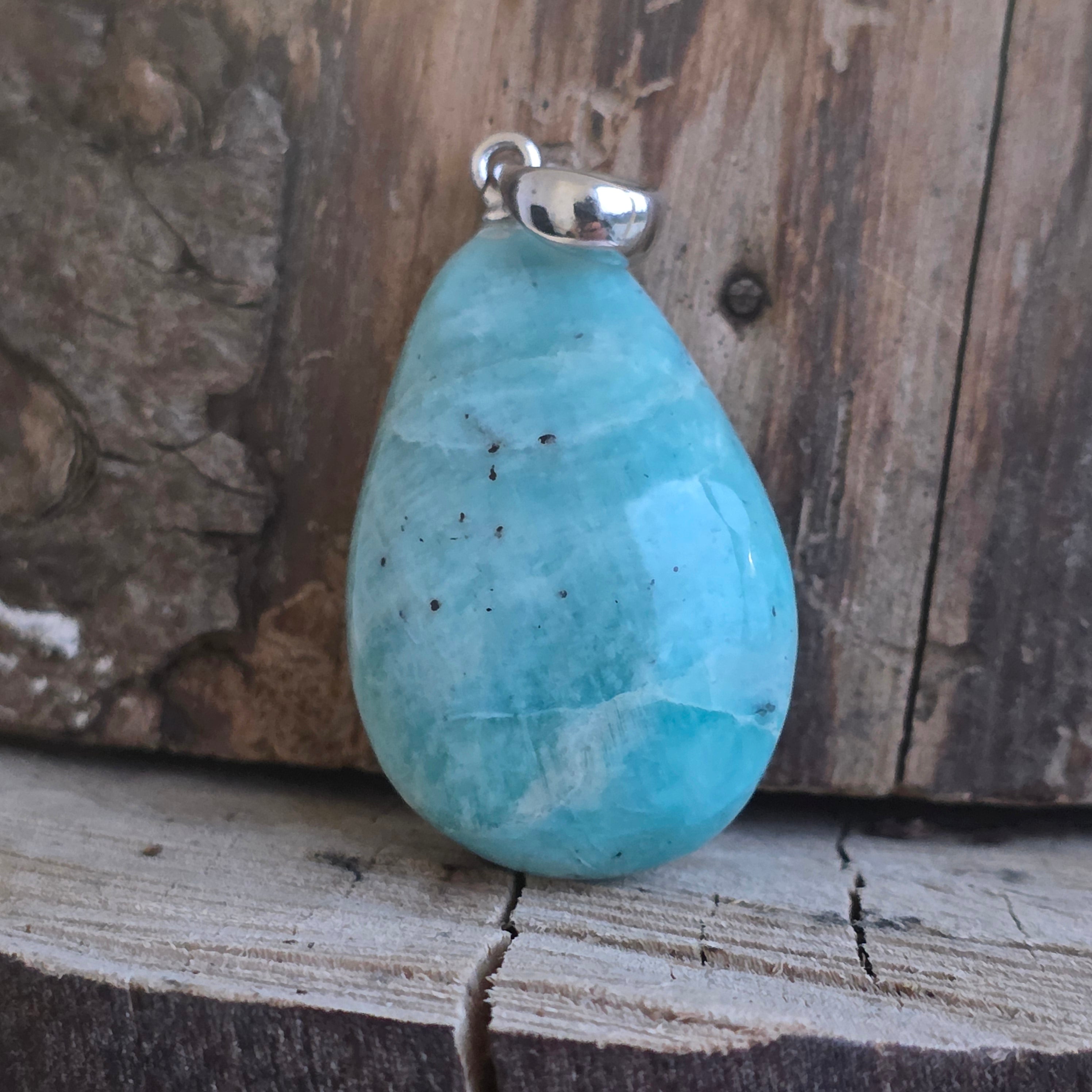 Das Anhänger mit Amazonic Cabochon Er unterstreicht die zarten grünen und blauen Steintöne, die mit dem inneren Frieden und der emotionalen Balance verbunden sind. Jedes Stück ist aufgrund der natürlichen Variationen von Farbe und Textur einzigartig, was diesen Anhänger zu einem wirklich besonderen Juwel macht.