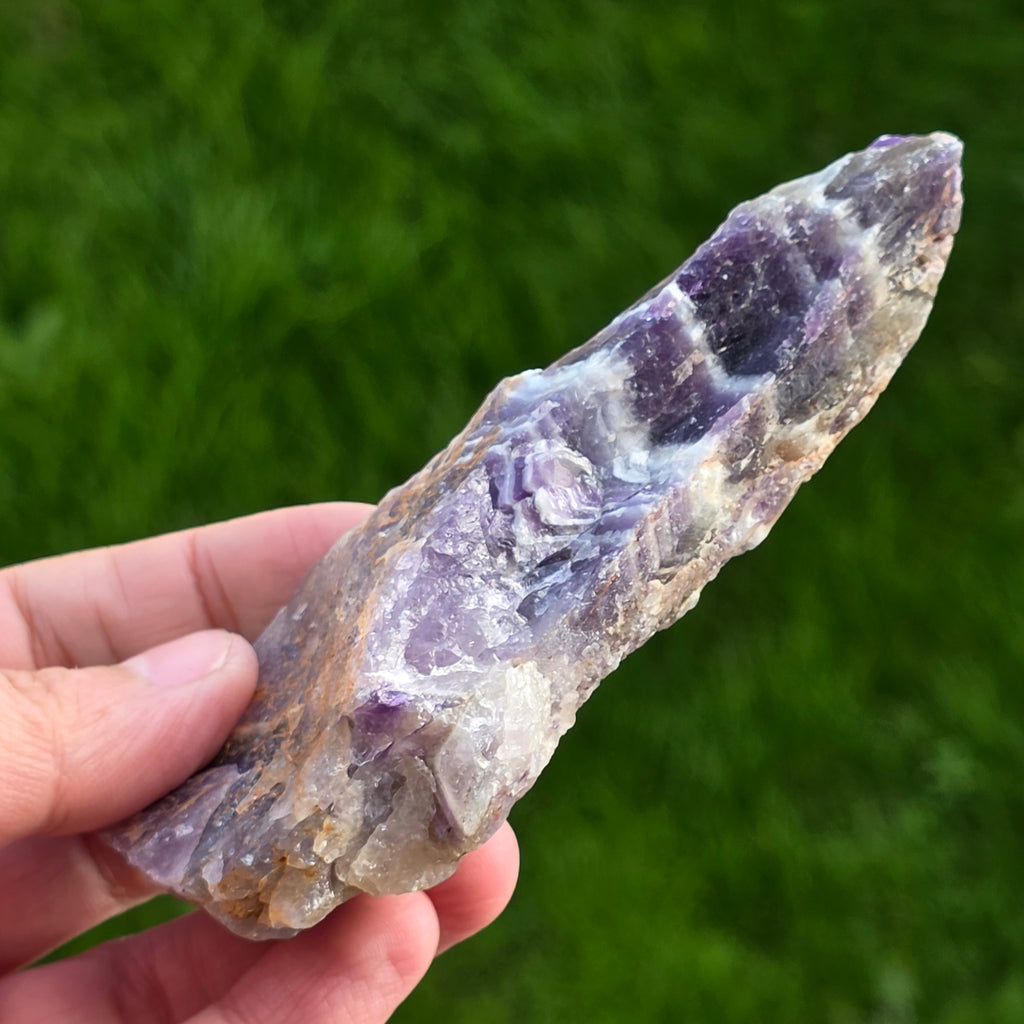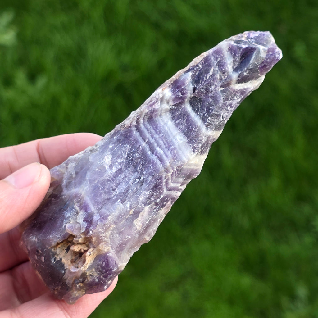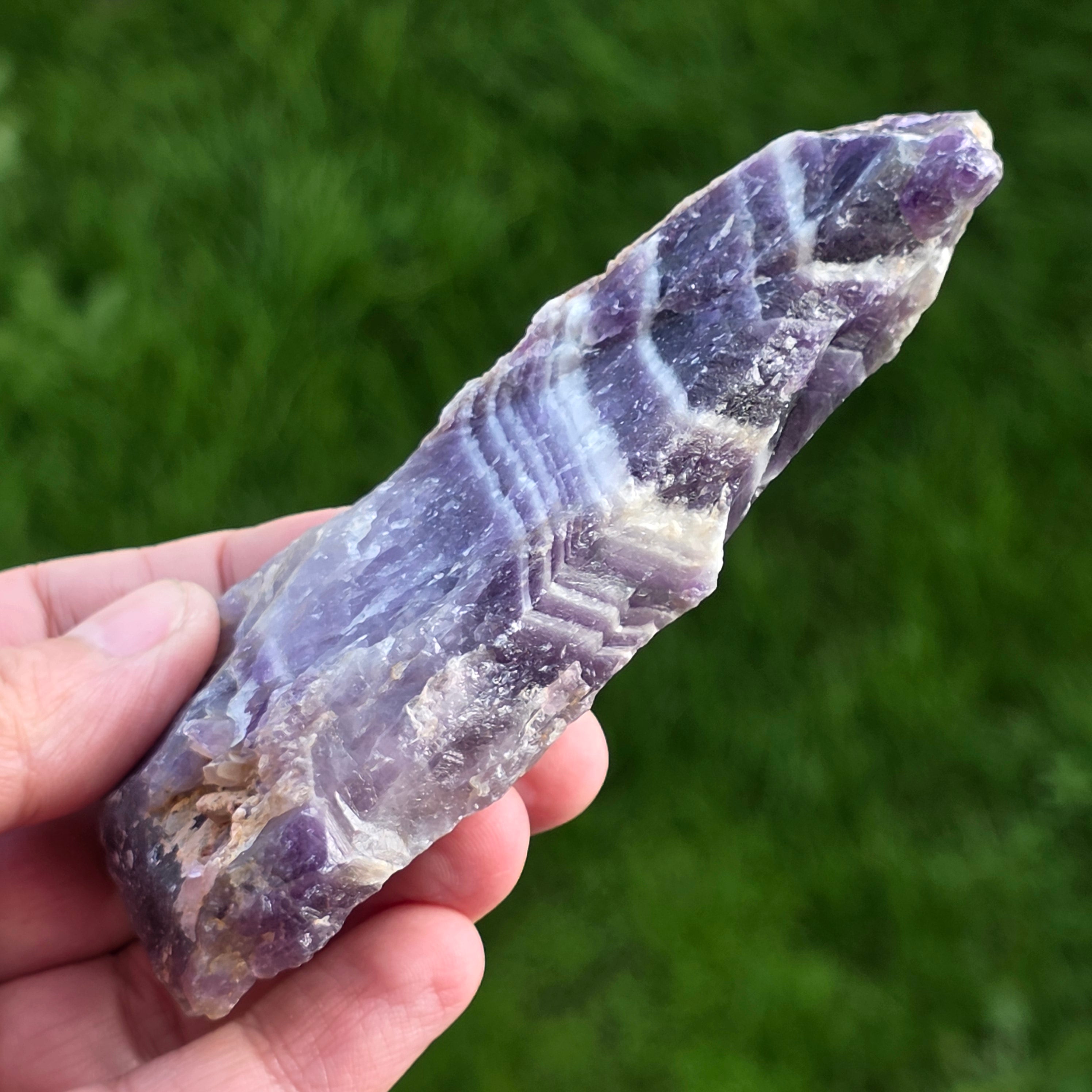 Das Chevron -Amethyst wird nach seinem charakteristischen V -verdrängten Streifenmodell benannt, das auf seiner Oberfläche erscheint. Amethyst Chevron ist eine Vielzahl von Amethyst, die Teil der Quarzfamilie ist.