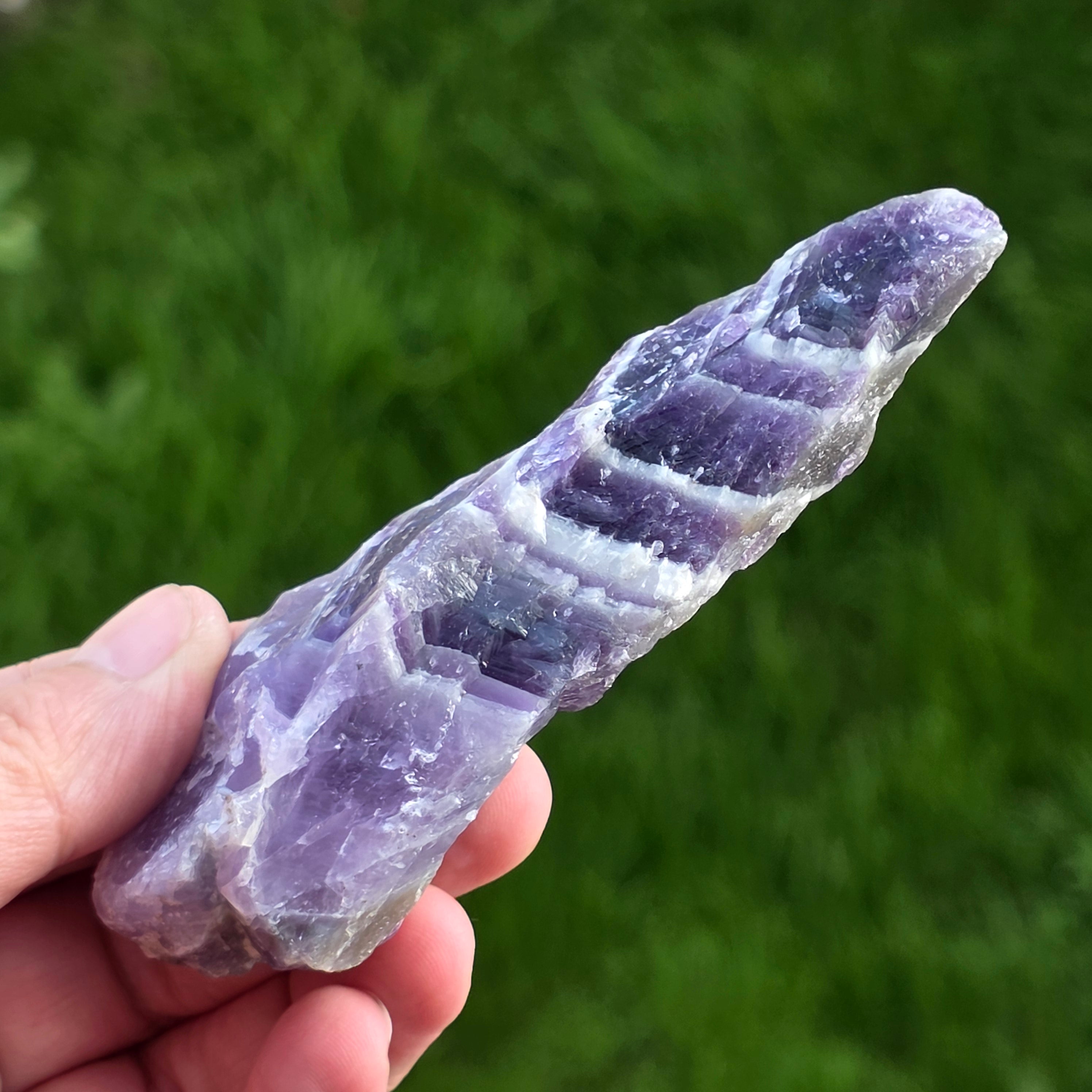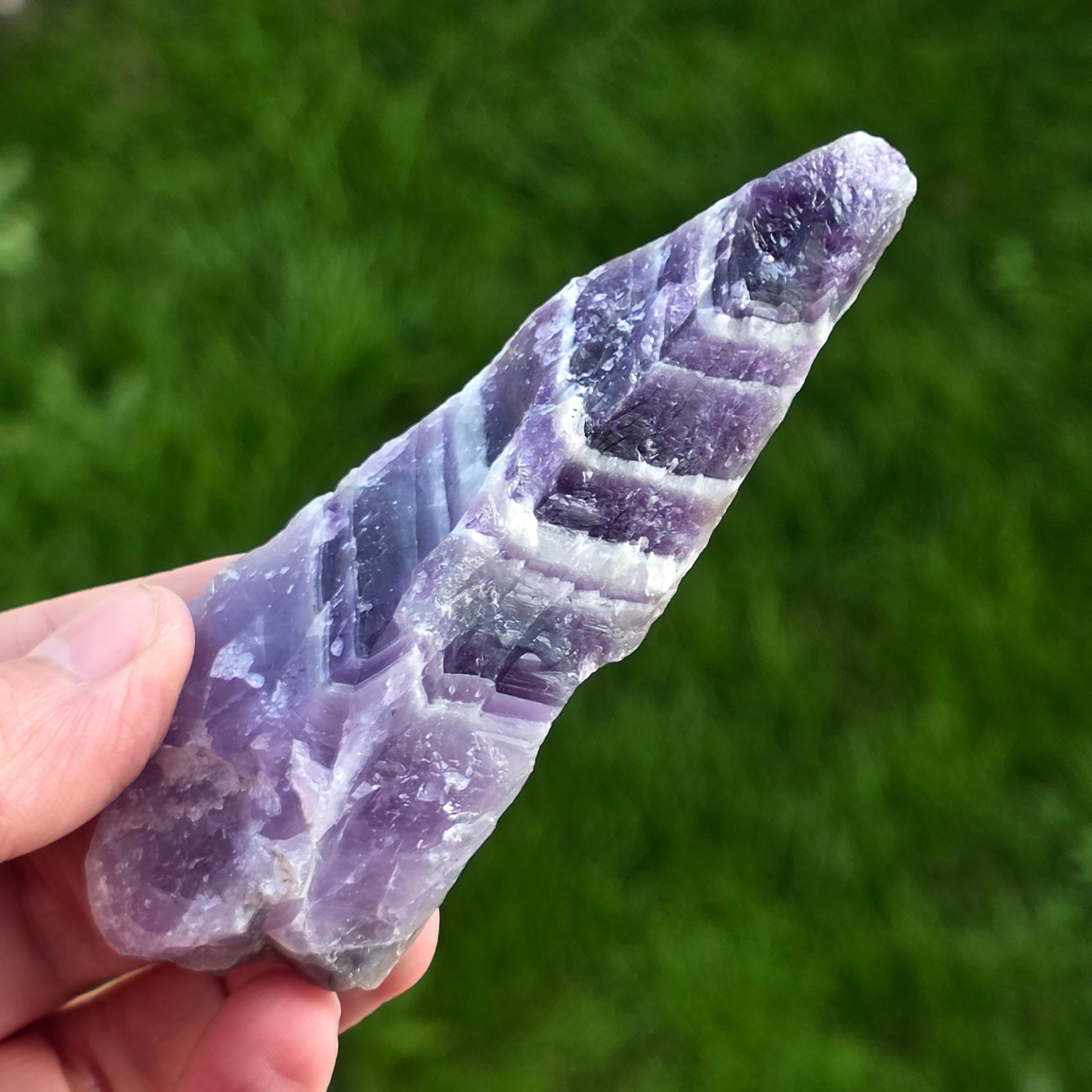 Das Chevron -Amethyst wird nach seinem charakteristischen V -verdrängten Streifenmodell benannt, das auf seiner Oberfläche erscheint. Amethyst Chevron ist eine Vielzahl von Amethyst, die Teil der Quarzfamilie ist.