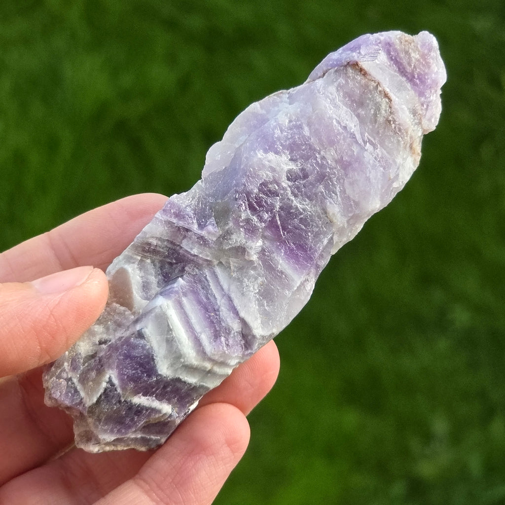 Der Chevron-Amethyst ist nach seinem charakteristischen Muster aus V-förmigen Streifen benannt, die auf seiner Oberfläche erscheinen. Chevron Amethyst ist eine Amethystsorte, die zur Familie der Quarze gehört.