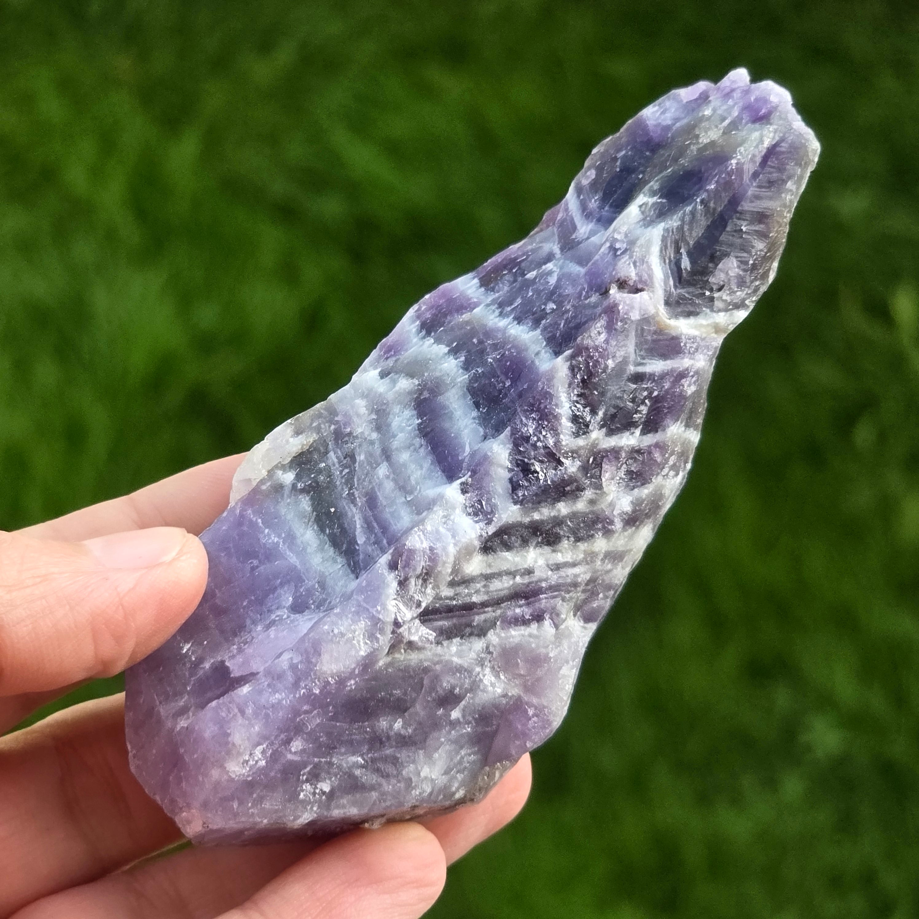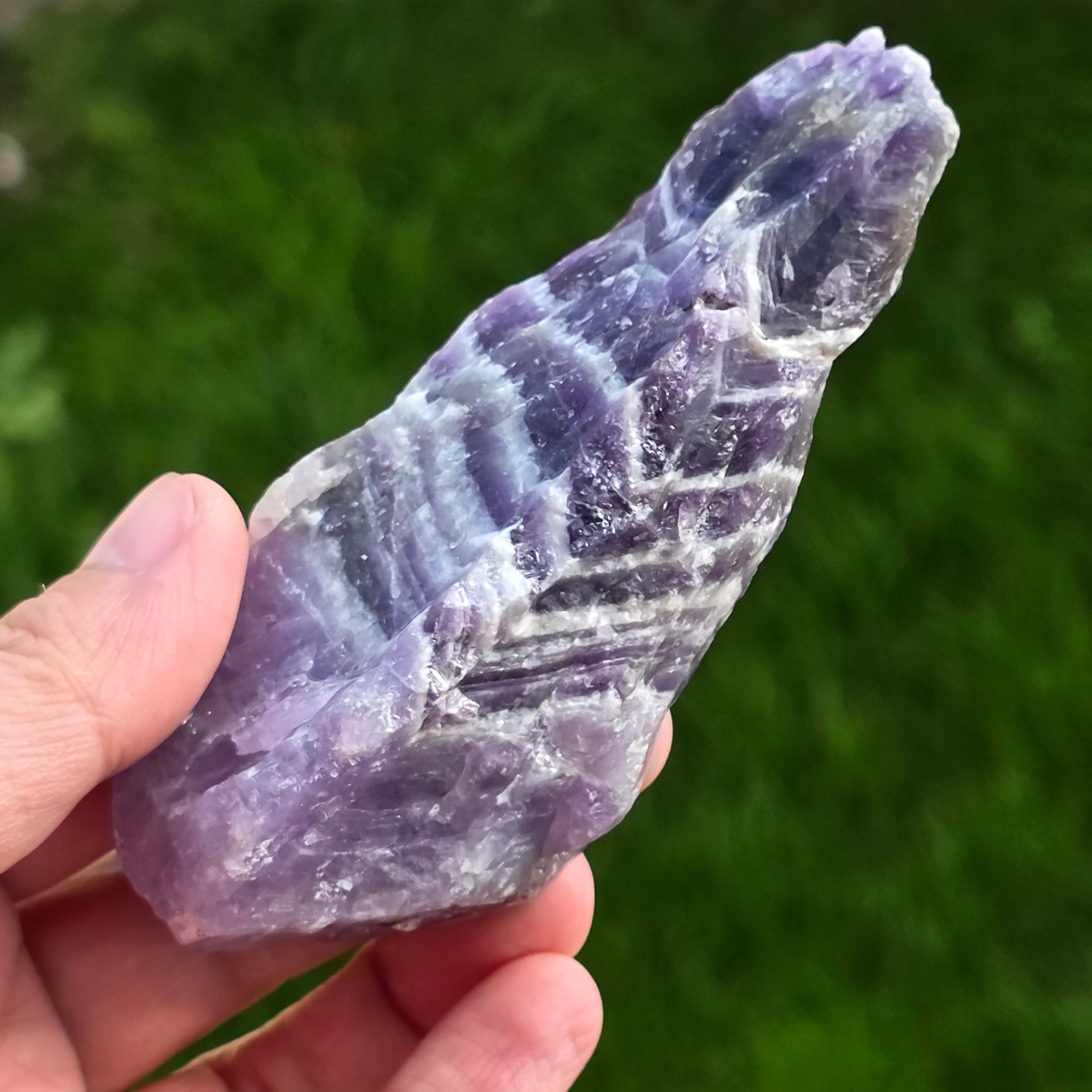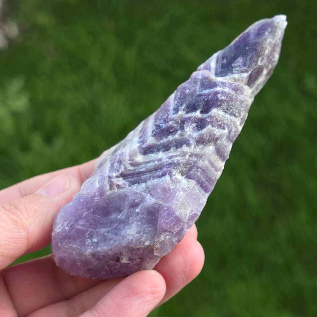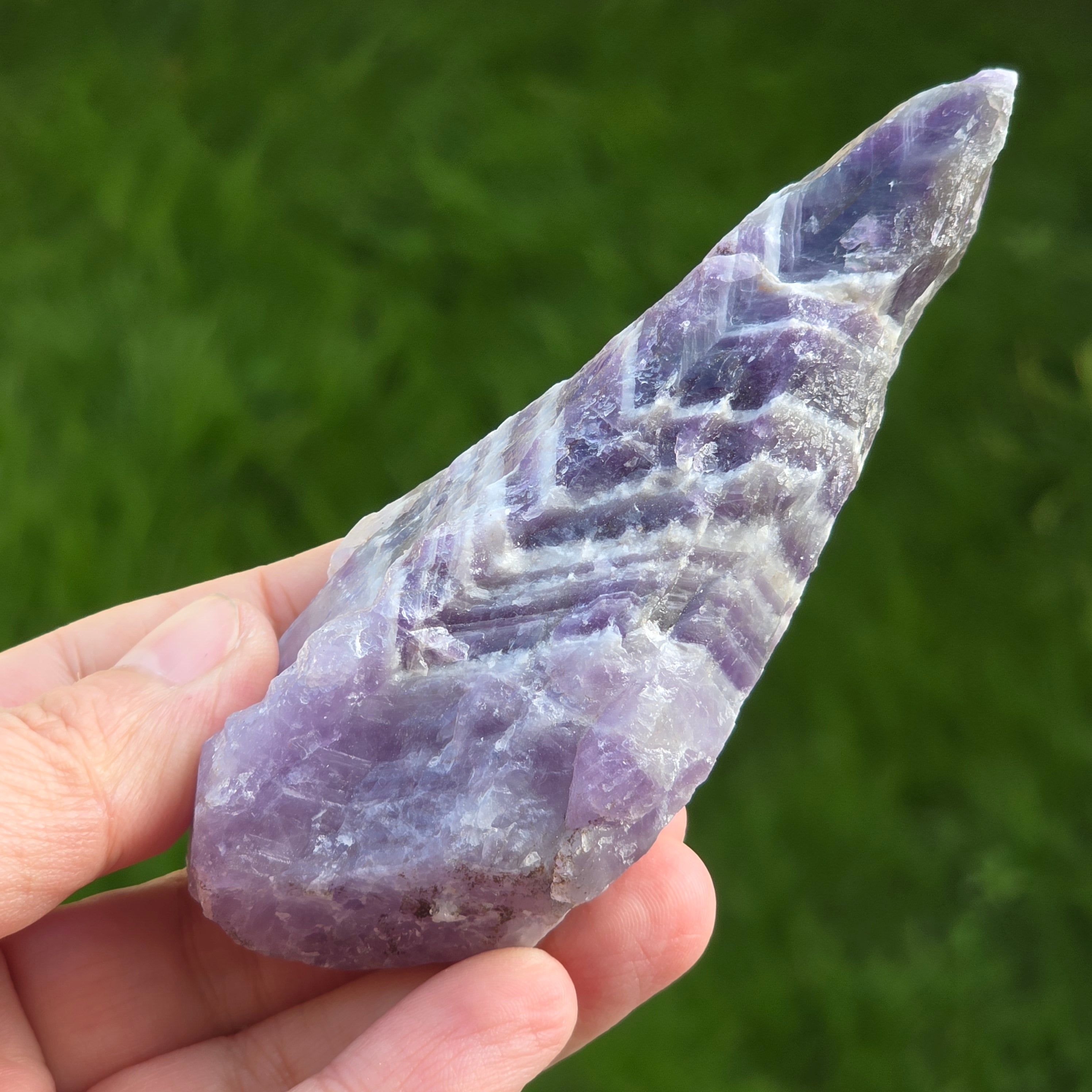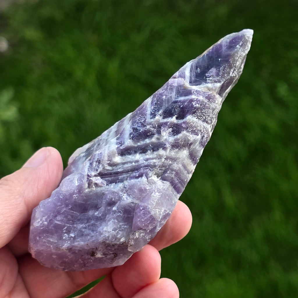 Das Chevron -Amethyst wird nach seinem charakteristischen V -verdrängten Streifenmodell benannt, das auf seiner Oberfläche erscheint. Amethyst Chevron ist eine Vielzahl von Amethyst, die Teil der Quarzfamilie ist.