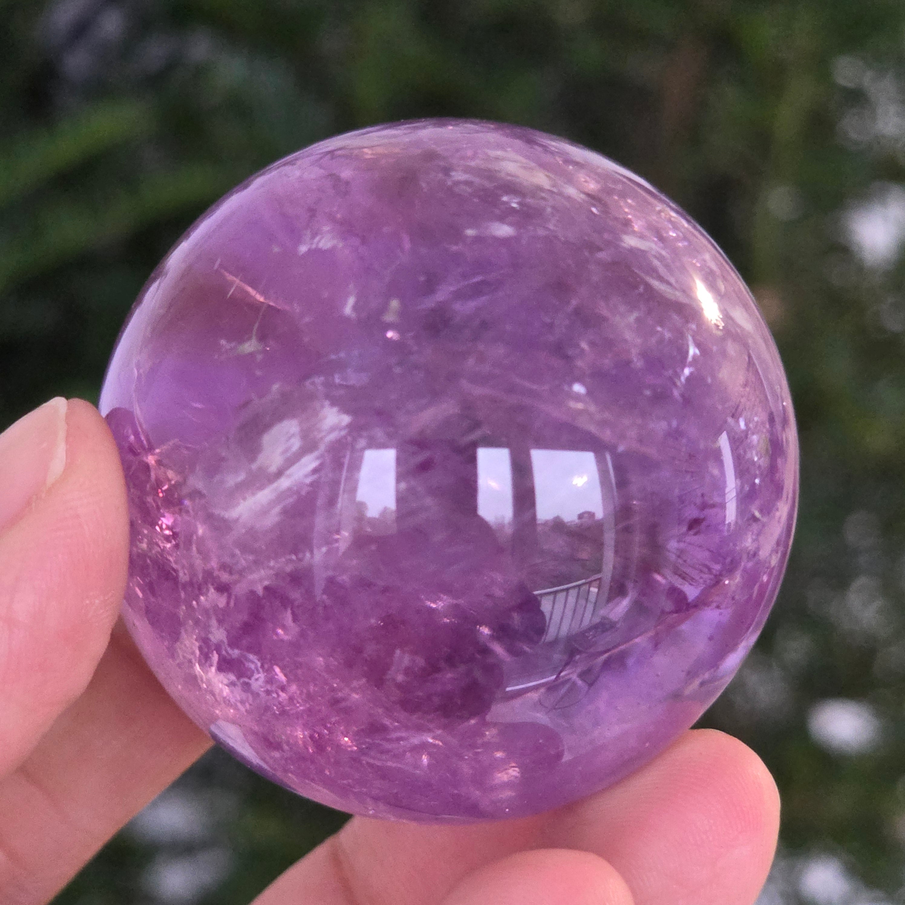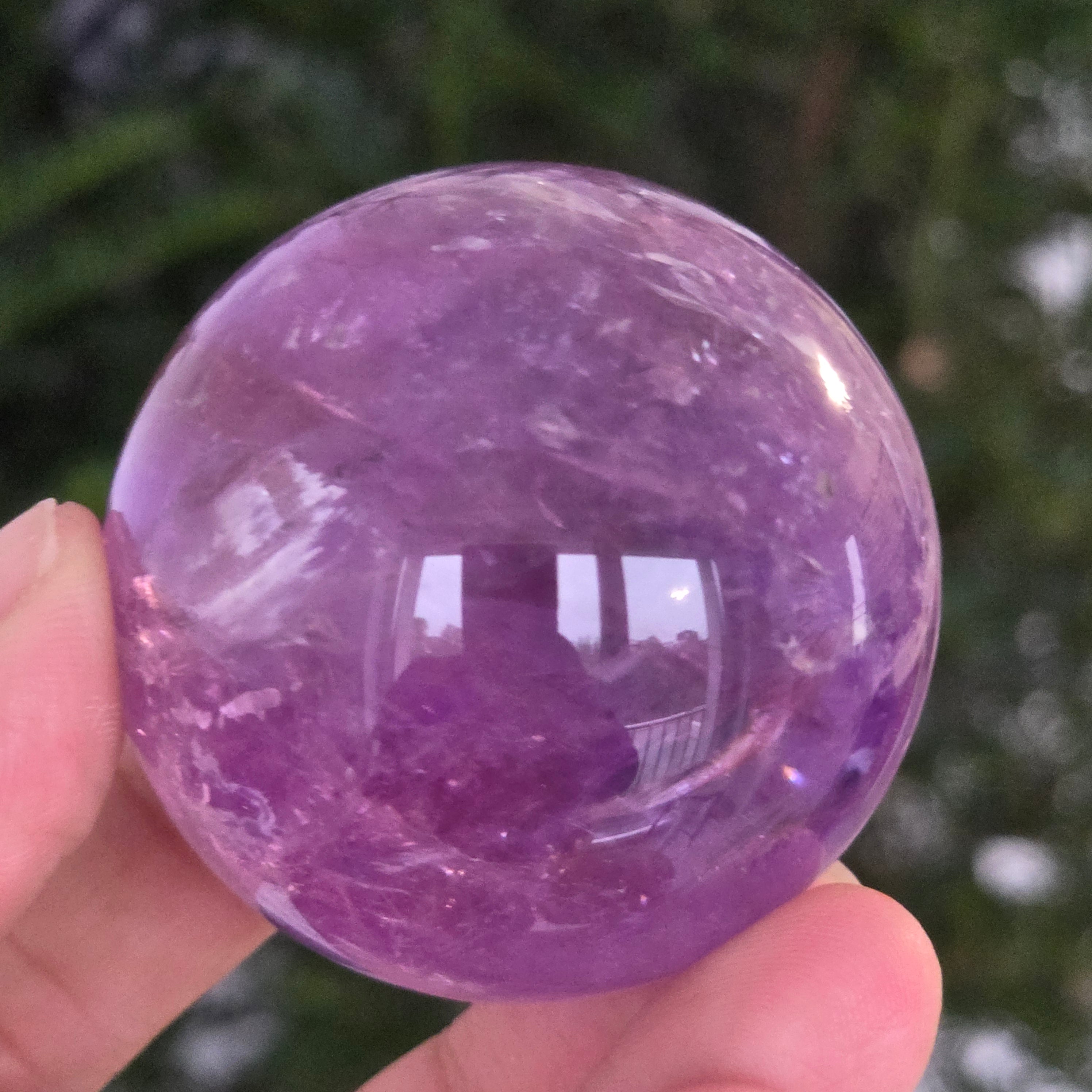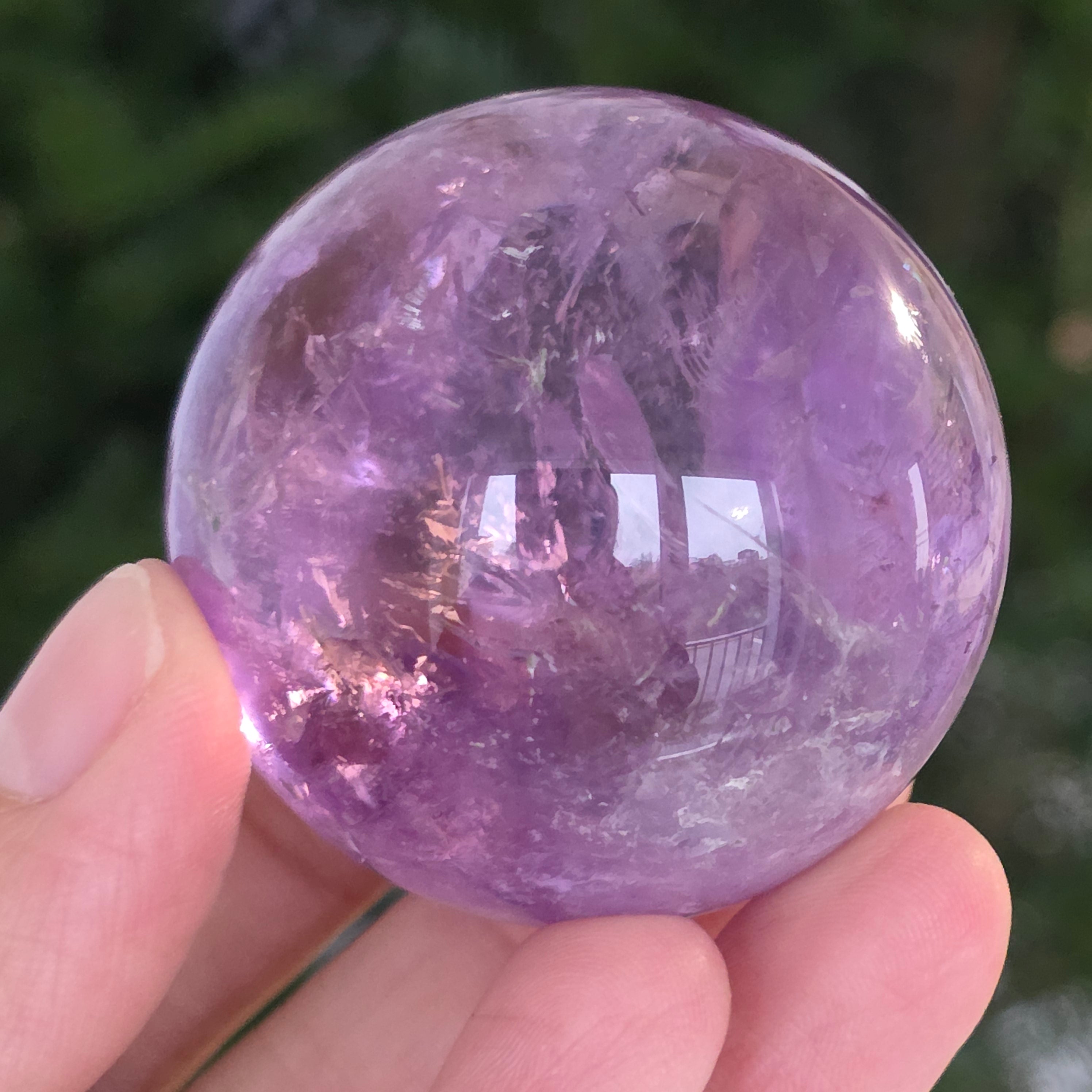 Eine Kugel, die die Essenz des Sonnenuntergangshimmels eingefangen zu haben scheint. Dieses hier Einzigartiges Stück AA-natürlicher Amethyst aus Brasilien, strahlt einen tiefen, durchscheinenden Glanz aus, mit königlichen Lila-, Flieder- und Lavendeltönen, die im Licht spielen. Die perfekt polierte Oberfläche bringt die Reinheit des Kristalls und die Feinheit seiner natürlichen Textur zur Geltung – ein mineralisches Juwel von klassischer und ausgewogener Schönheit.