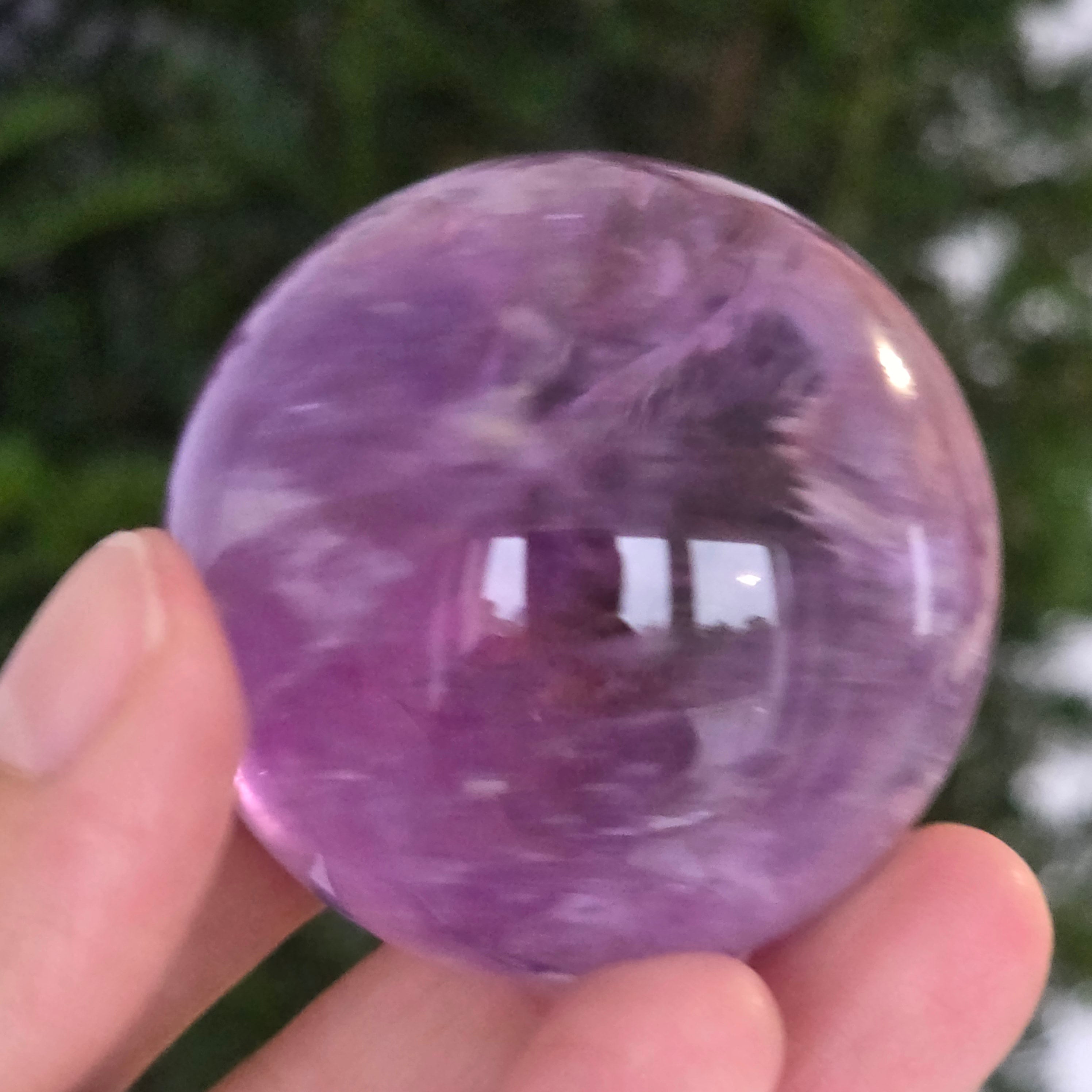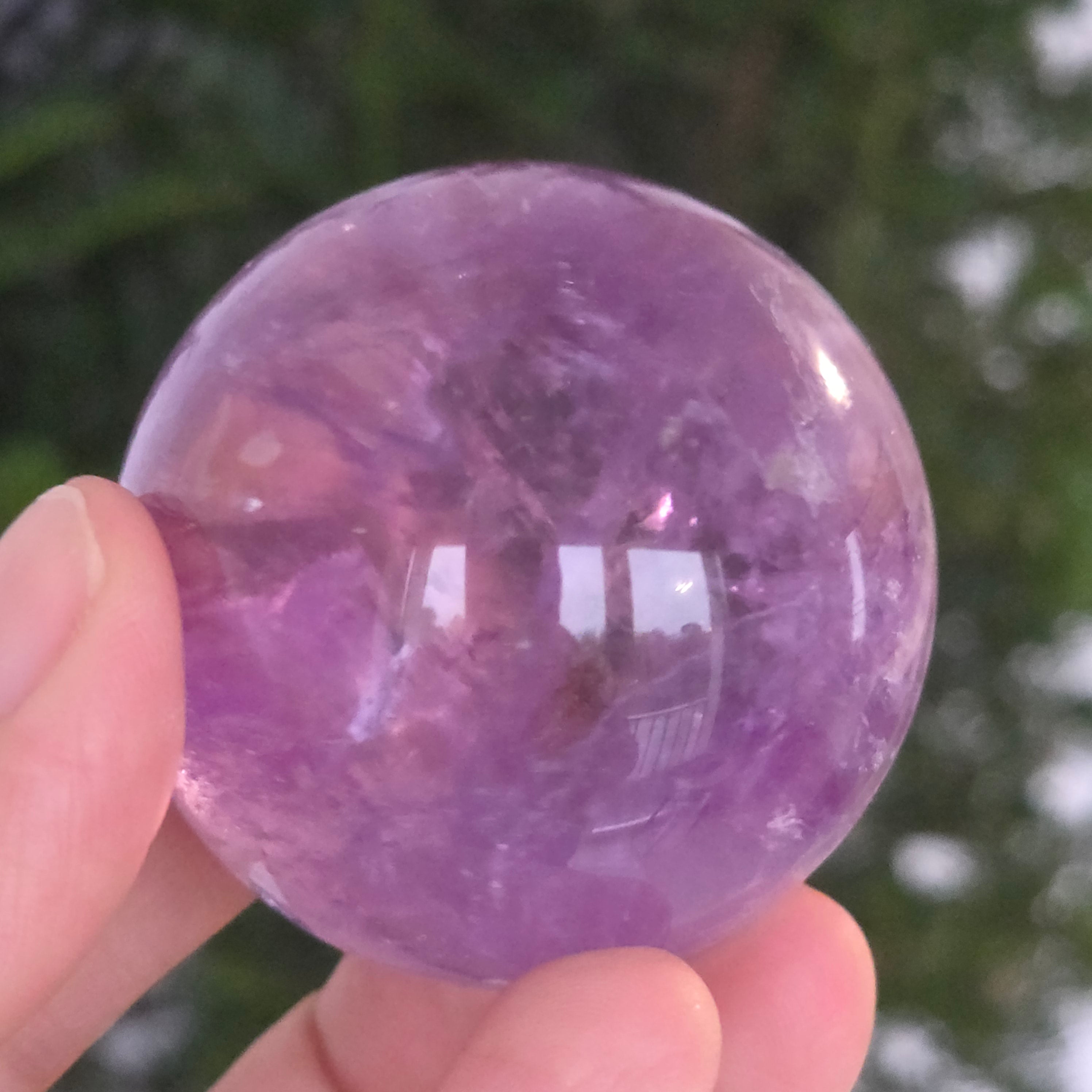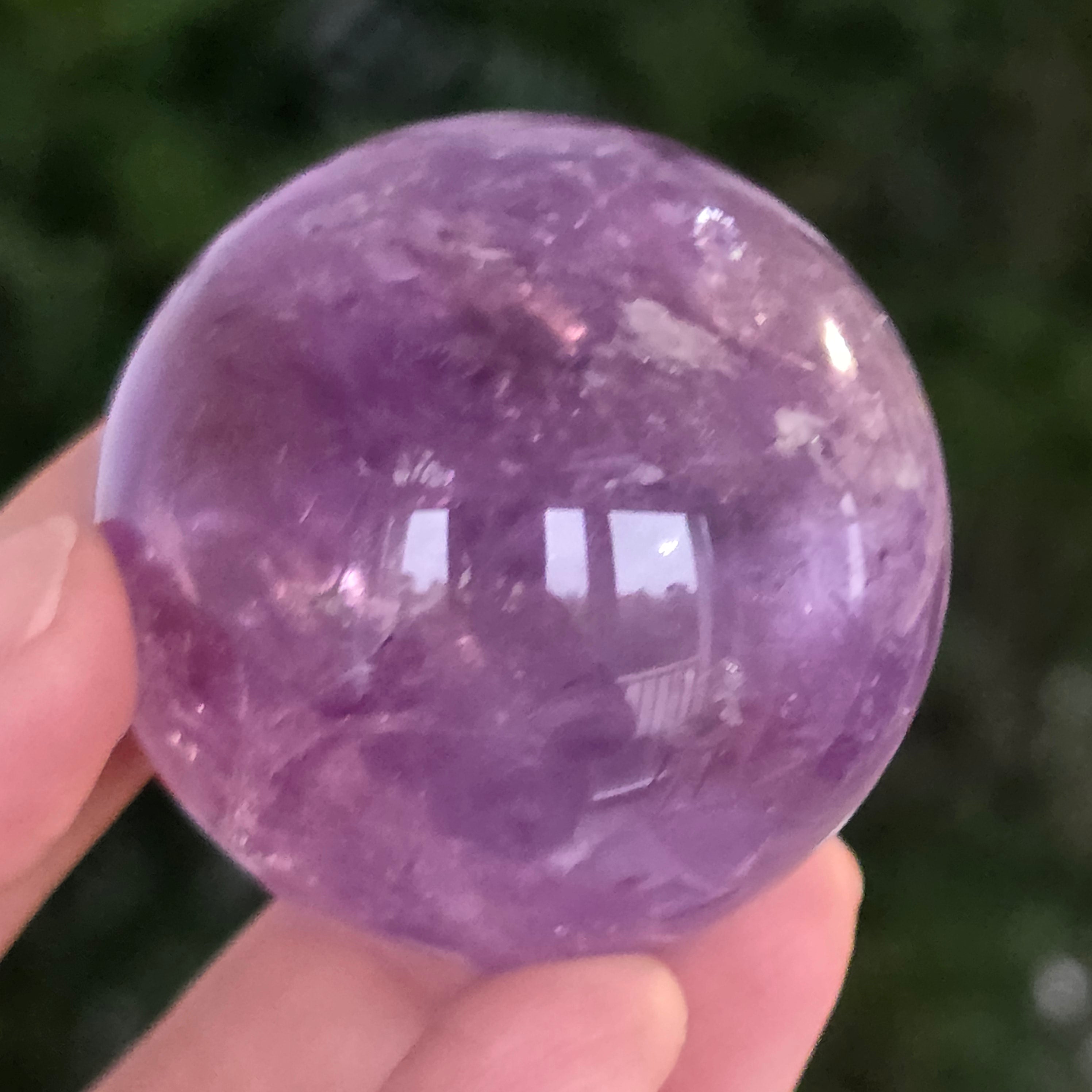 Eine Kugel, die die Essenz des Sonnenuntergangshimmels eingefangen zu haben scheint. Dieses hier Einzigartiges Stück AA-natürlicher Amethyst aus Brasilien, strahlt einen tiefen, durchscheinenden Glanz aus, mit königlichen Lila-, Flieder- und Lavendeltönen, die im Licht spielen. Die perfekt polierte Oberfläche bringt die Reinheit des Kristalls und die Feinheit seiner natürlichen Textur zur Geltung – ein mineralisches Juwel von klassischer und ausgewogener Schönheit.