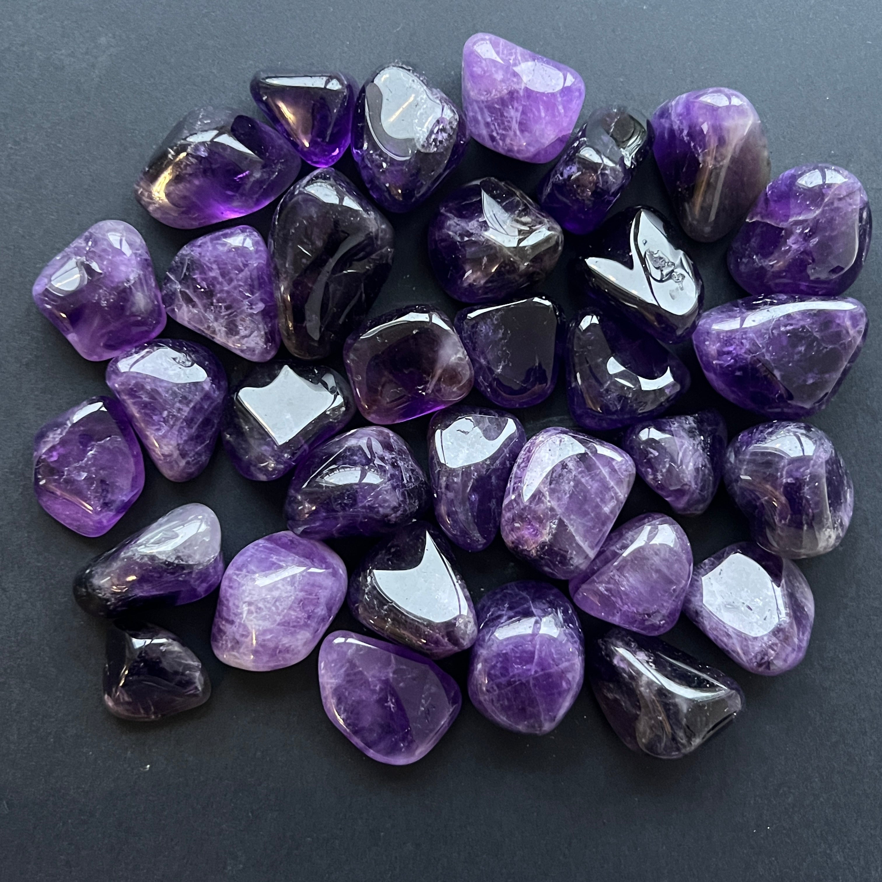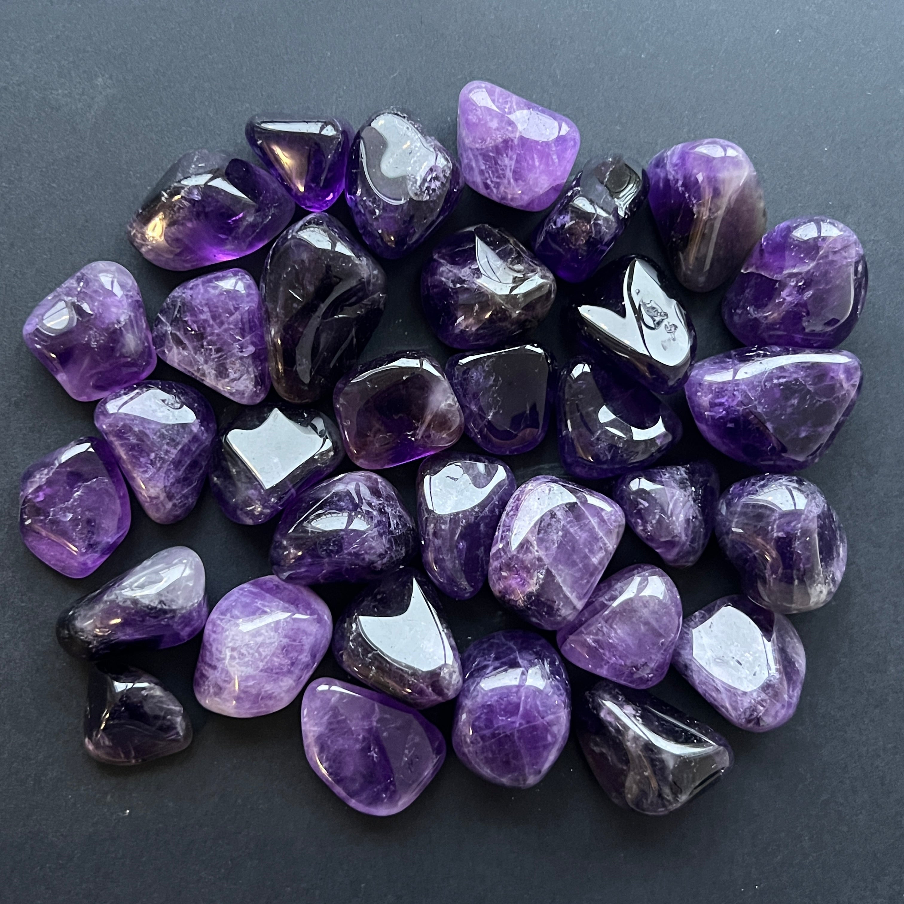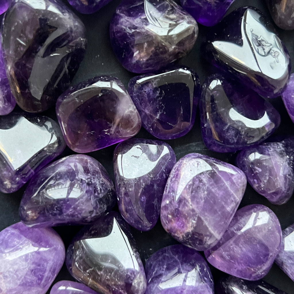 Der sambische Amethyst ist bekannt für seinen intensiven königlichen Purpurton, der oft durch durchscheinende Reflexe und zartes Schillern unterbrochen wird. Jeder gerollte Stein ist ein kleines Kunstwerk der Natur, poliert, um seine Farbtiefe und reine Energie hervorzuheben.