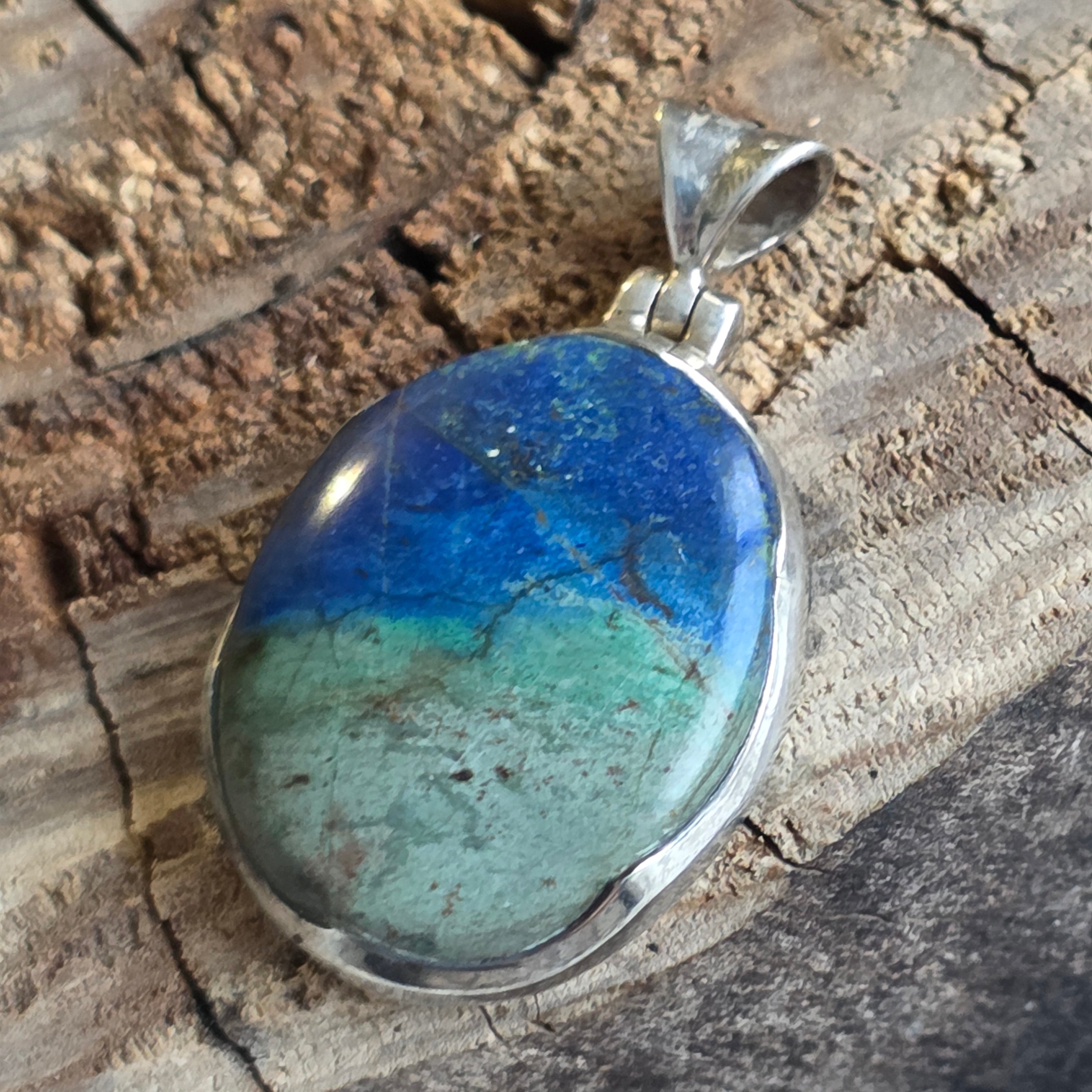 Dieser Anhänger aus 925er Silber mit Azurit-Malachit beeindruckt durch die natürliche Kombination intensiver Blau- und Grüntöne. Das einzigartige Muster des Steins erzeugt einen spektakulären visuellen Effekt, jedes Stück ist unterschiedlich.