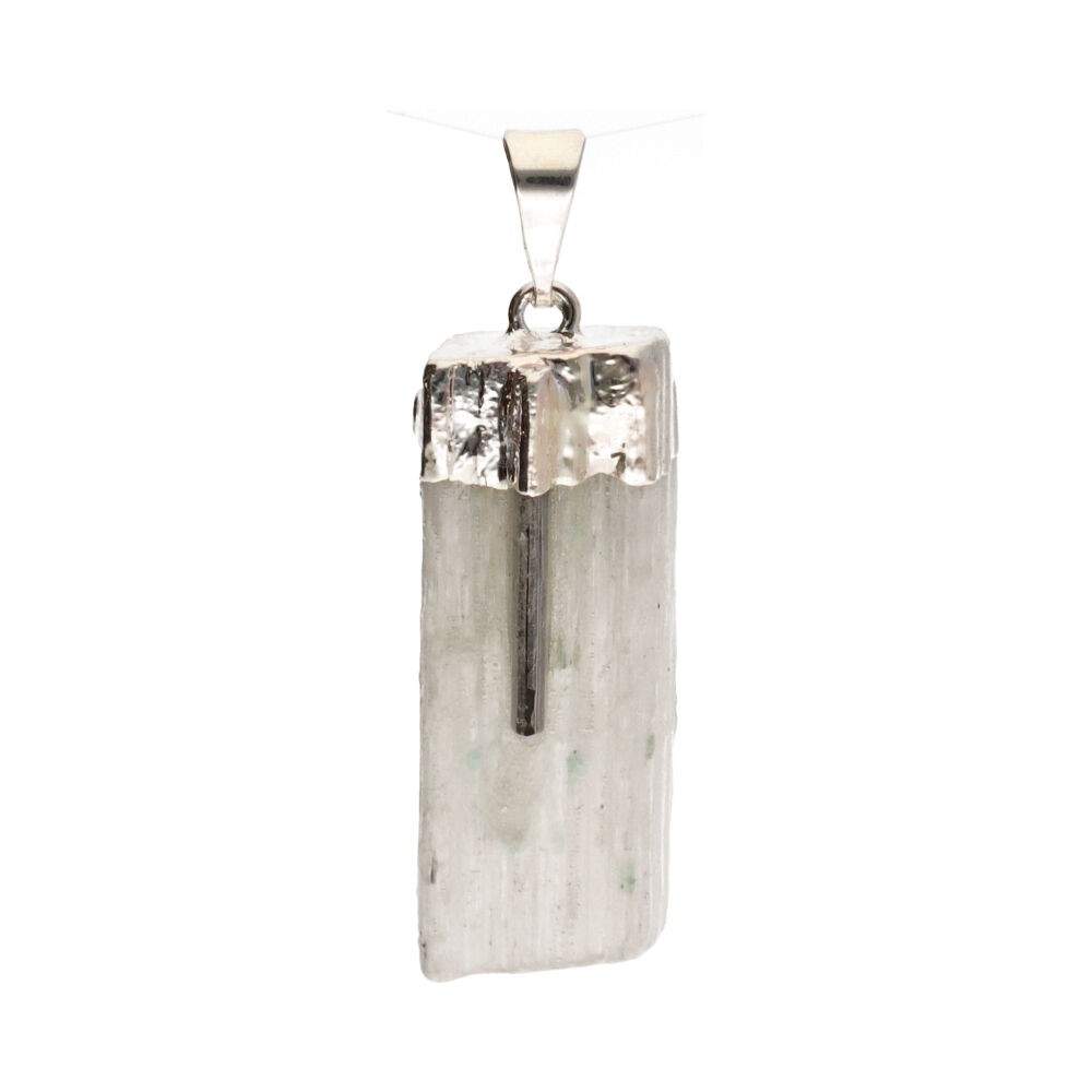 Der mit Silber aufgeblühte Anhänger aus Selenit mit Turmalin verbindet das reine Licht des Selenits mit der schützenden Energie des schwarzen Turmalins, verstärkt durch die Helligkeit des Silbers.