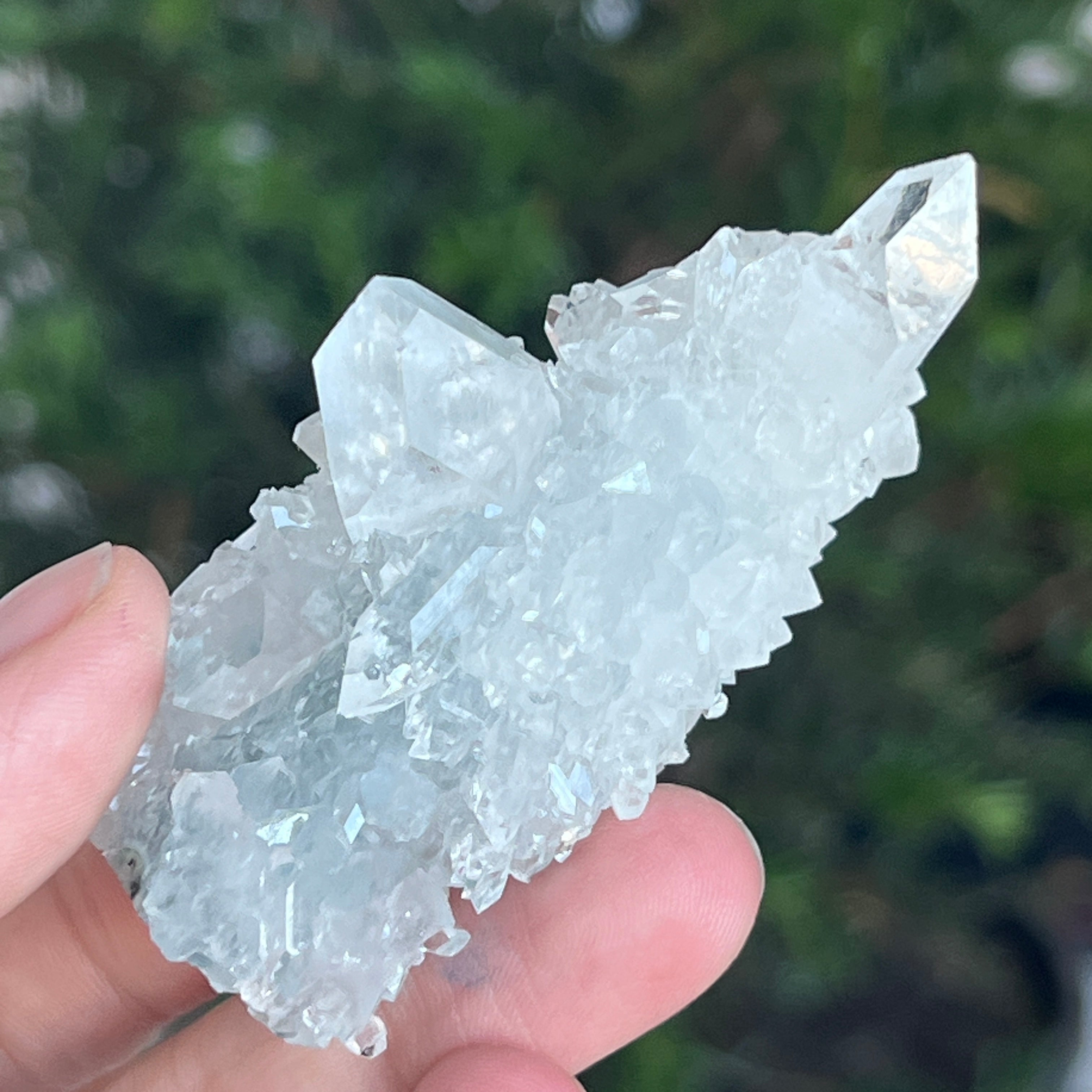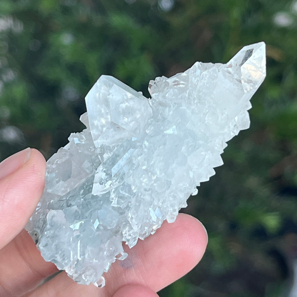 Der Apophyllit kristallisiert im tetragonalen System, und seine Kristalle können pyramidenförmig oder prismatisch sein. Diese kristallographische Struktur verleiht ihm ein klar definiertes Aussehen, das häufig flache und glatte Facetten aufweist.
