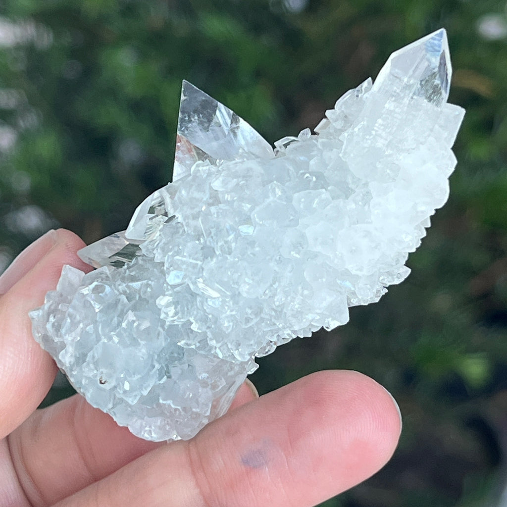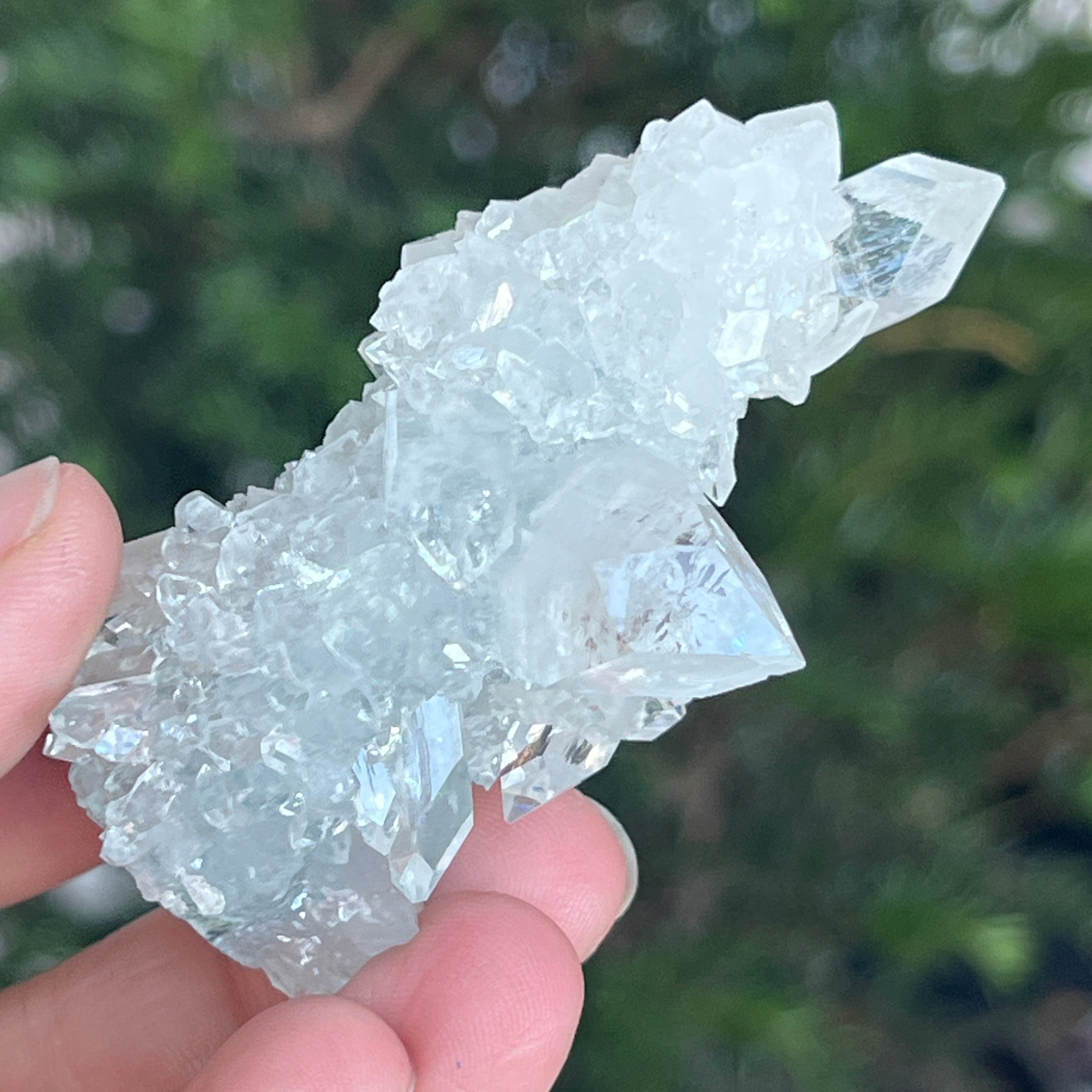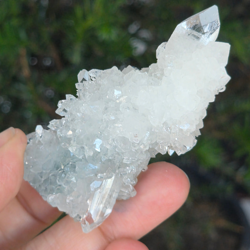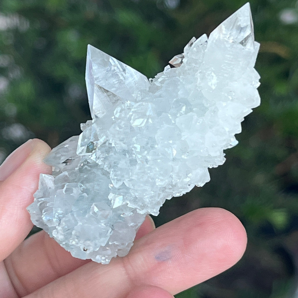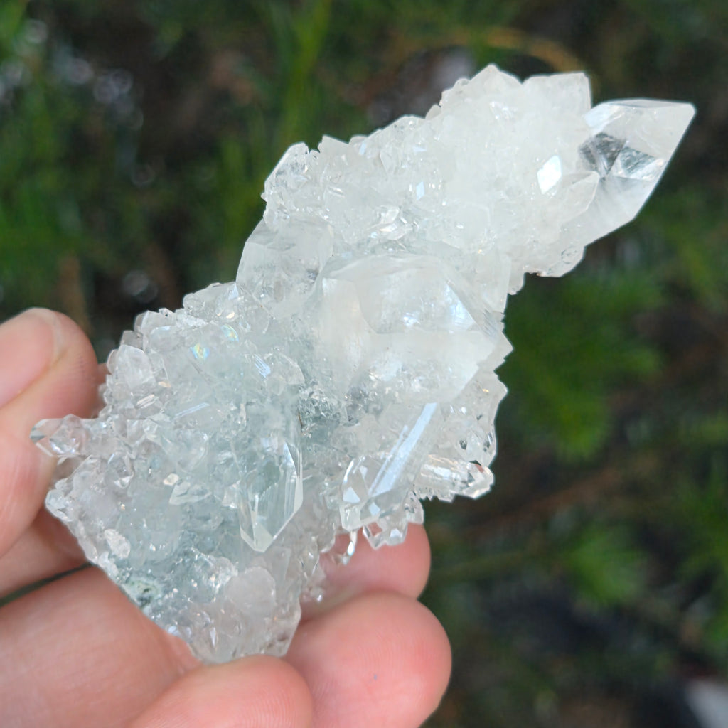 Apophyllit ist ein Mineral aus der Familie der Tektosilikate mit einer chemischen Hauptzusammensetzung aus Kaliumsilikat und hydratisiertem Kalzium. Aufgrund seines Wassergehalts kann Apophyllit eine bemerkenswerte Klarheit und Transparenz aufweisen, und manchmal reflektieren seine Oberflächen das Licht außergewöhnlich, wodurch ein spiegelähnlicher Effekt entsteht.