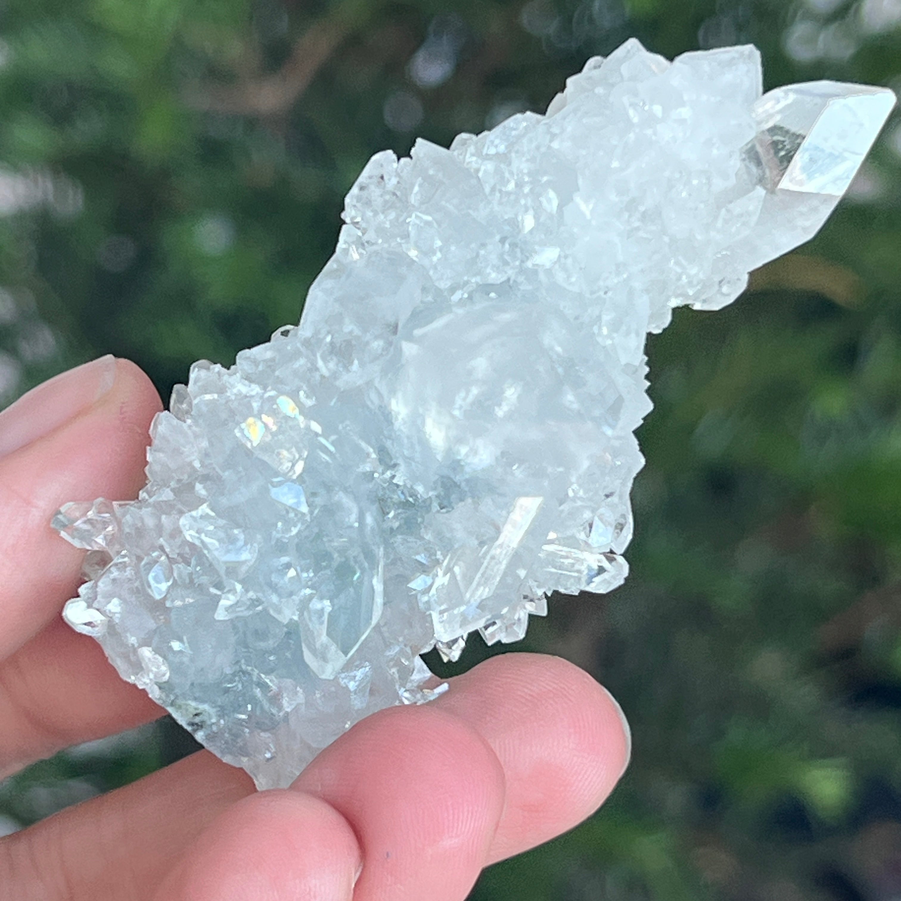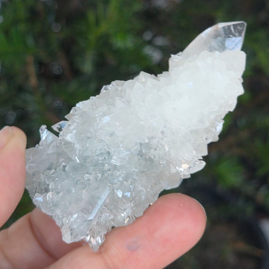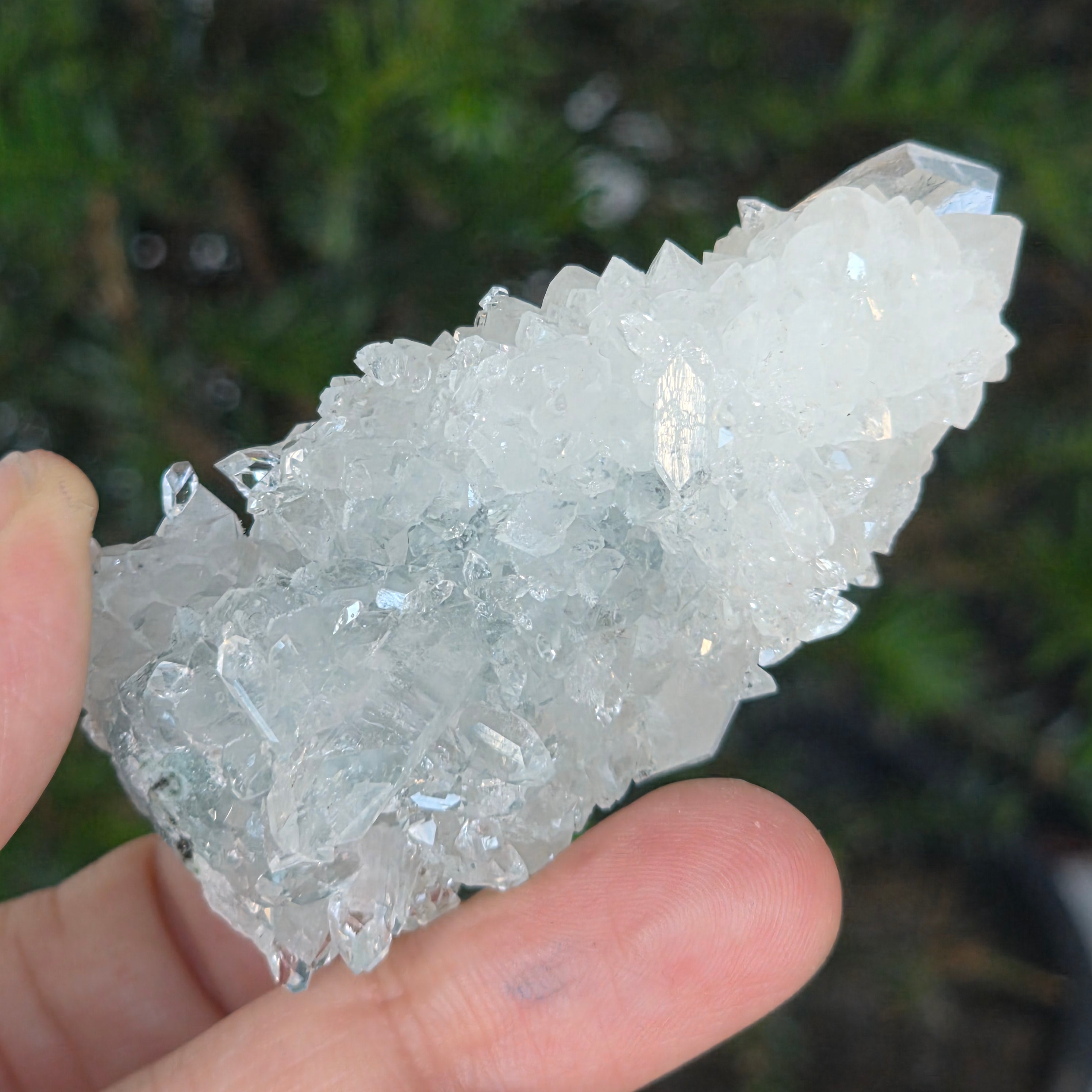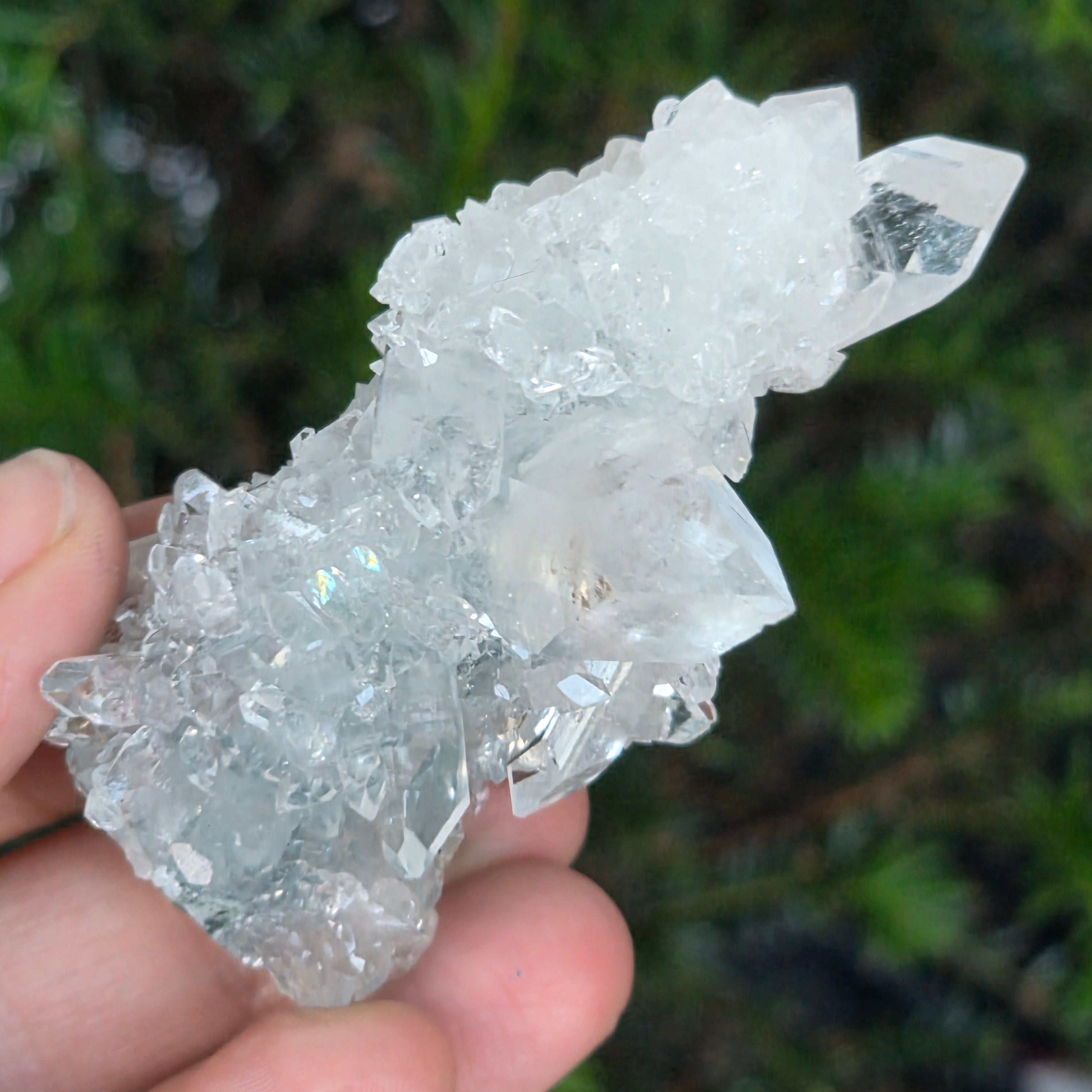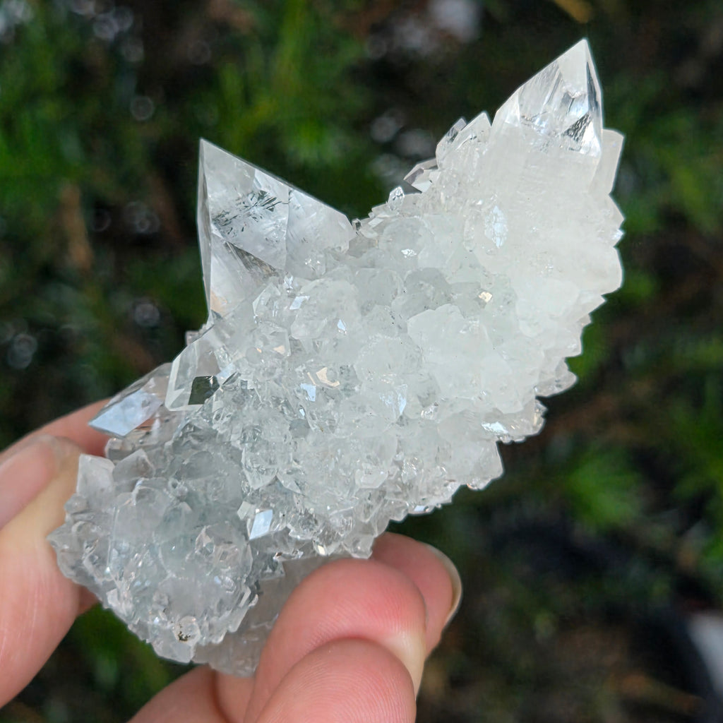 Apophyllit ist ein Mineral aus der Familie der Tektosilikate mit einer chemischen Hauptzusammensetzung aus Kaliumsilikat und hydratisiertem Kalzium. Aufgrund seines Wassergehalts kann Apophyllit eine bemerkenswerte Klarheit und Transparenz aufweisen, und manchmal reflektieren seine Oberflächen das Licht außergewöhnlich, wodurch ein spiegelähnlicher Effekt entsteht.
