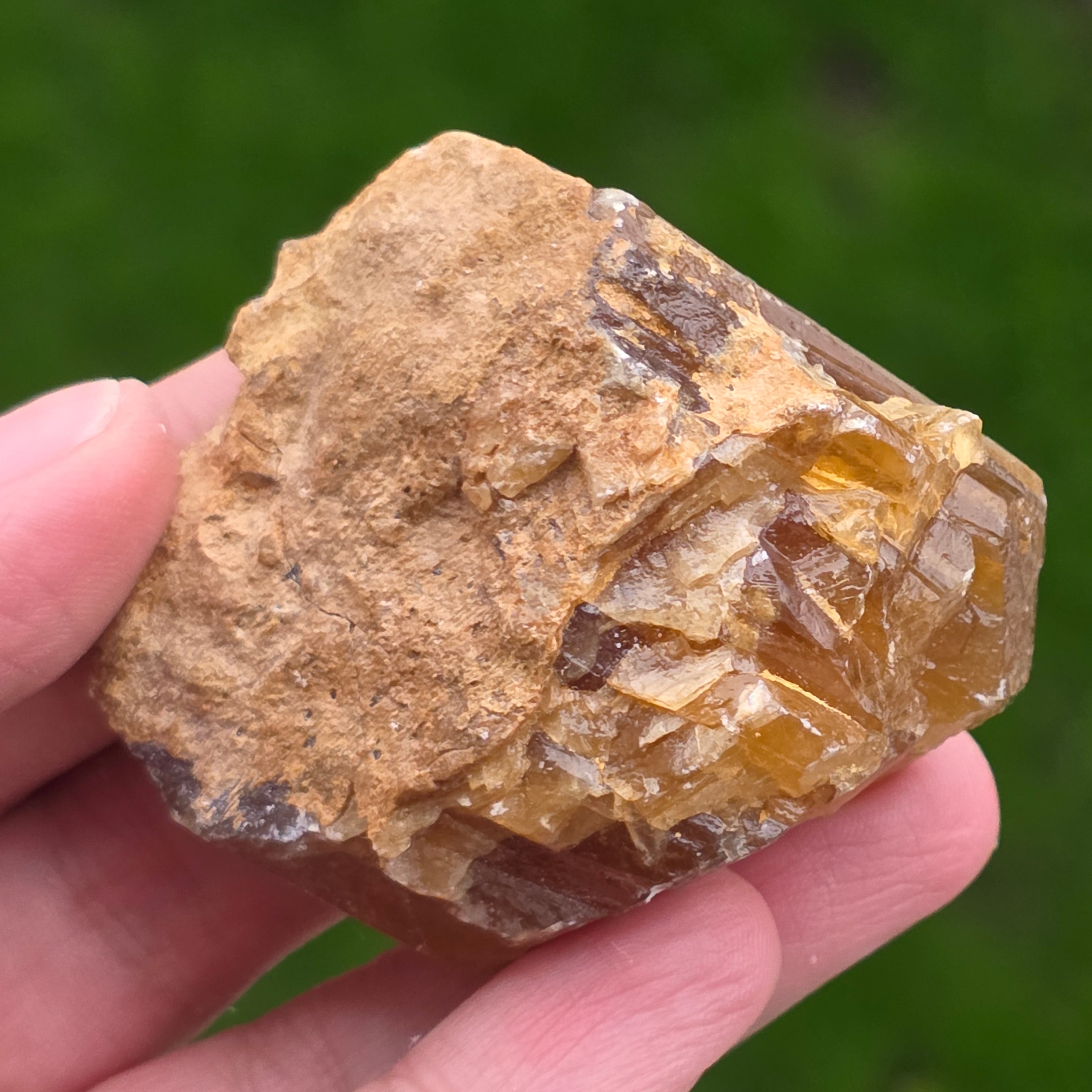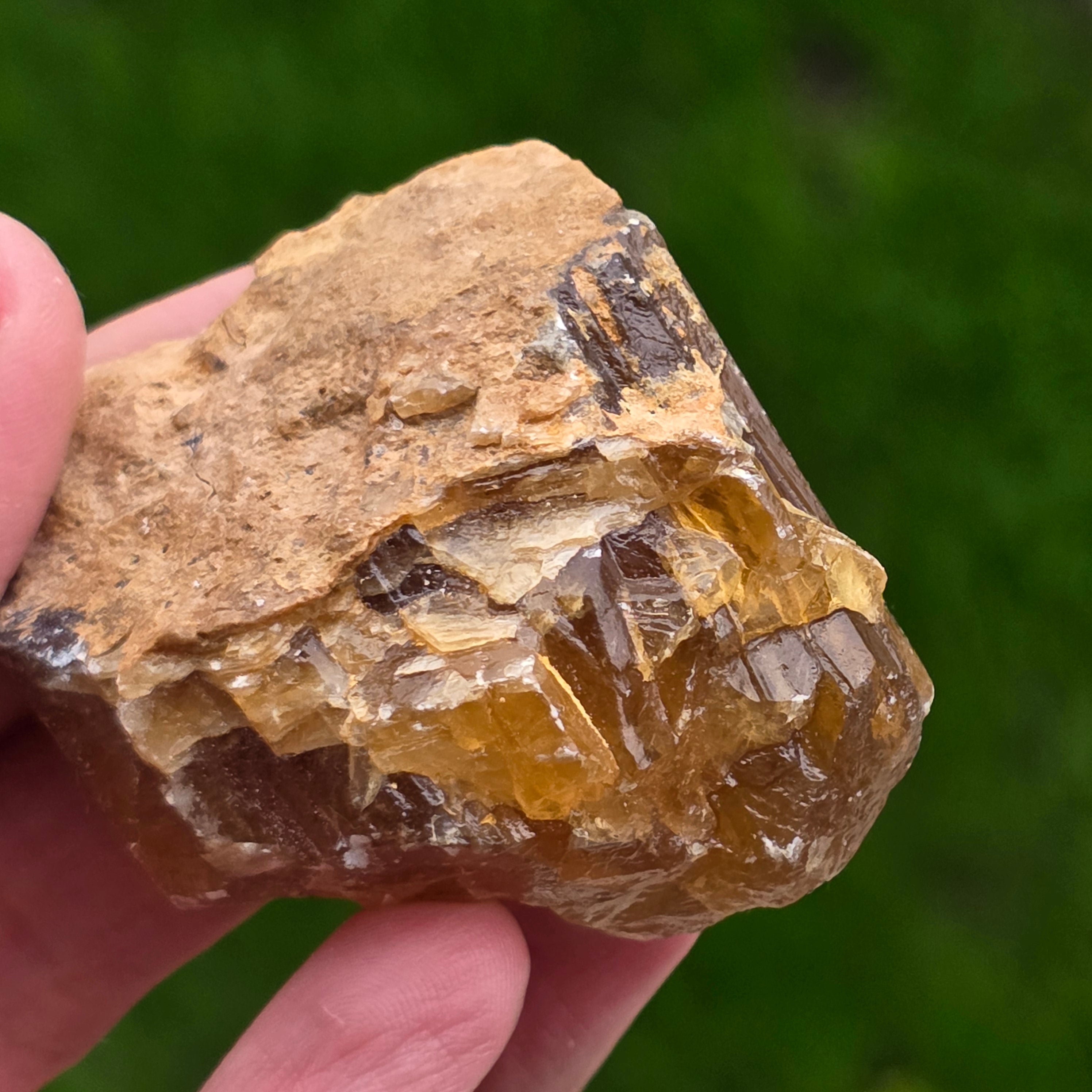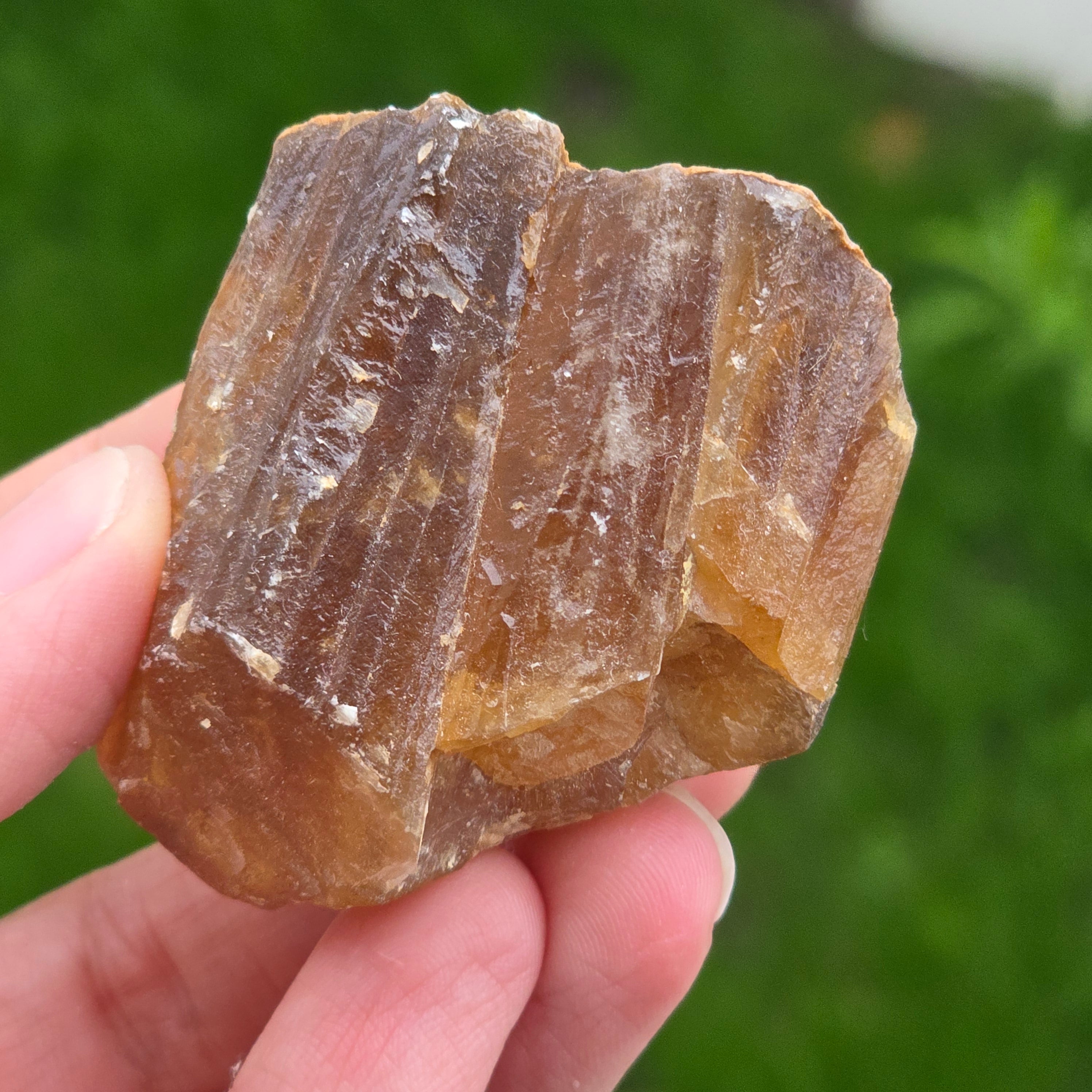 Namibischer Honigaragonit ist eine Aragonitart mit warmen Gelb-, Orange- und Hellbrauntönen, die dem Honig ähneln, daher der Name. Aragonit ist ein Mineral aus der Carbonatfamilie mit orthorhombischer Kristallstruktur, das chemisch dem Calcit ähnelt, sich jedoch in der Kristallisation unterscheidet.