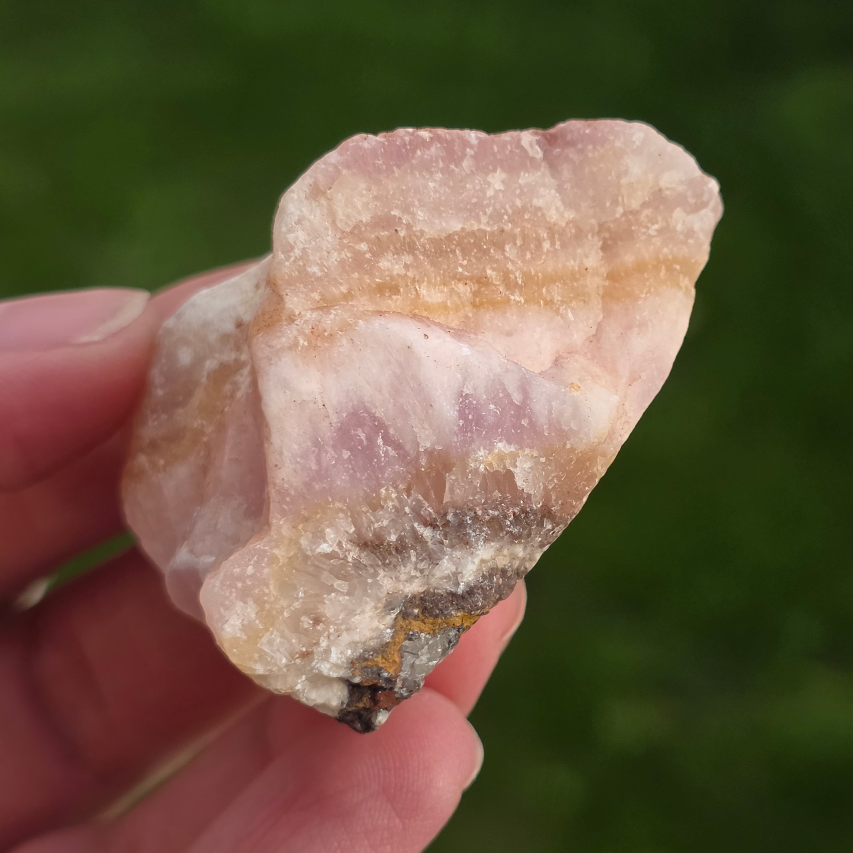 Rosa Aragonit ist ein seltener Halbedelstein. Es besteht aus Kalziumkarbonat und hat aufgrund von Eisenverunreinigungen eine rosa-orange Farbe.