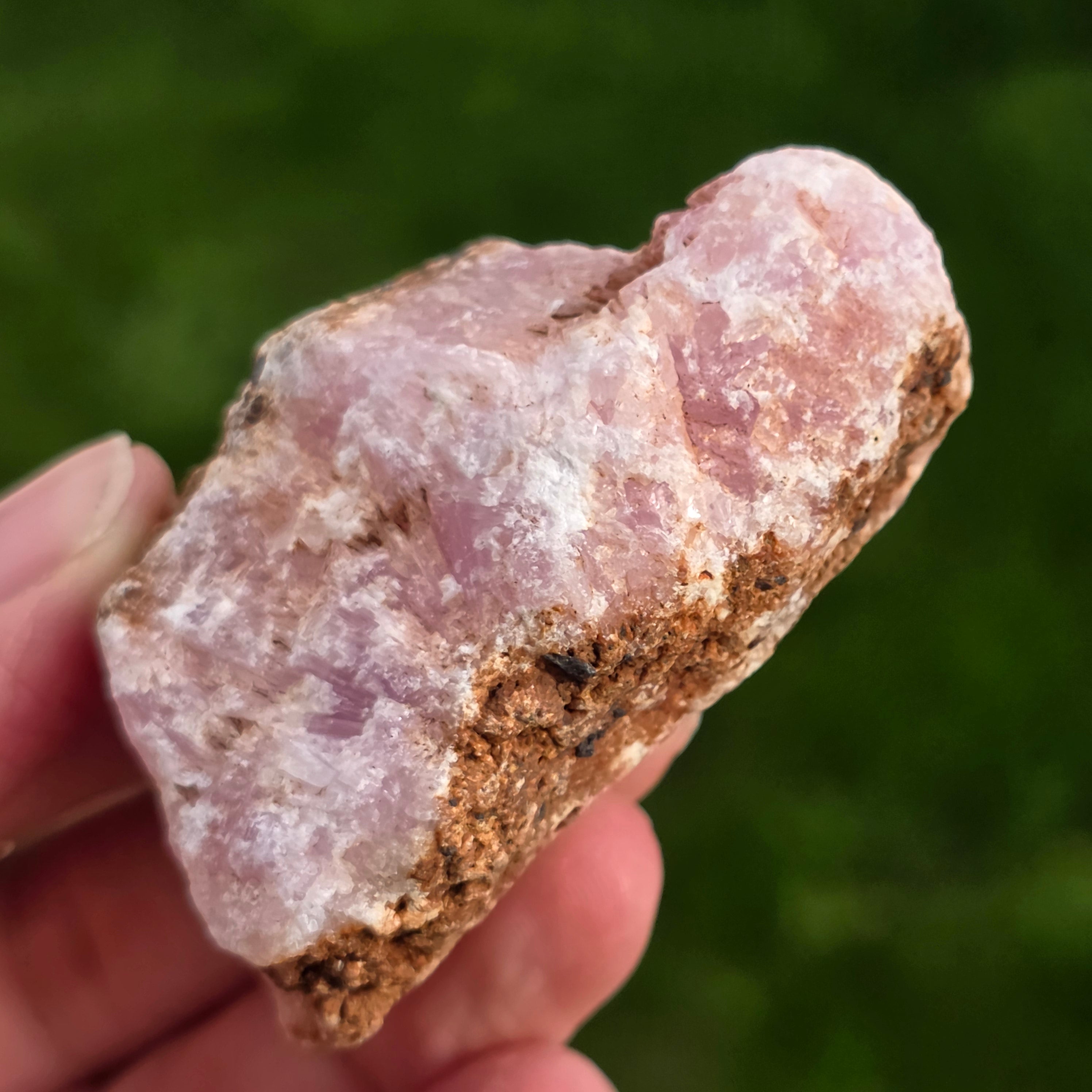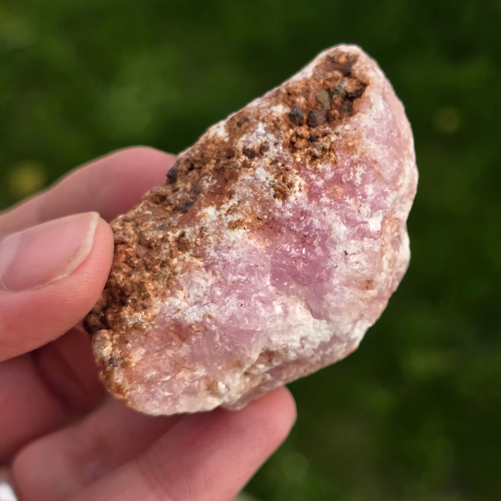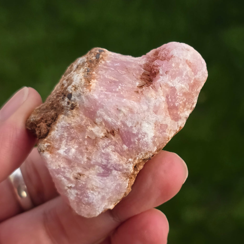 Rosa Aragonit ist ein seltener Halbedelstein. Es besteht aus Kalziumkarbonat und hat aufgrund von Eisenverunreinigungen eine rosa-orange Farbe.