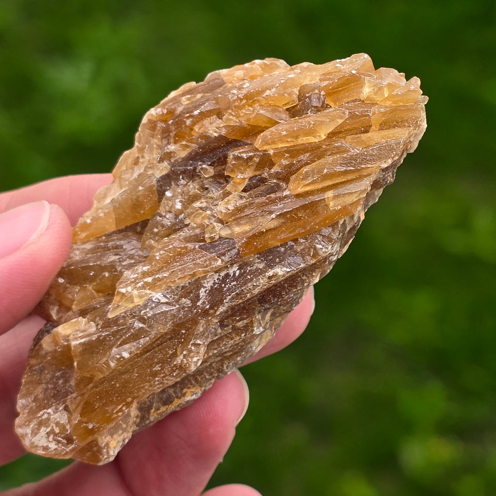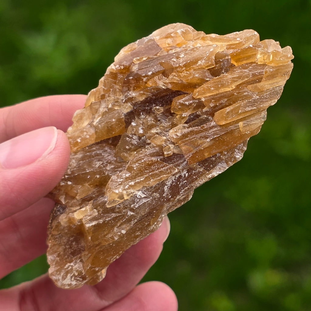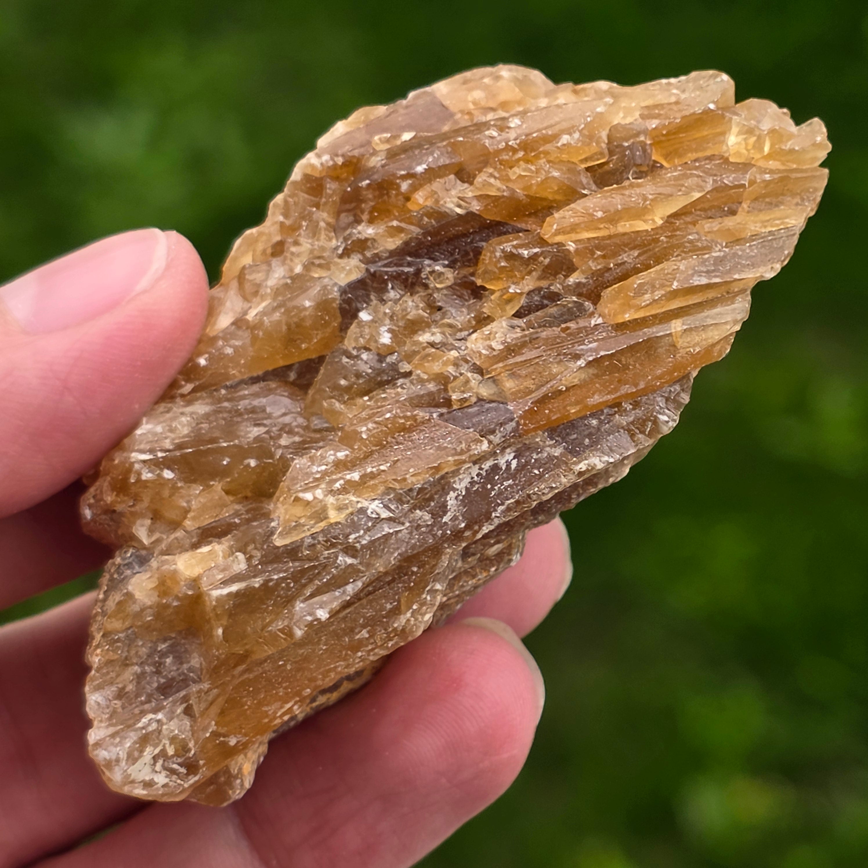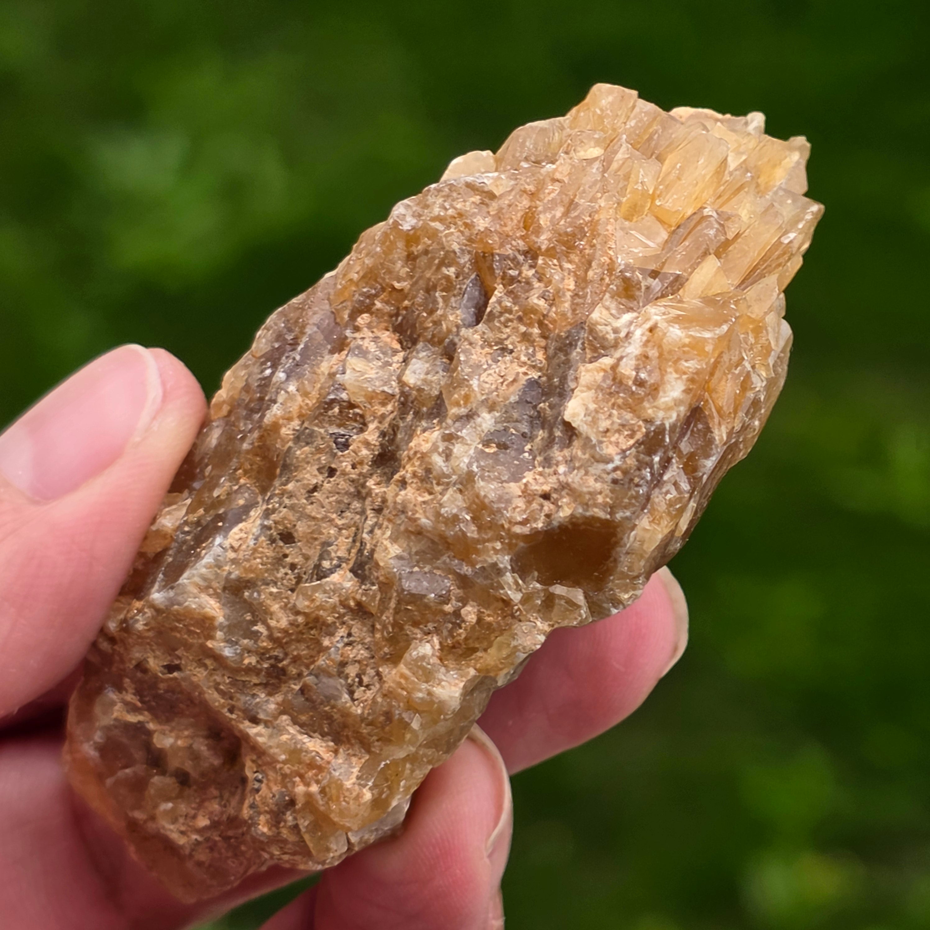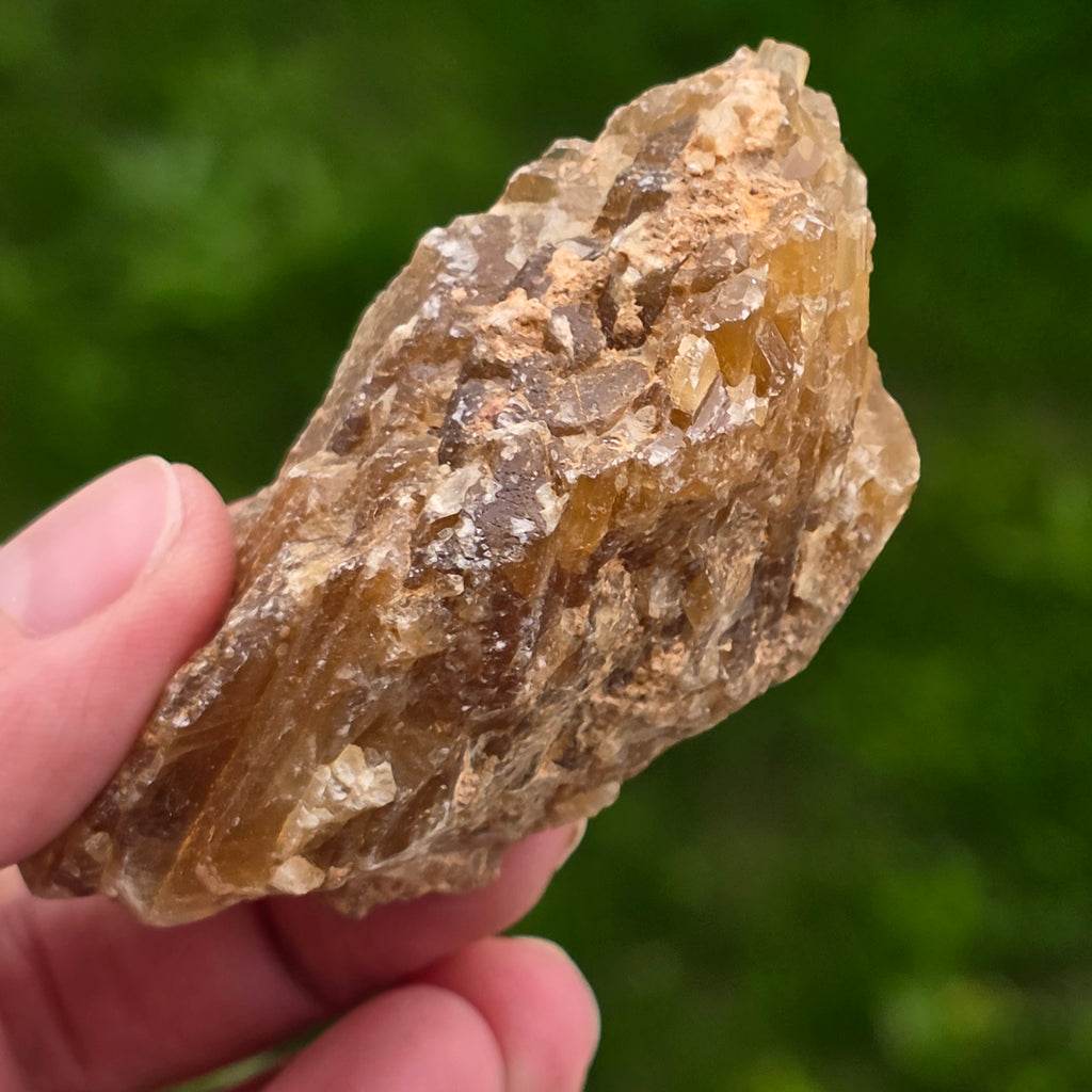 Namibischer Honigaragonit ist eine Aragonitart mit warmen Gelb-, Orange- und Hellbrauntönen, die dem Honig ähneln, daher der Name. Aragonit ist ein Mineral aus der Carbonatfamilie mit orthorhombischer Kristallstruktur, das chemisch dem Calcit ähnelt, sich jedoch in der Kristallisation unterscheidet.