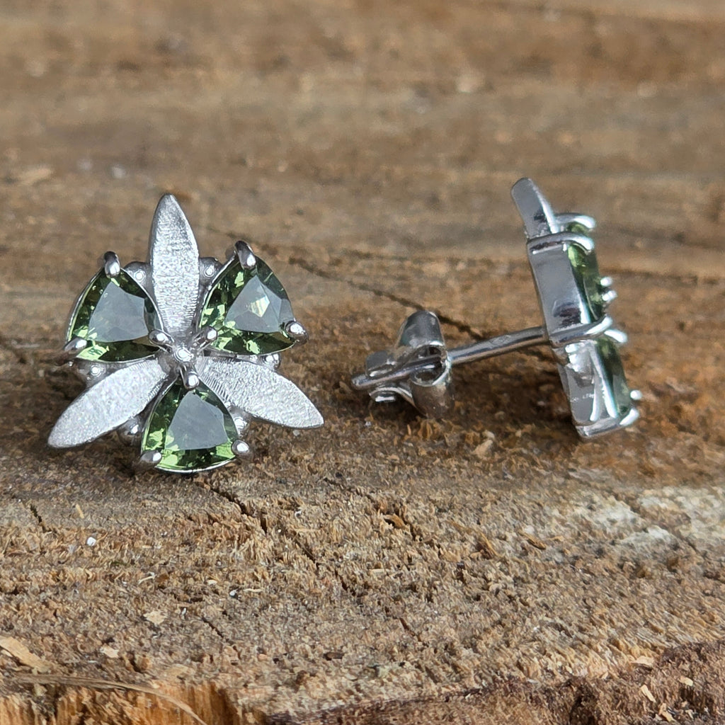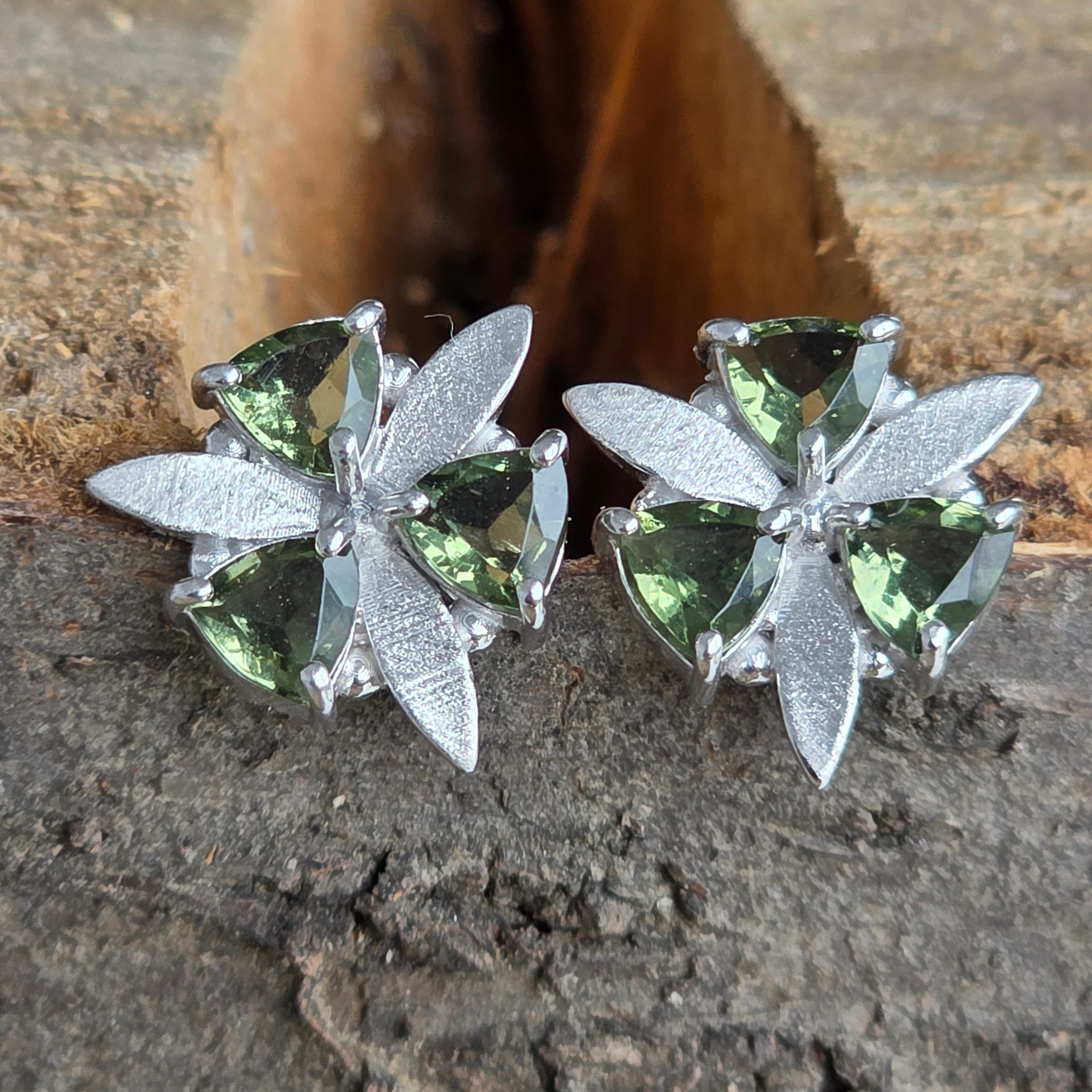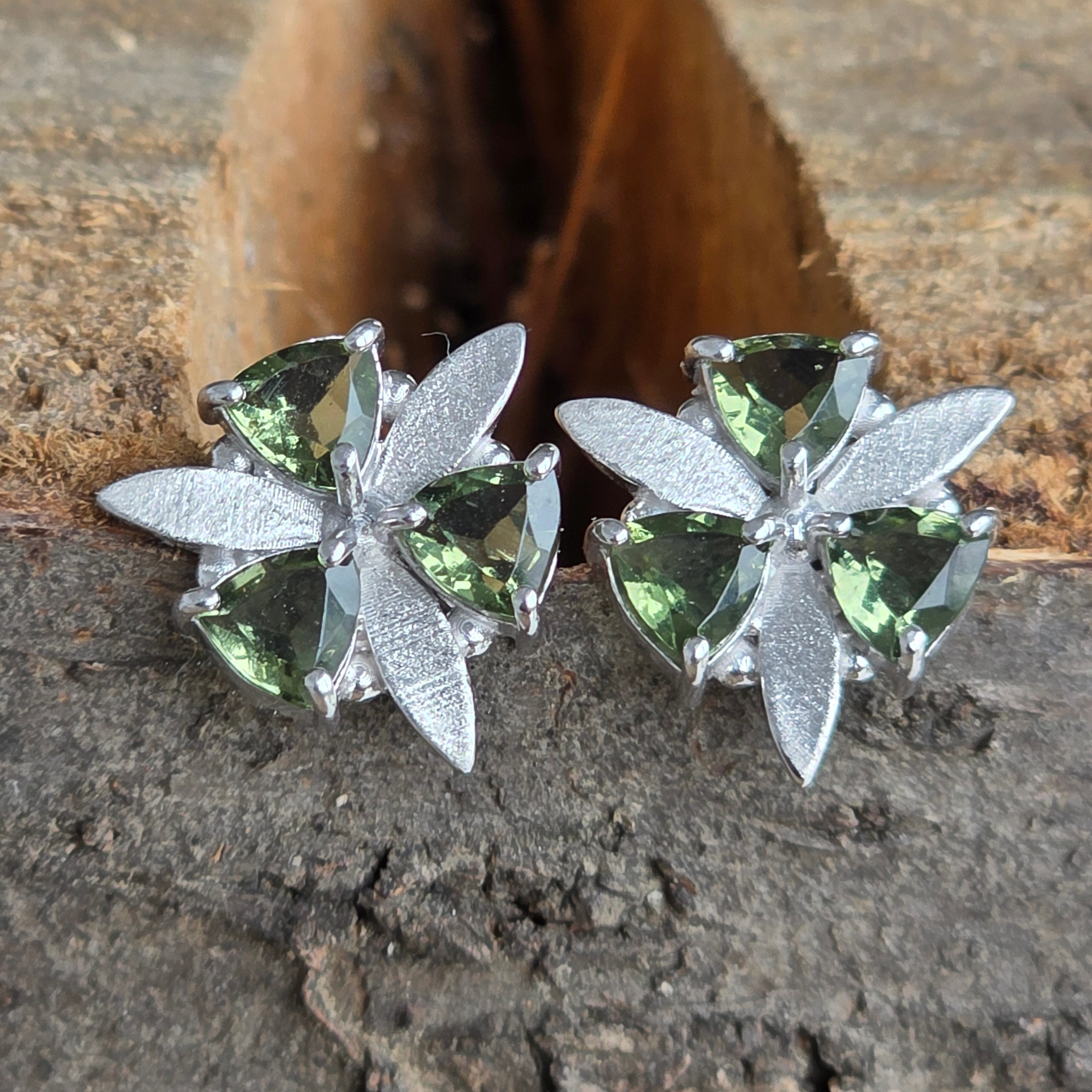 Diese eleganten 925 Silberohrringe bringen die natürliche Schönheit des Formens zu einer blumigen Inspiration. Jeder Ohrring besteht aus drei facettierten Moldawiensteinen, die harmonisch wie die Blütenblätter einer seltenen Blume angeordnet sind, die die Delikatesse des Designs mit der einzigartigen Steinschwingung kombiniert.