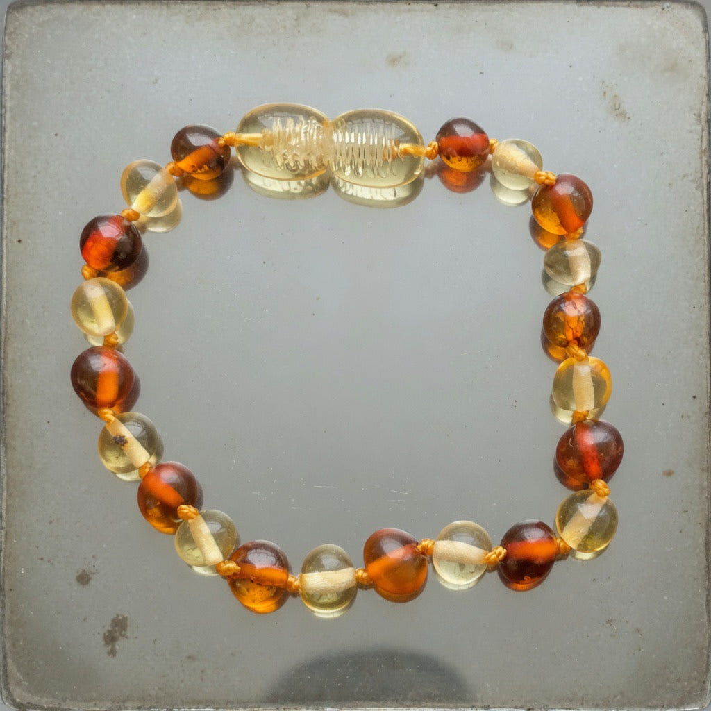 Bernstein ist bekannt für seine beruhigenden Eigenschaften und zur Linderung von Zahnschmerzen bei Kindern während der Zahnungszeit. Wenn er als Halskette oder Armband getragen wird, setzt der Bernstein ein natürliches Öl frei, das als Bernsteinsäure bekannt ist und dem eine schmerzlindernde und entzündungshemmende Wirkung zugeschrieben wird.
