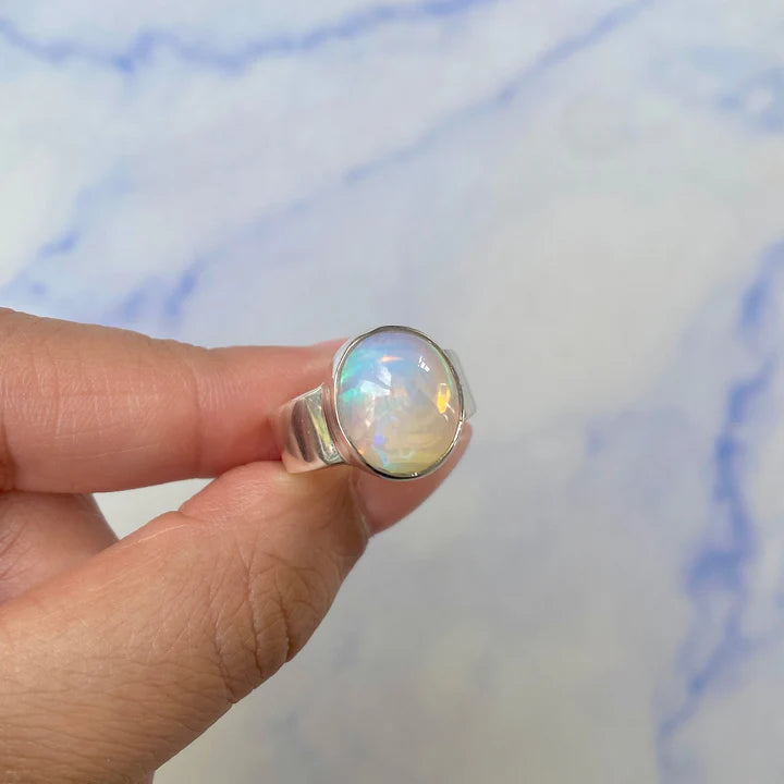Ein eleganter und verfeinerter Ring, gefertigt aus Silber 925, mit einem natürlichen Stein aus äthiopischem Opal, bekannt für seine irisierenden Reflexe in Grün-, Rot- und Blautönen. Das minimalistische Plain-Draht-Fassung -Design lässt den Stein im Mittelpunkt stehen und fängt das Licht aus jedem Blickwinkel ein.
