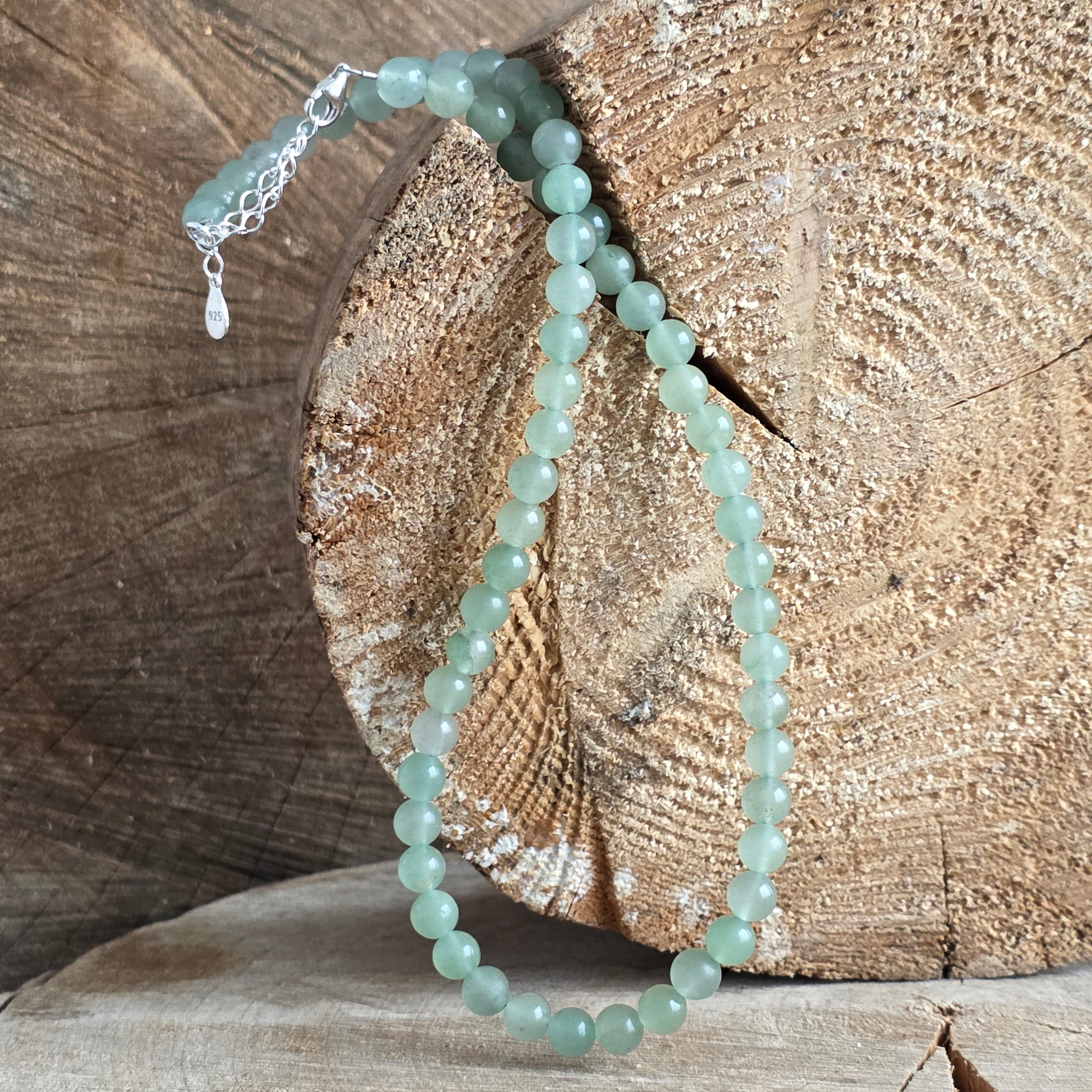 Eine Halskette, die die Energie von Frische und sanftem Glück trägt. Der natürliche grüne Aventurin von 6 mm strahlt ein ruhiges, ausgeglichenes Licht aus und erinnert an junge Blätter und die Stille der Natur nach einem Regen. Die glatte und glänzende Oberfläche der Steine vermittelt ein Gefühl visueller Harmonie, während 925er Silber das Design mit einer eleganten Note perfekt ergänzt.