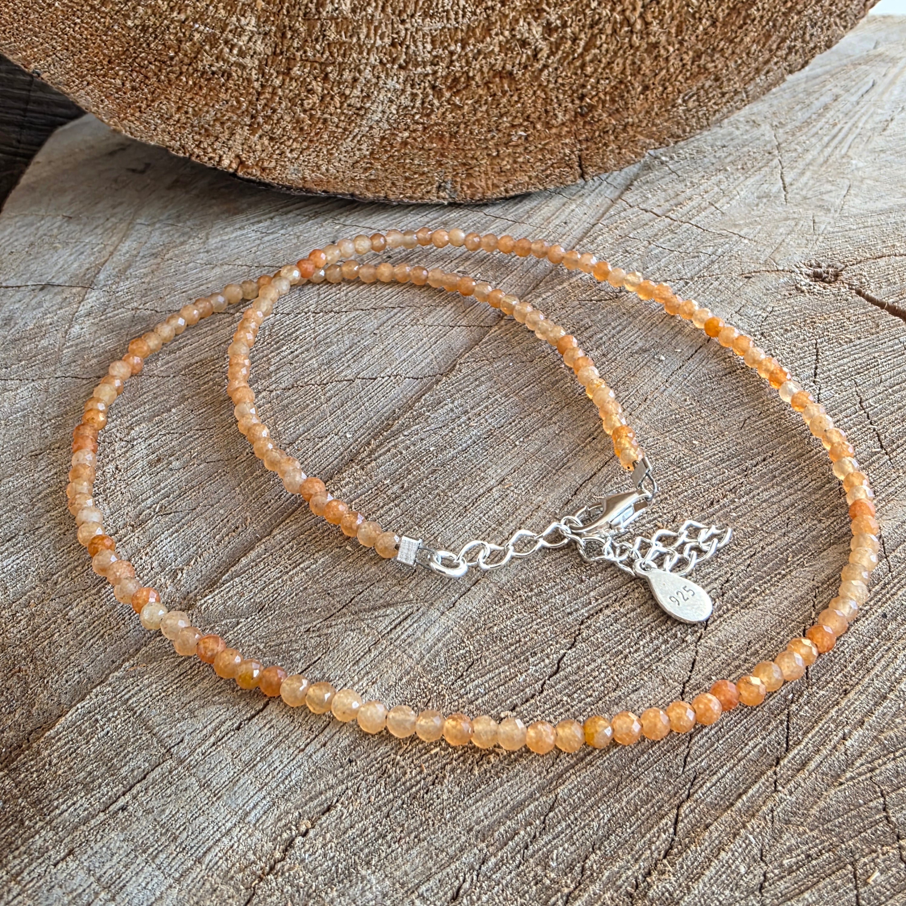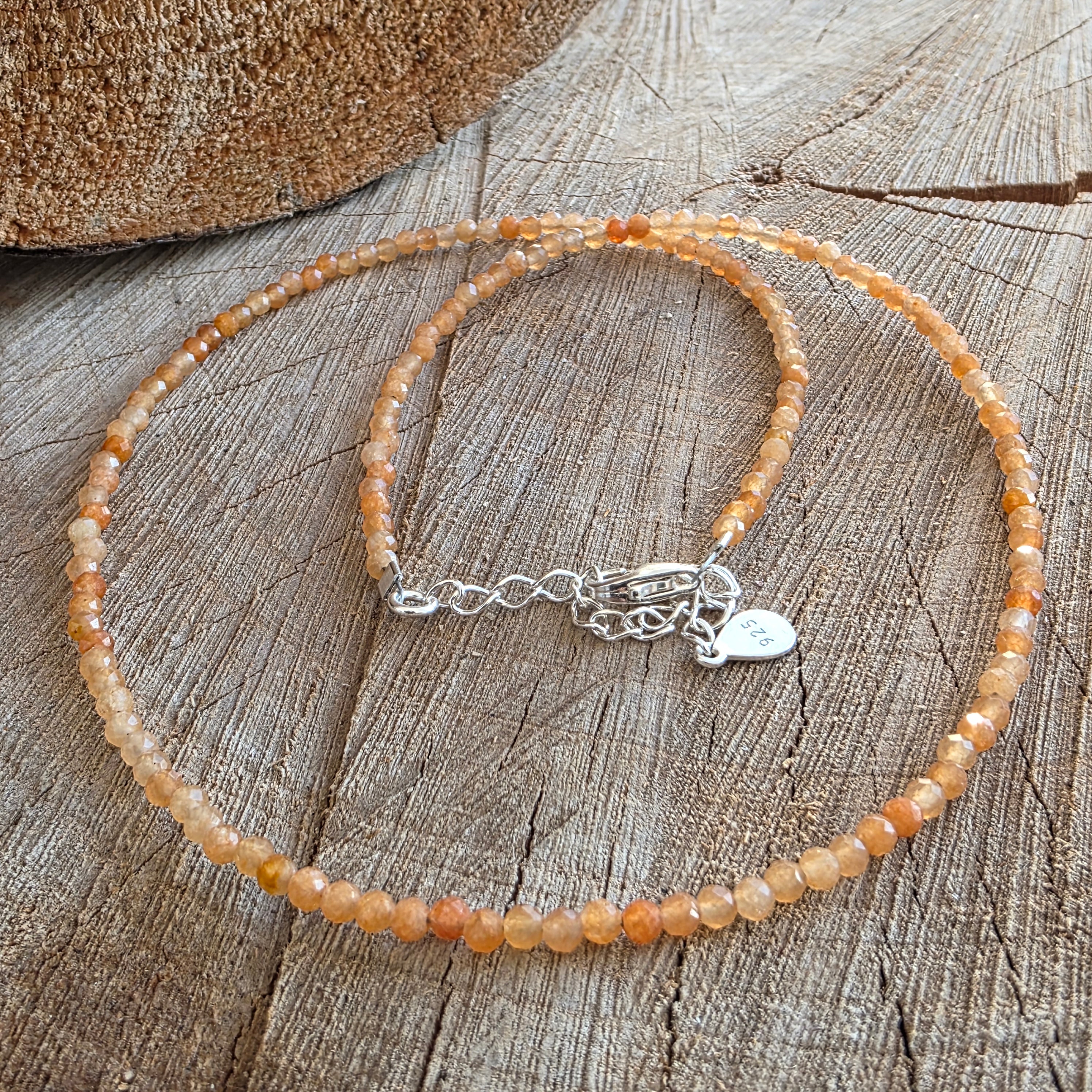 Der Faden besteht ausschließlich aus Kugeln von Facetten von durch 2,5 mm Orange Adventurine, feine Perlen, transparent in einigen Blickwinkeln und in anderen seidigen, die das Licht in sanften Funken fangen, wie der Schimmer des Westens über dem warmen Sand. Die Farbtöne variieren zwischen dem gelöschten Pfirsich und einer subtilen Tönung von hellem Bernstein - einer Sonnenfarbe, aber unaufhörend, die sich tröstet, nicht blind.