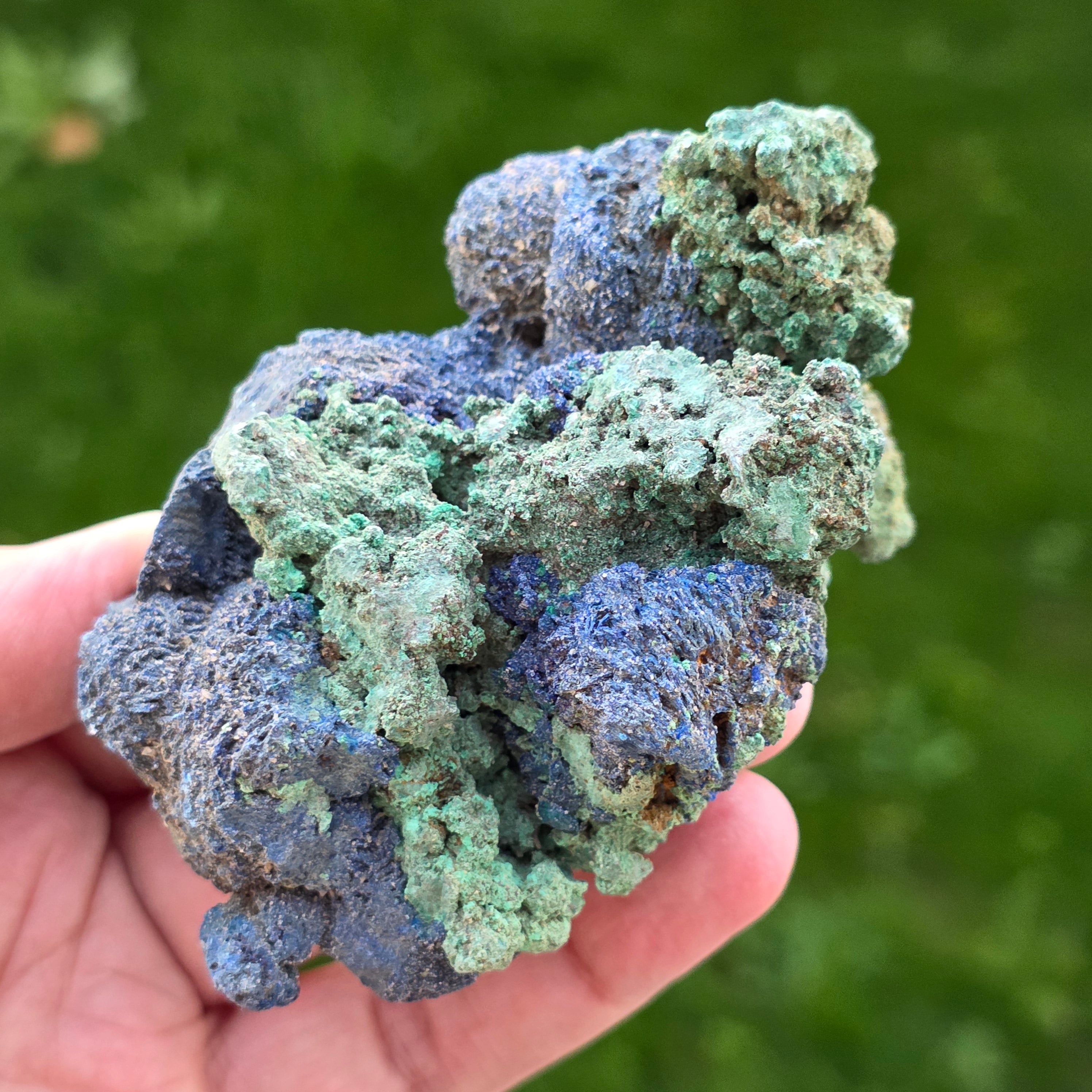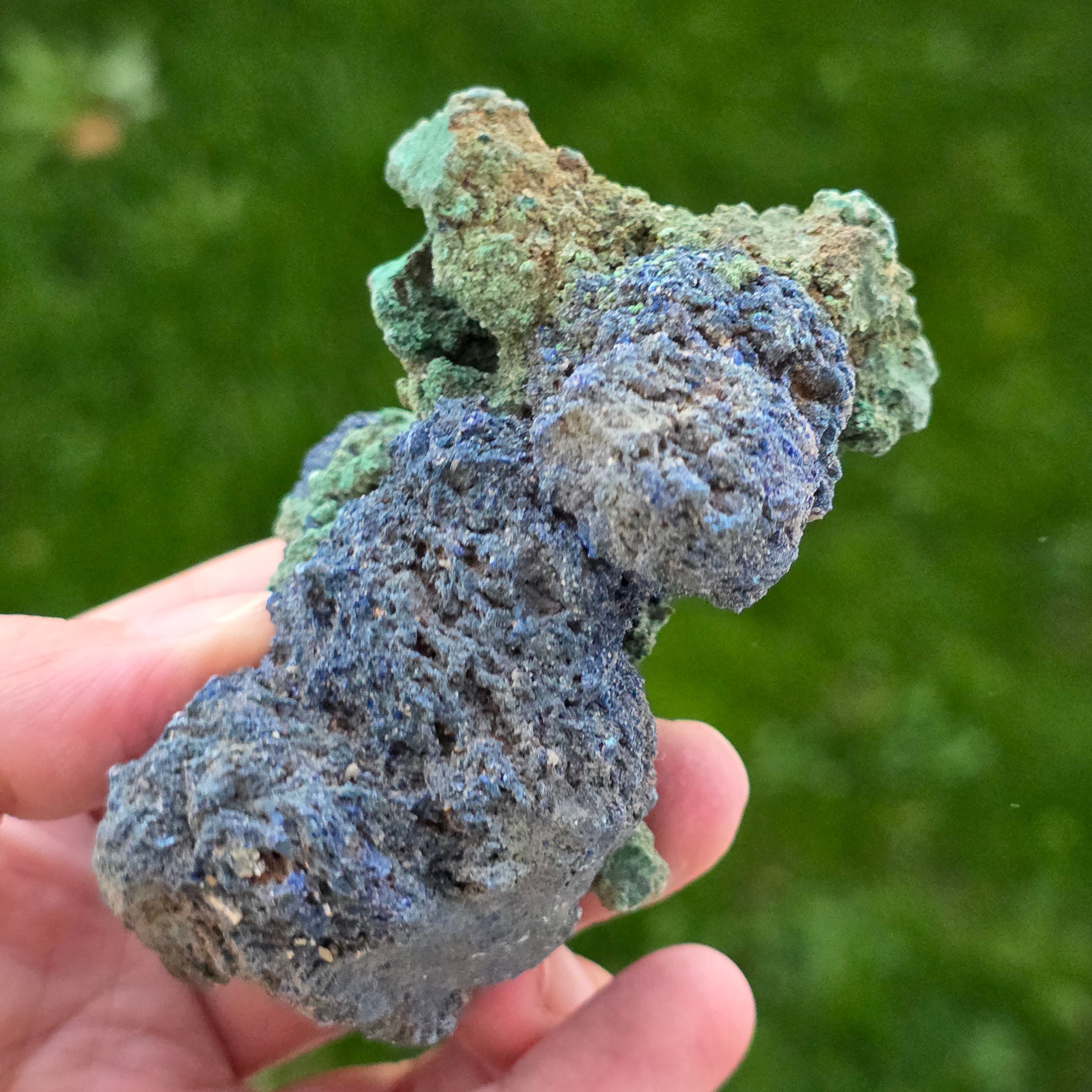 Azurit wird hauptsächlich in den Oxidationszonen von Kupferlagerstätten gebildet. Der Entstehungsprozess beinhaltet die Wechselwirkung von karbonatreichem Grundwasser mit Kupfererzen, was zur Kristallisation von Azurit in Rissen und Gesteinsräumen führt. Oft ist Azurit mit Malachit verbunden, einem weiteren Kupfermineral, das eine tiefgrüne Farbe hat. Die beiden Minerale entstehen unter ähnlichen Bedingungen und werden manchmal gemeinsam in Form von Azurit-Malachit-Steinen gefunden.