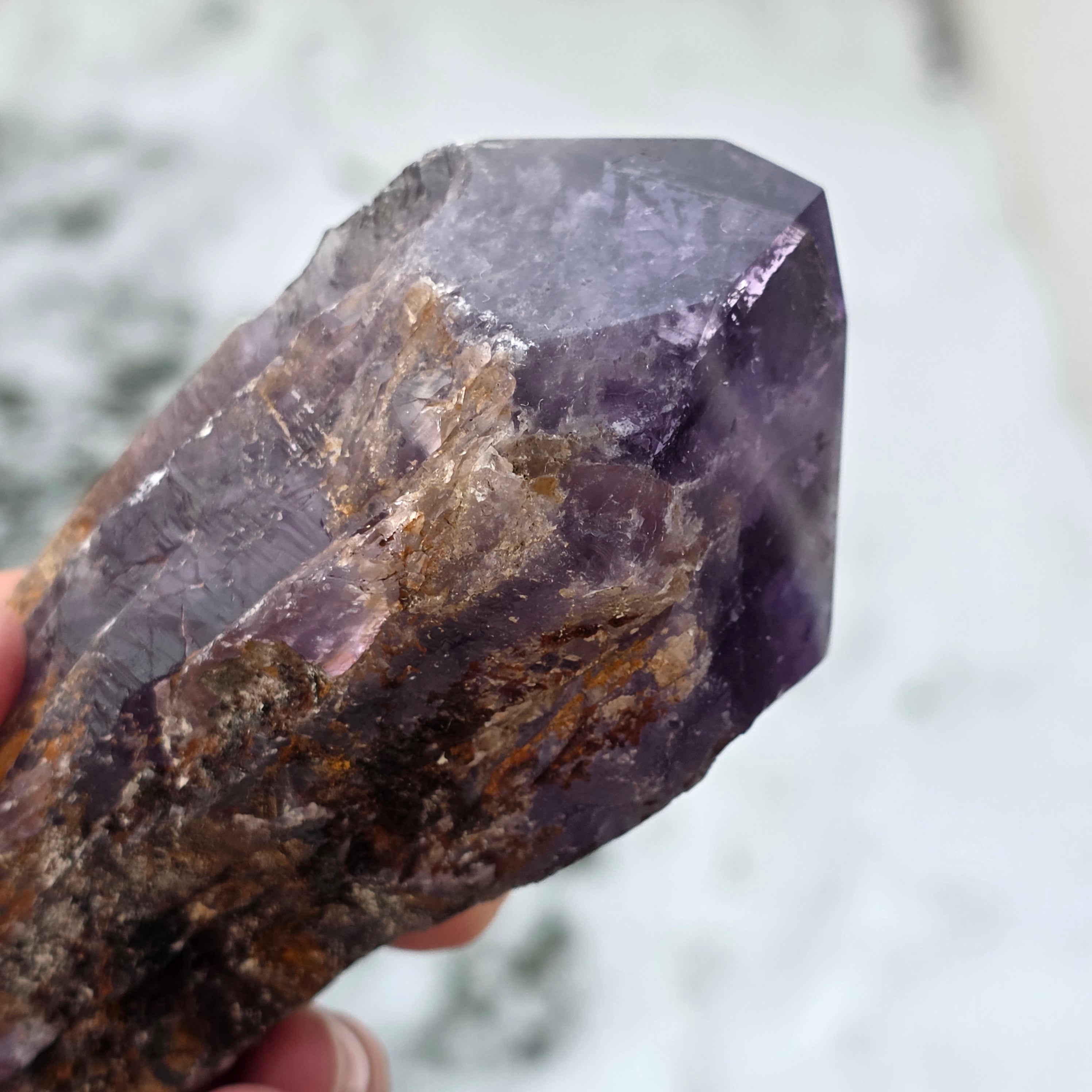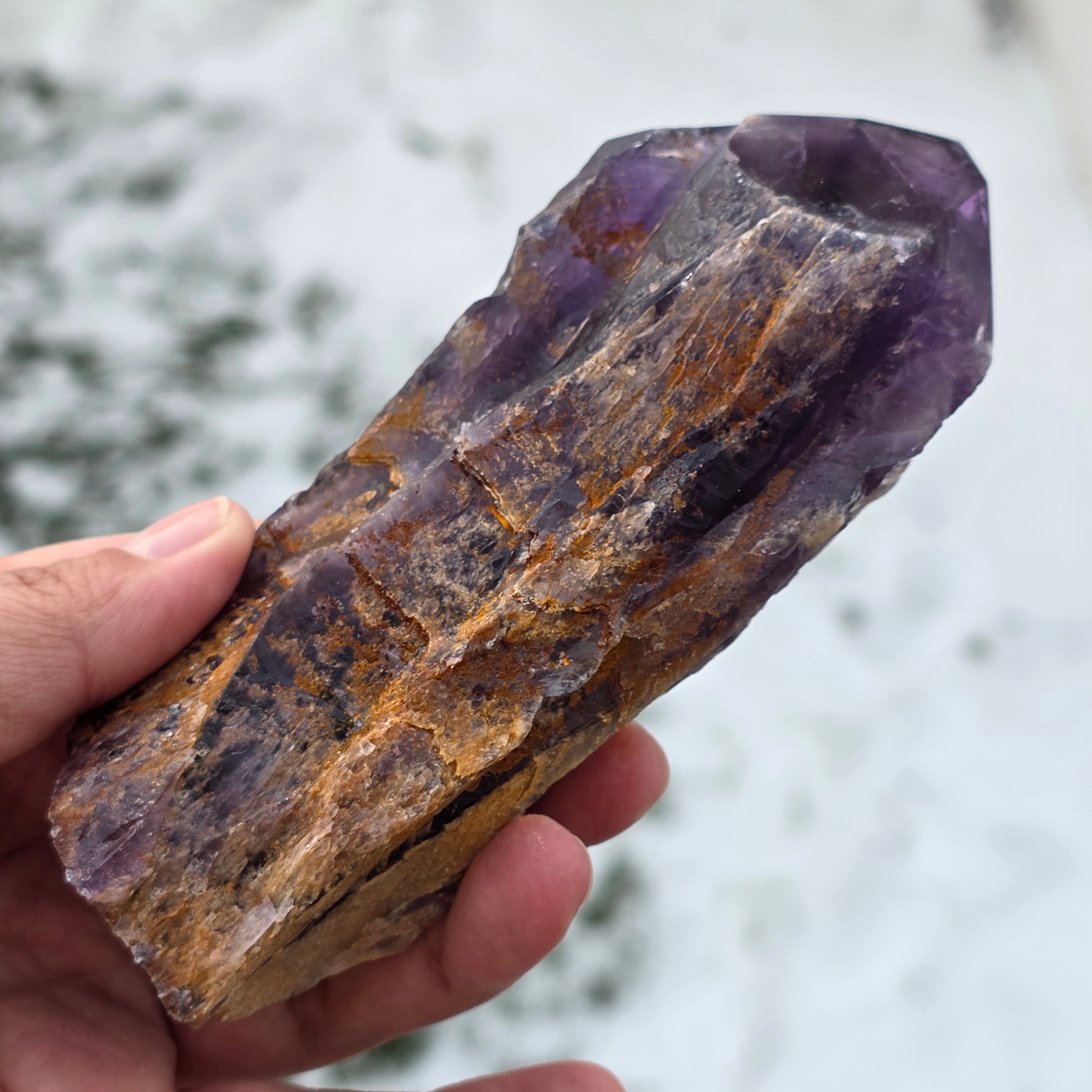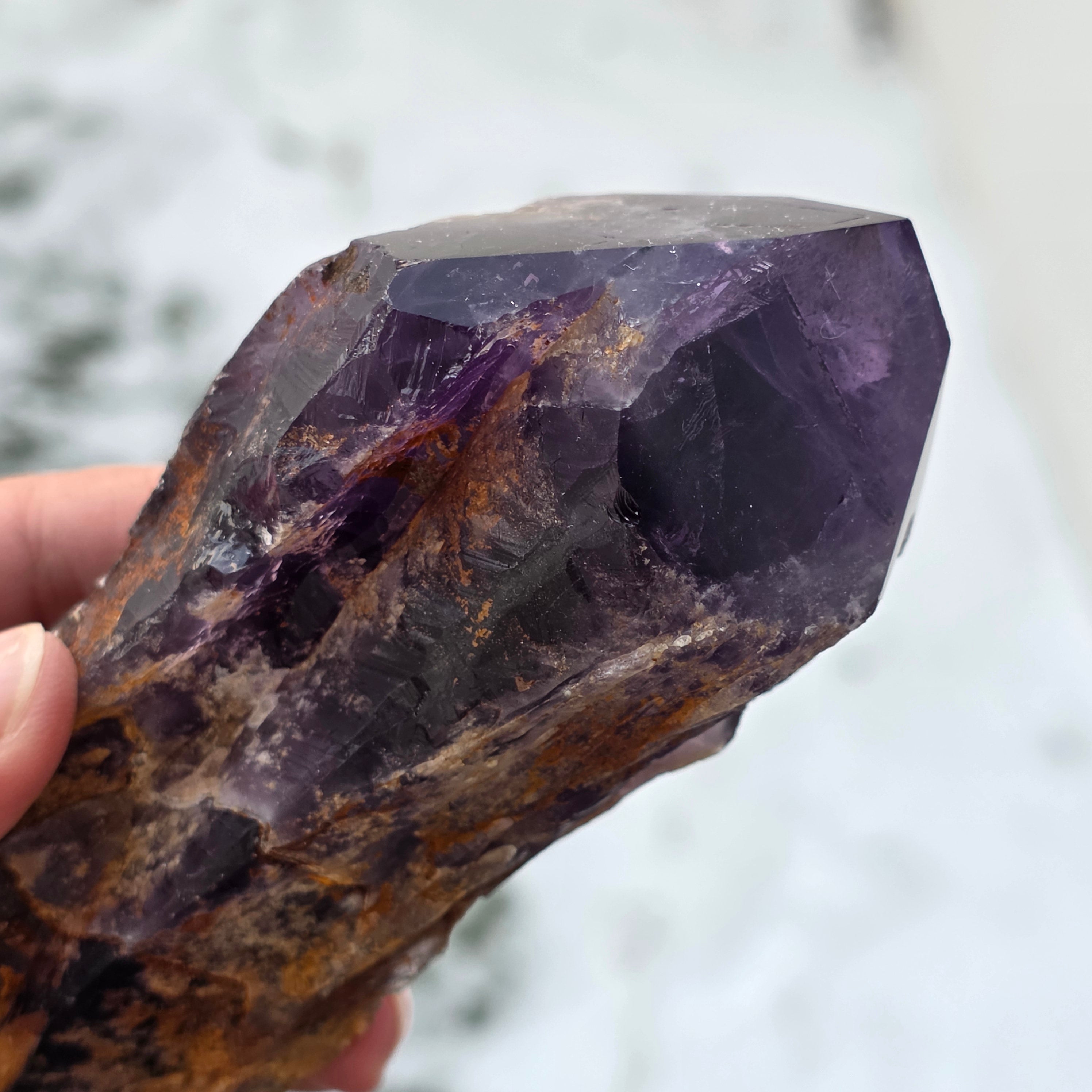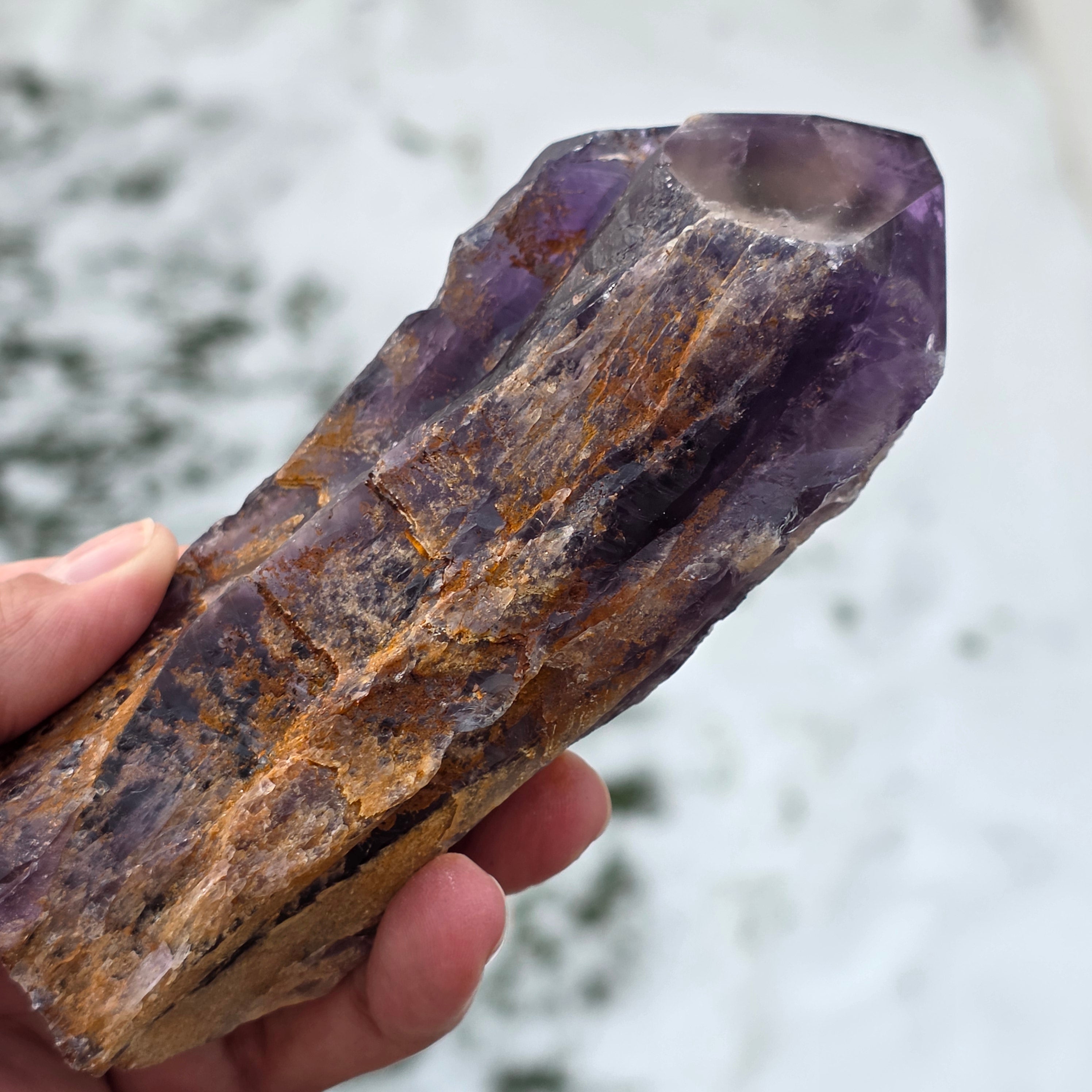 Der Bahia-Amethyst, manchmal auch „Drachenwinkel“ genannt, wird aus der Region Bahia, Brasilien, gewonnen. Jeder Kristall ist ein einzigartiges natürliches Exemplar mit gut definierter Kristallform und auf der gesamten Länge mit Kanten oder Erhebungen versehen. Diese Kristalle werden nicht aus einer größeren Gruppe gelöst, sondern bilden sich einzeln, einer nach dem anderen.