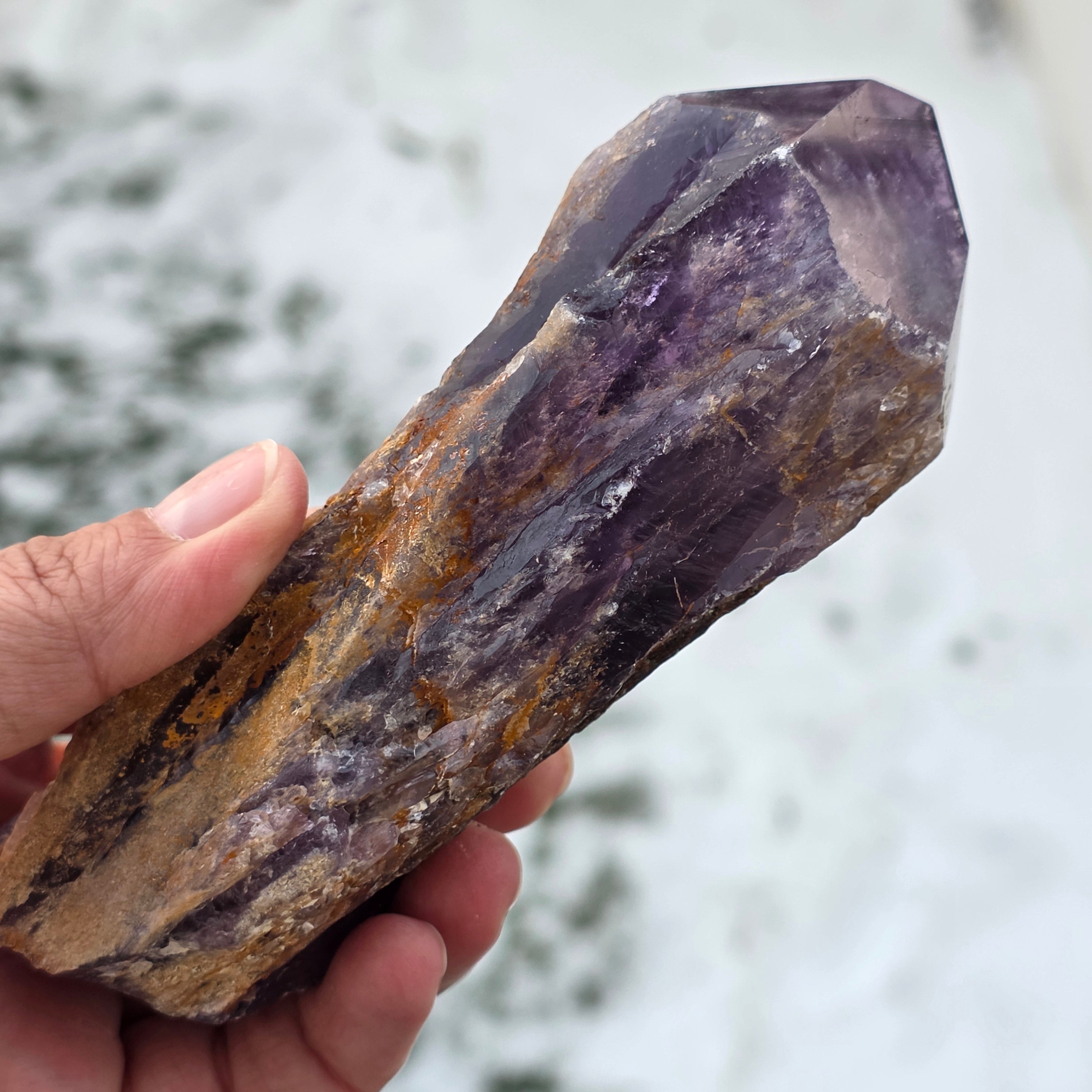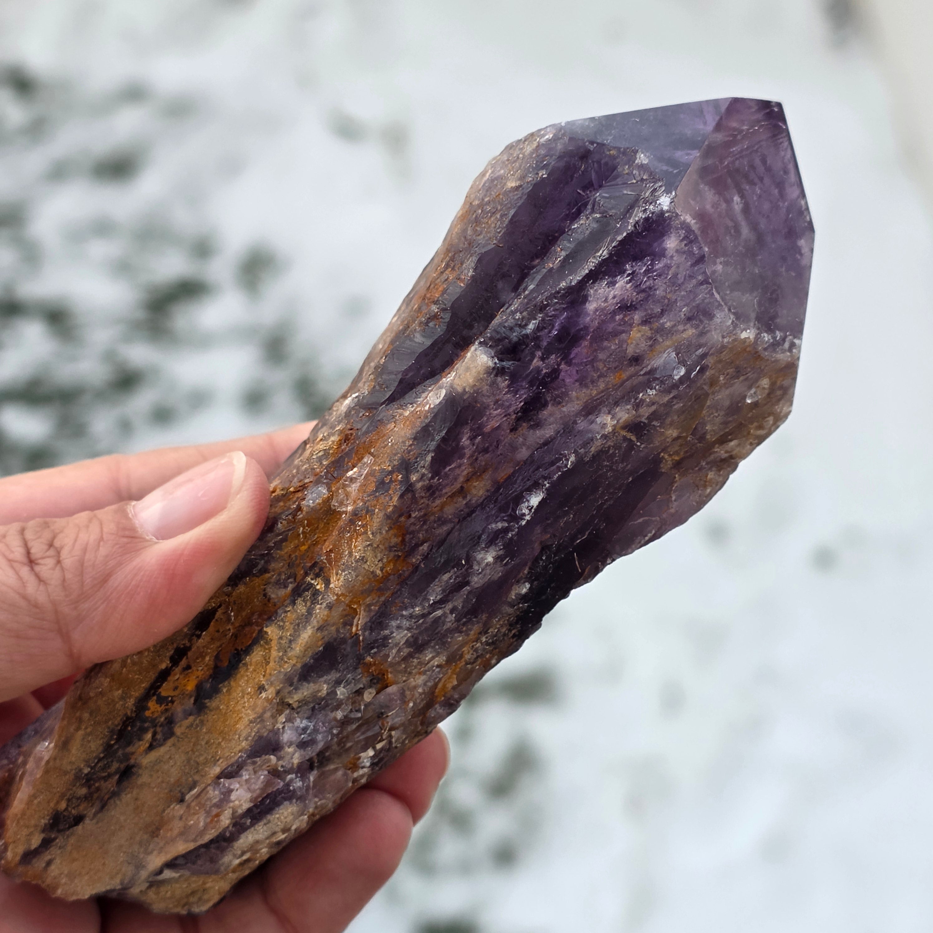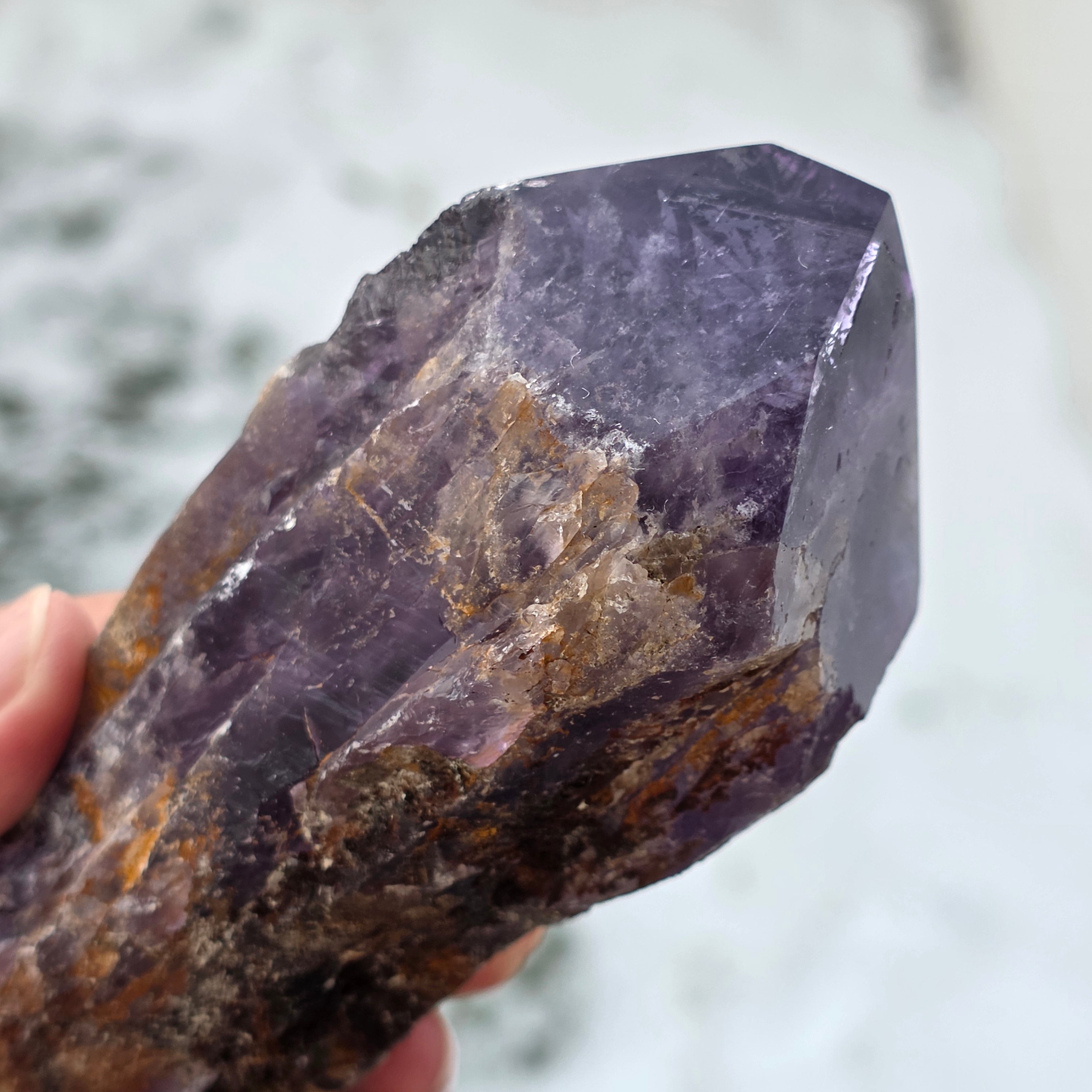 Der Bahia-Amethyst, manchmal auch „Drachenwinkel“ genannt, wird aus der Region Bahia, Brasilien, gewonnen. Jeder Kristall ist ein einzigartiges natürliches Exemplar mit gut definierter Kristallform und auf der gesamten Länge mit Kanten oder Erhebungen versehen. Diese Kristalle werden nicht aus einer größeren Gruppe gelöst, sondern bilden sich einzeln, einer nach dem anderen.