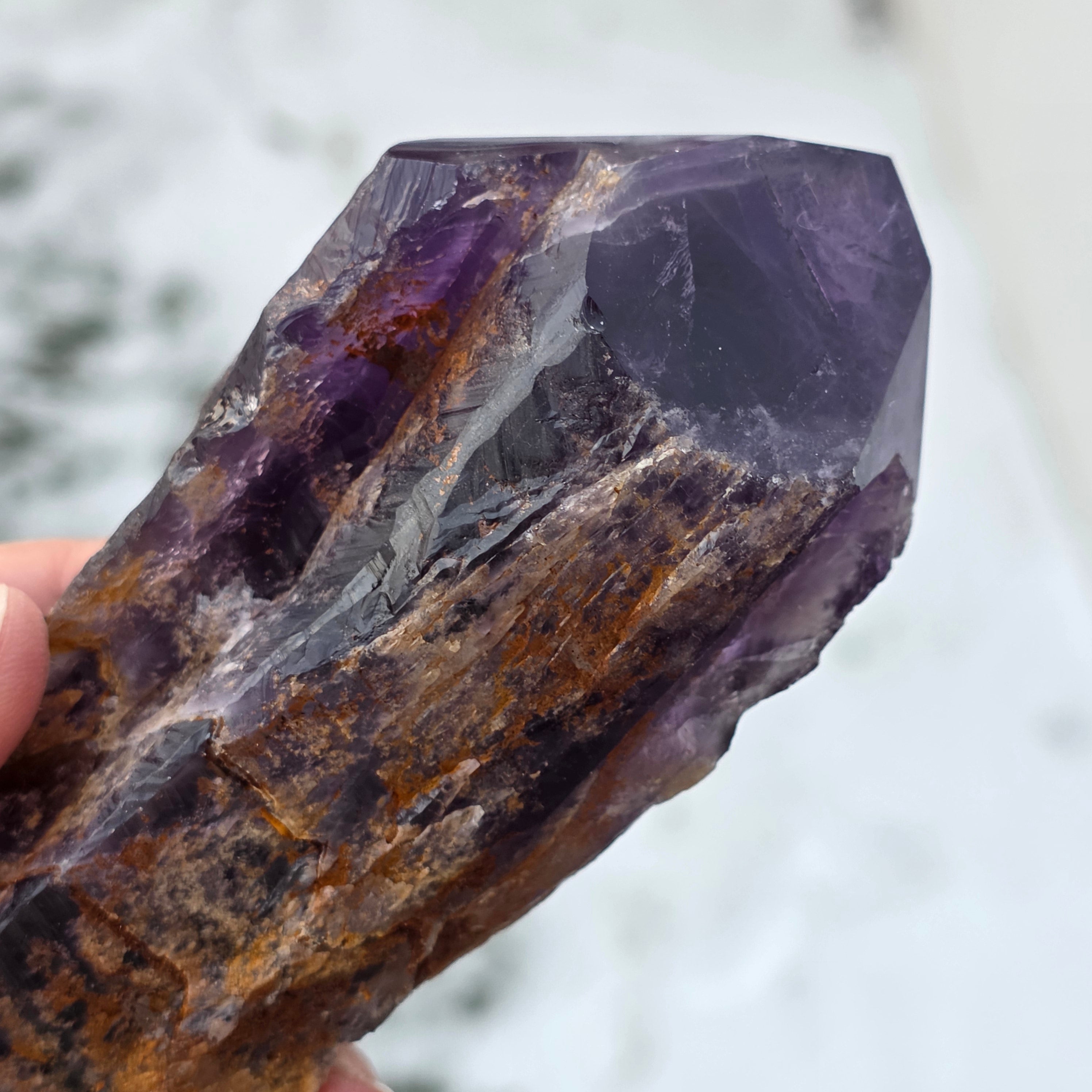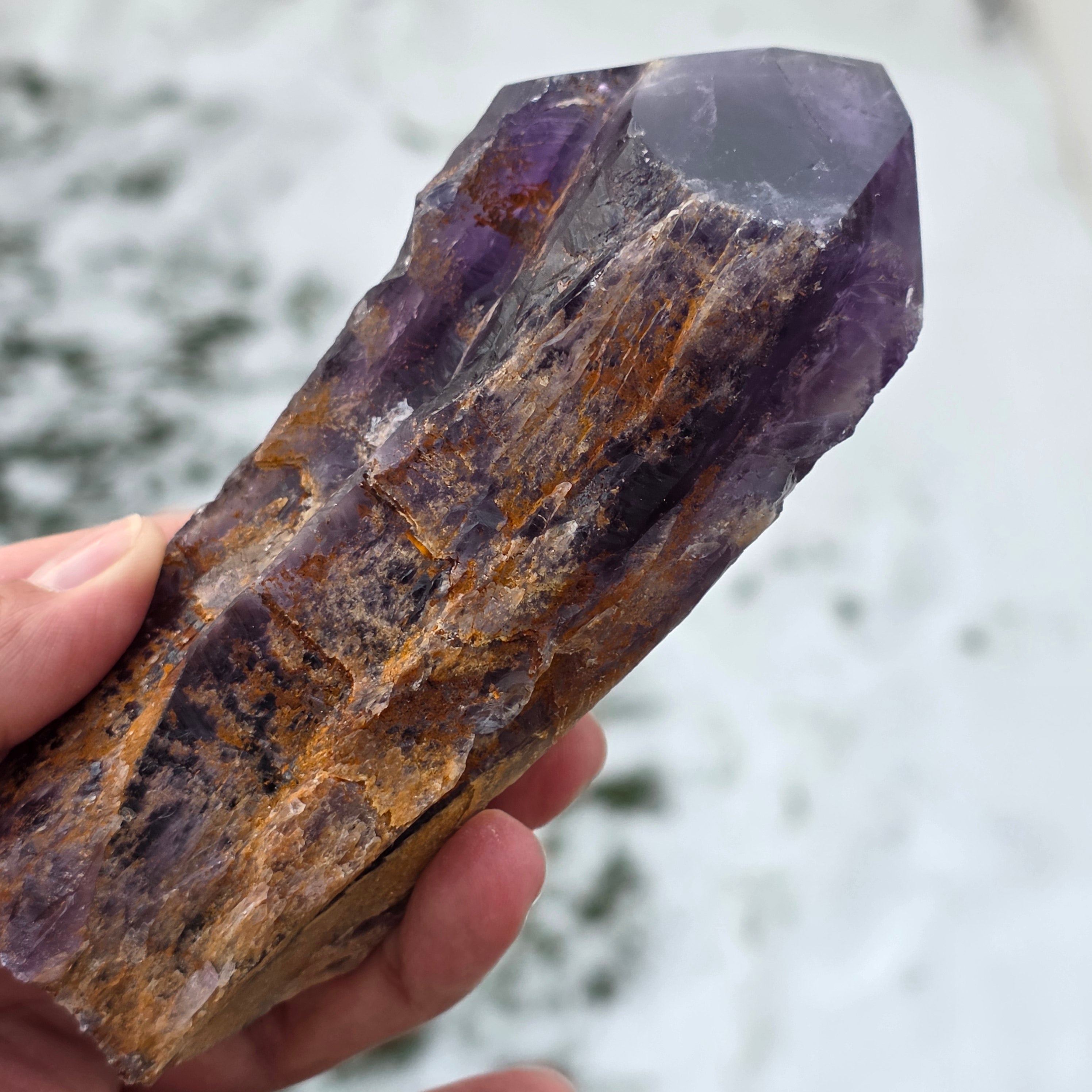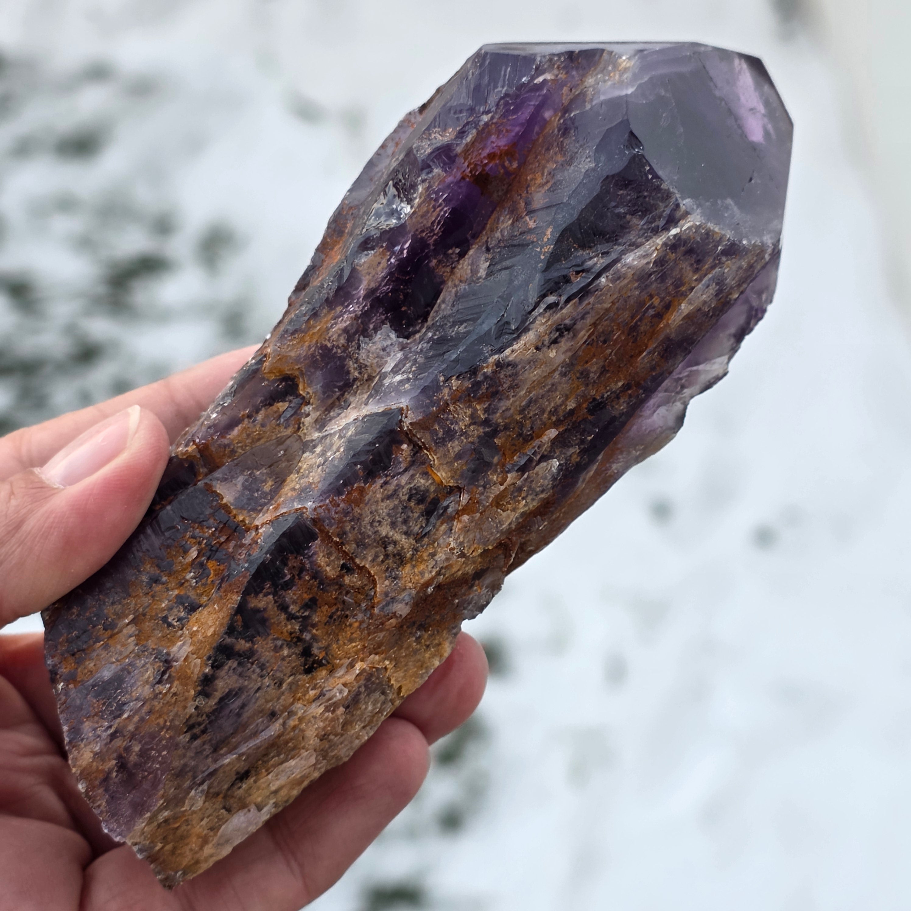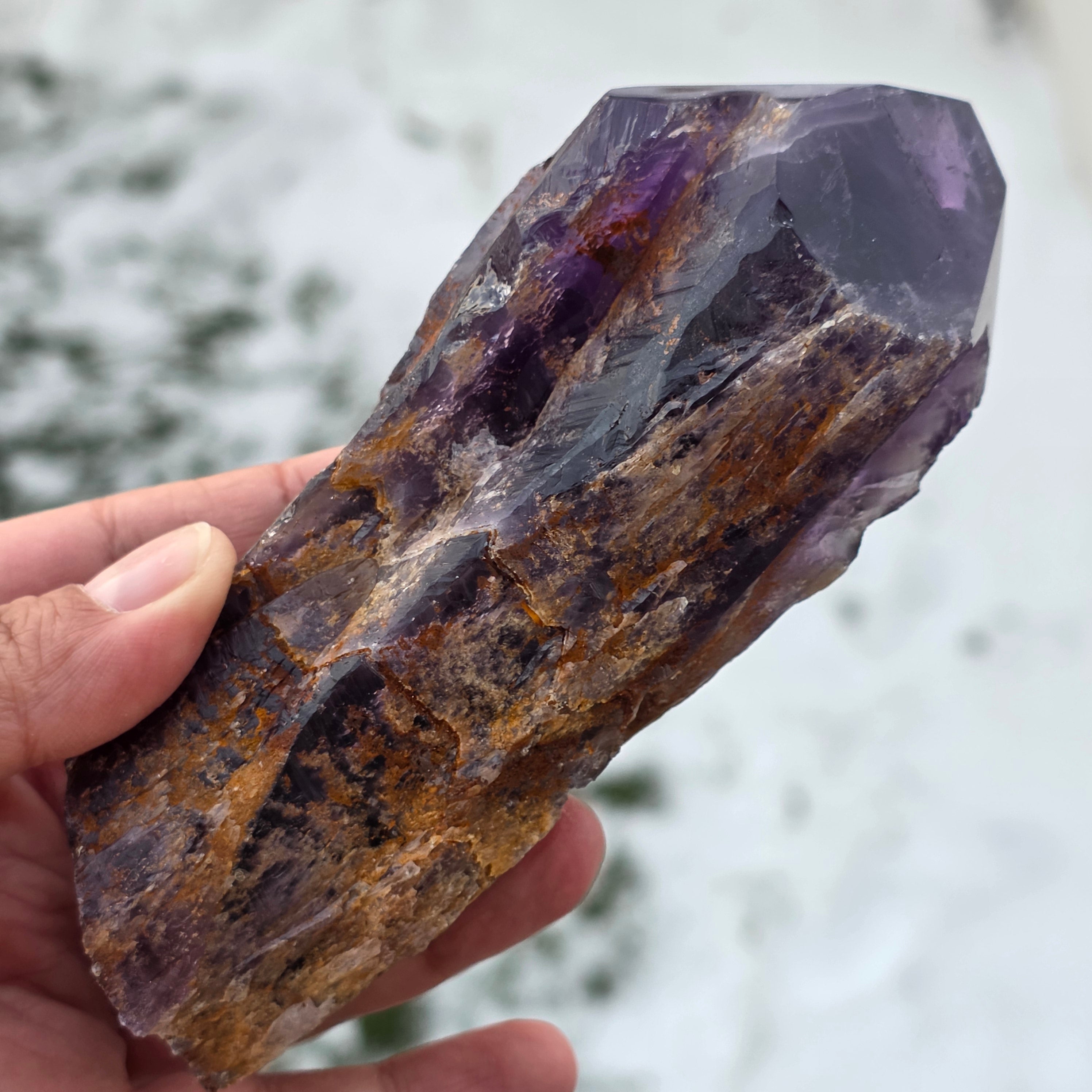 Der Bahia-Amethyst, manchmal auch „Drachenwinkel“ genannt, wird aus der Region Bahia, Brasilien, gewonnen. Jeder Kristall ist ein einzigartiges natürliches Exemplar mit gut definierter Kristallform und auf der gesamten Länge mit Kanten oder Erhebungen versehen. Diese Kristalle werden nicht aus einer größeren Gruppe gelöst, sondern bilden sich einzeln, einer nach dem anderen.