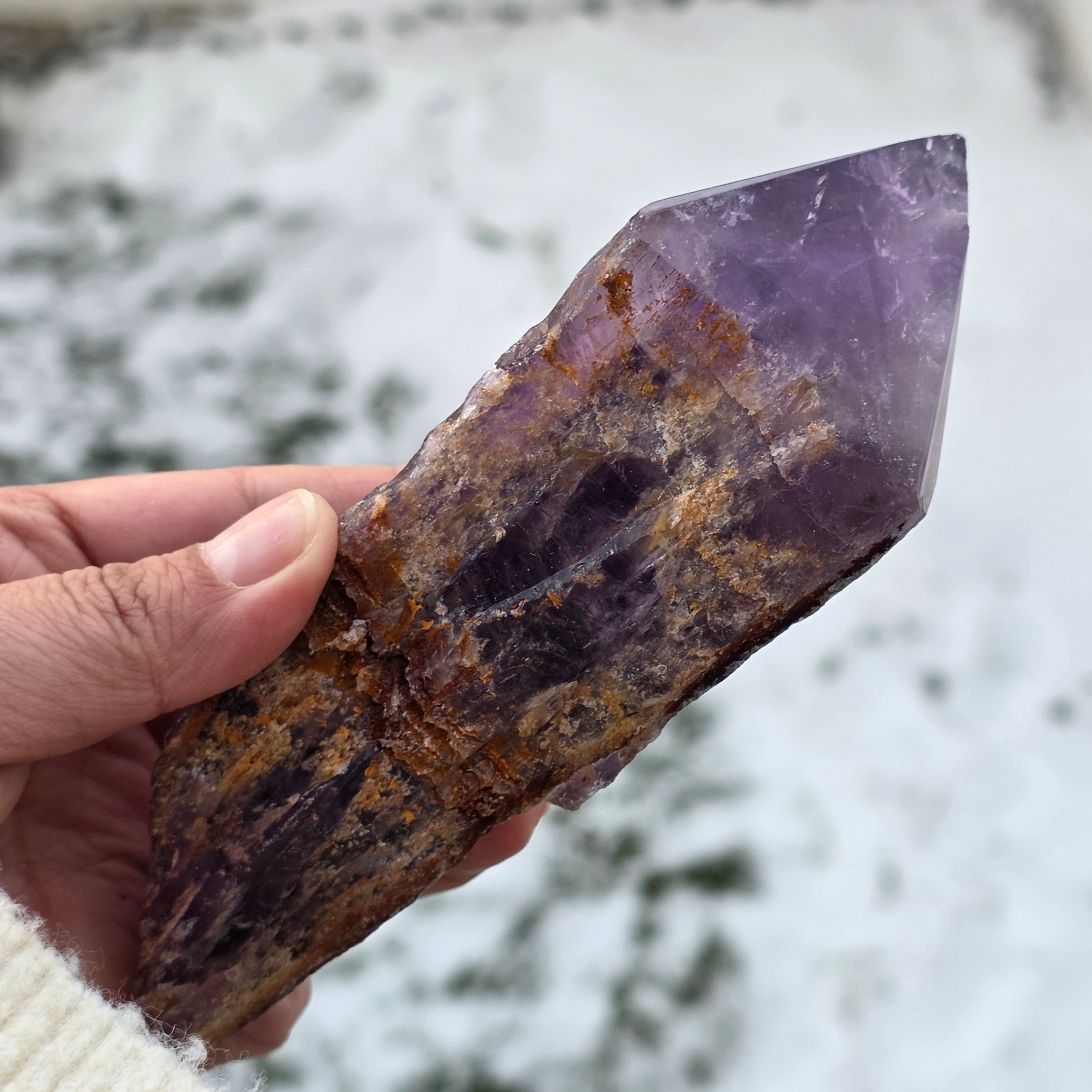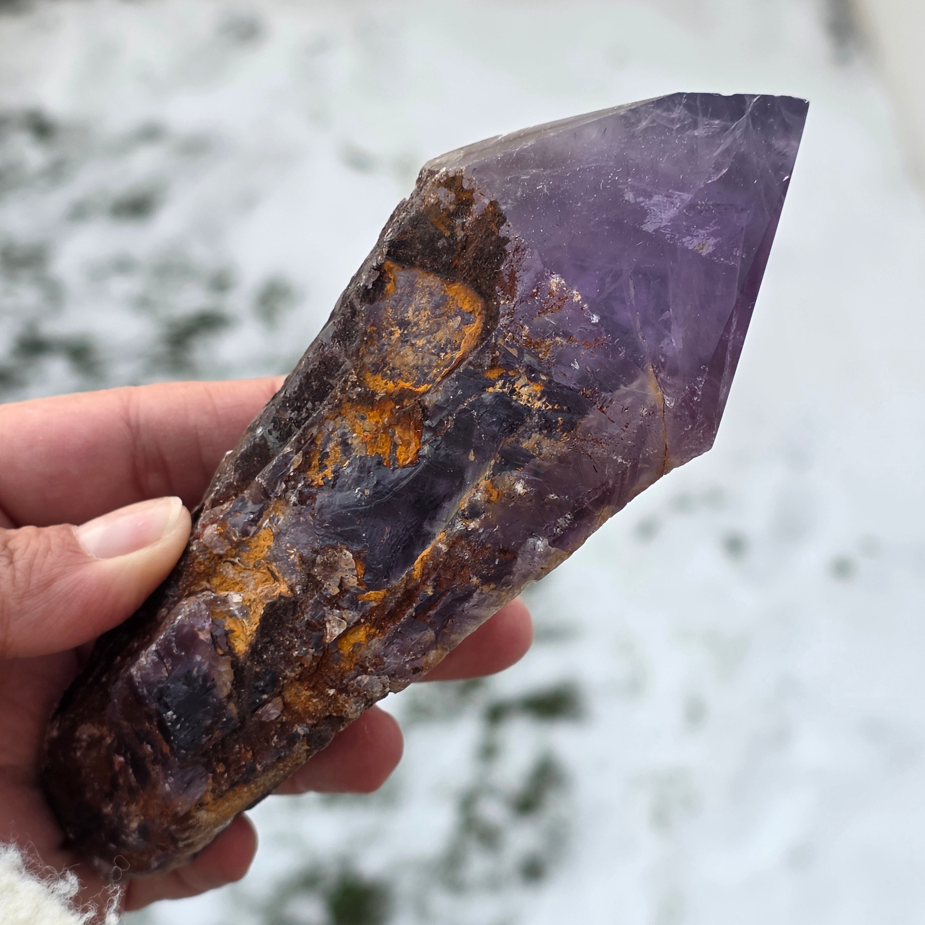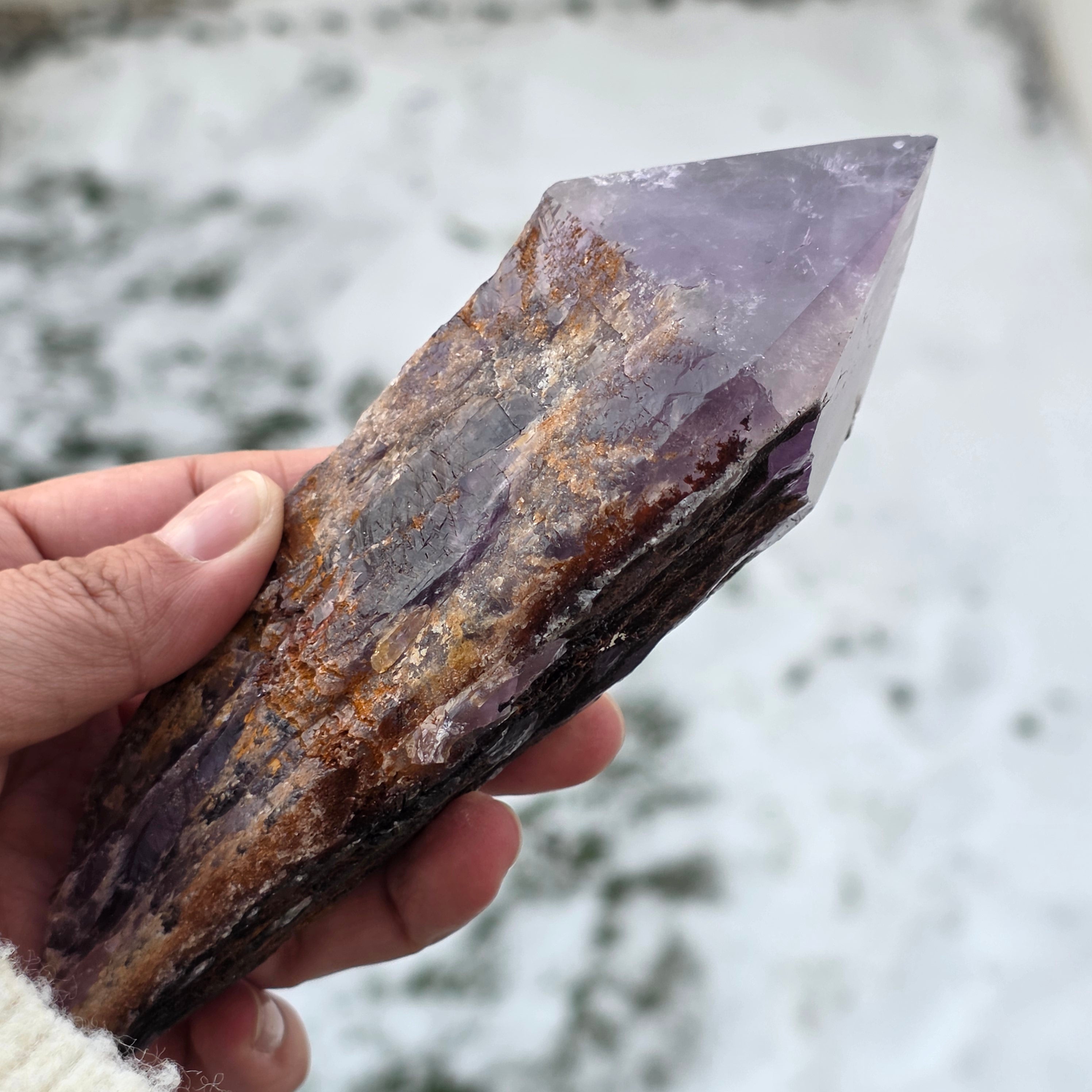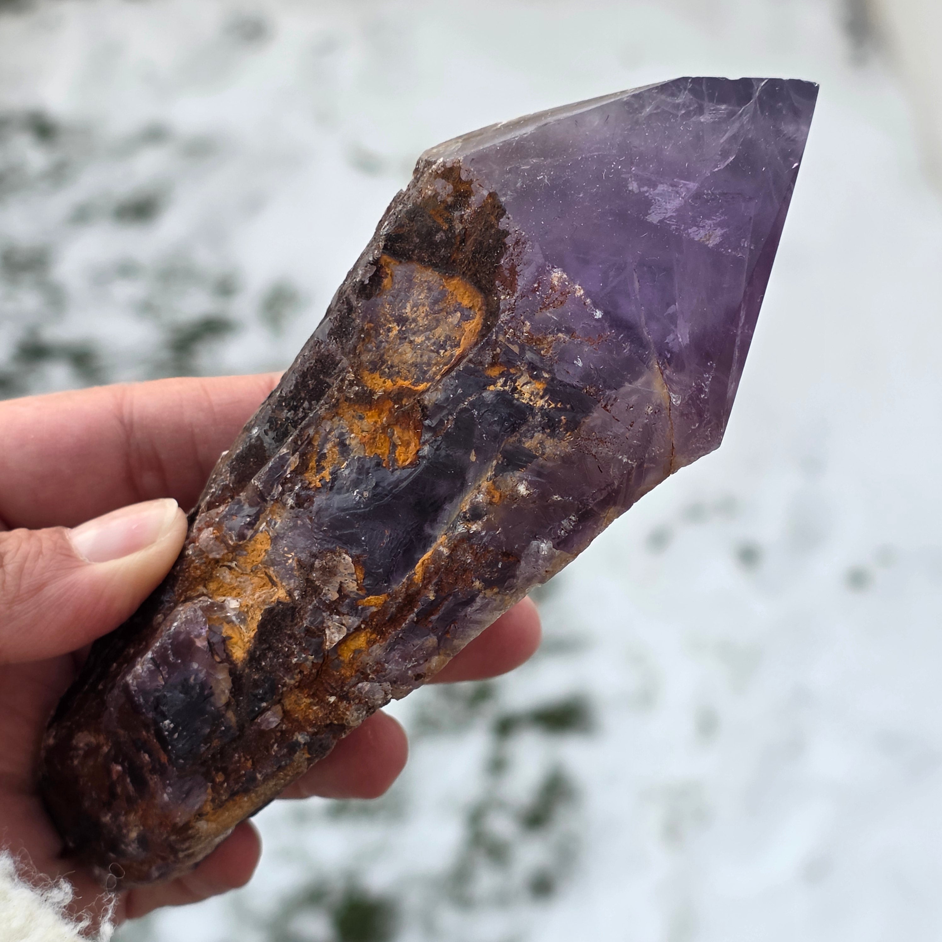 Der Bahia-Amethyst, manchmal auch „Drachenecke“ genannt, wird aus der Region Bahia in Brasilien gewonnen. Jeder Kristall ist ein einzigartiges natürliches Exemplar, mit einer klar definierten Kristallform und weist Einkerbungen oder Vorsprünge über seine gesamte Länge auf. Diese Kristalle werden nicht aus einer größeren Gruppe herausgelöst, sondern bilden sich einzeln, Stück für Stück.