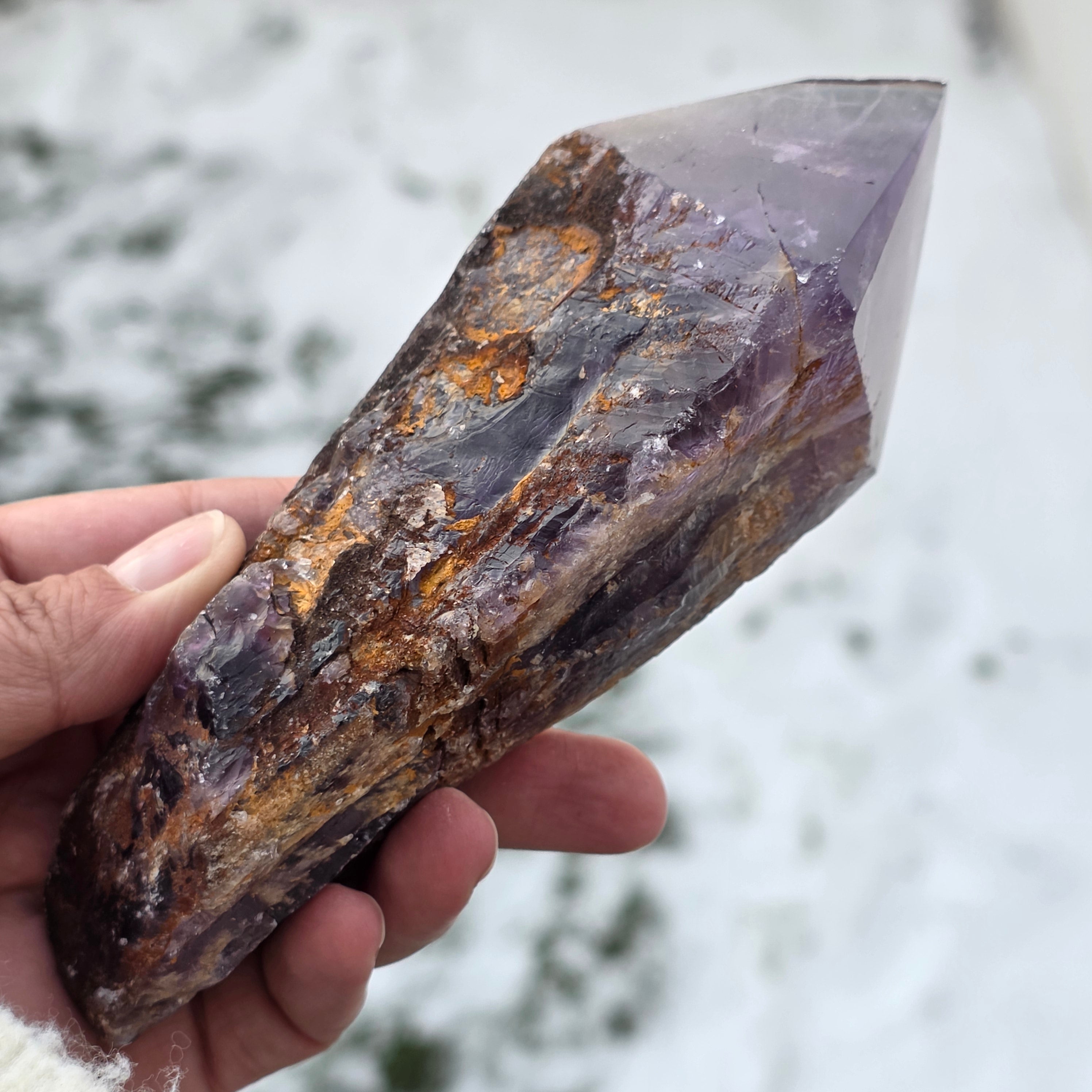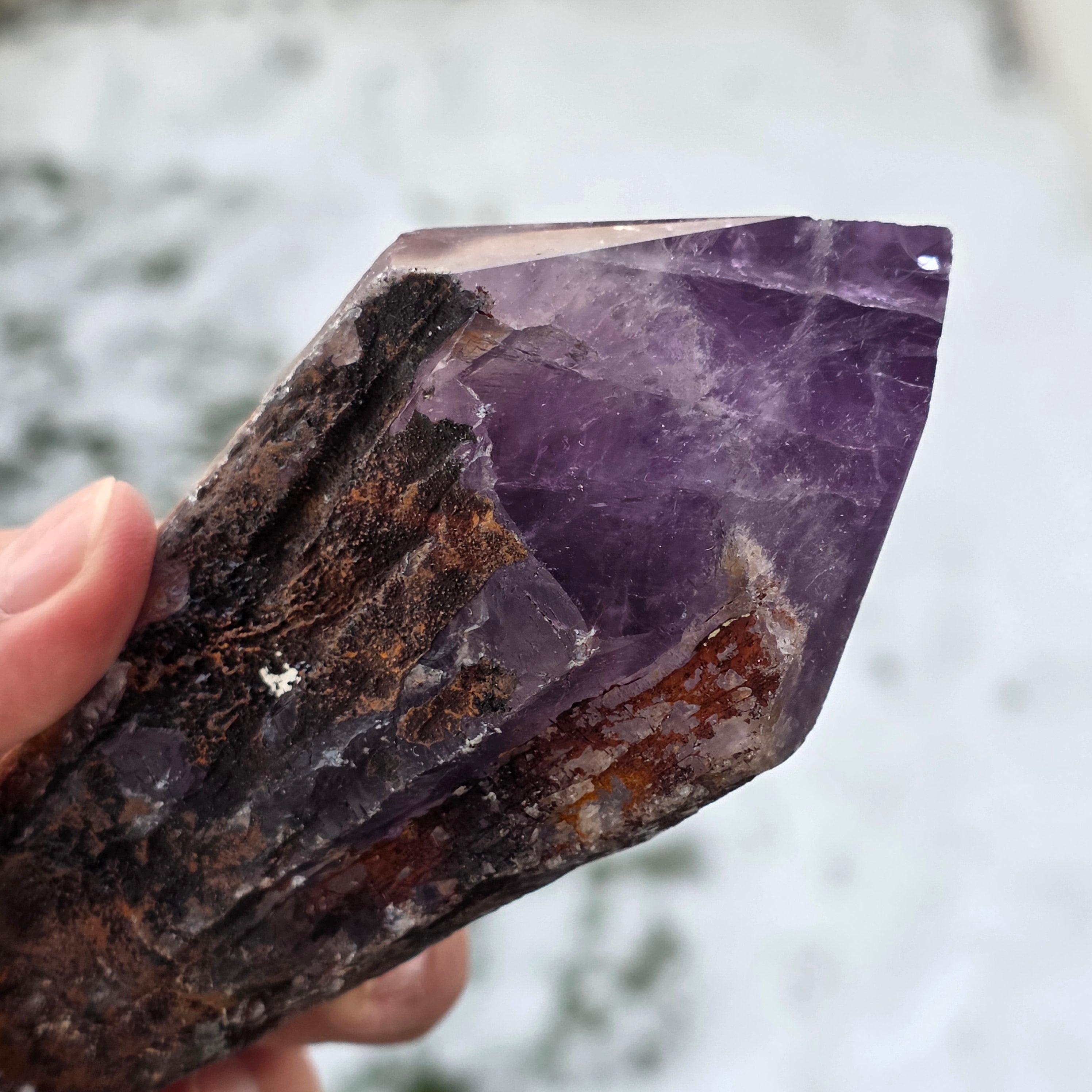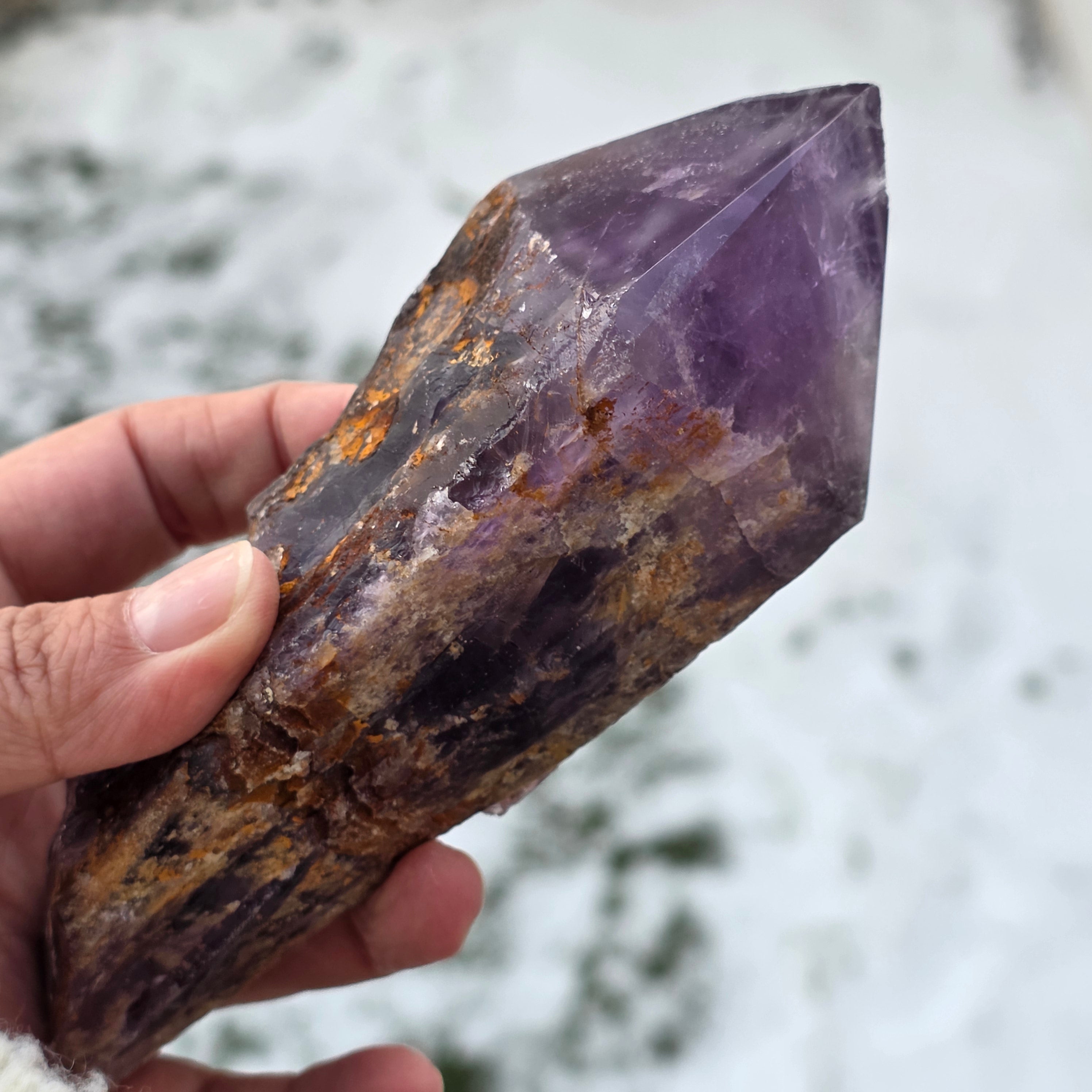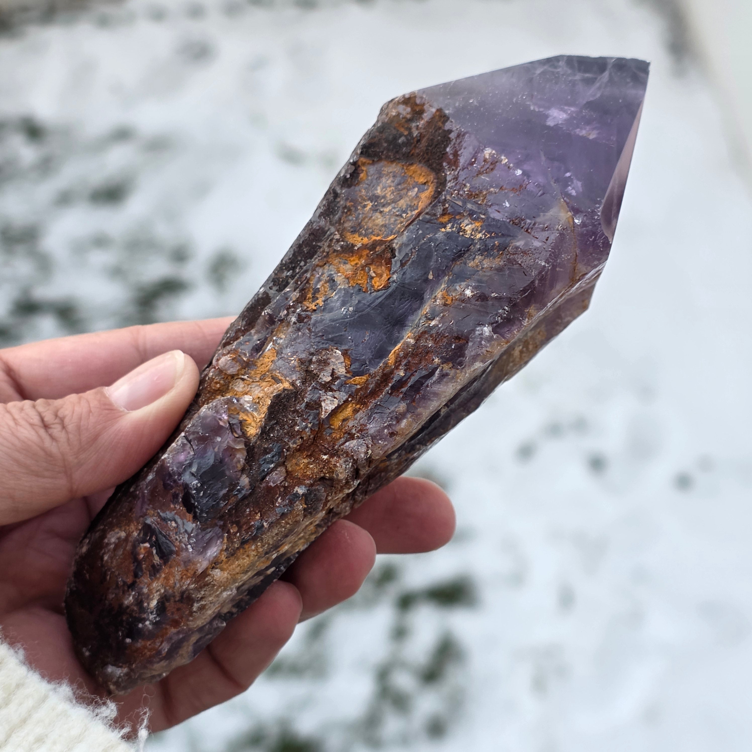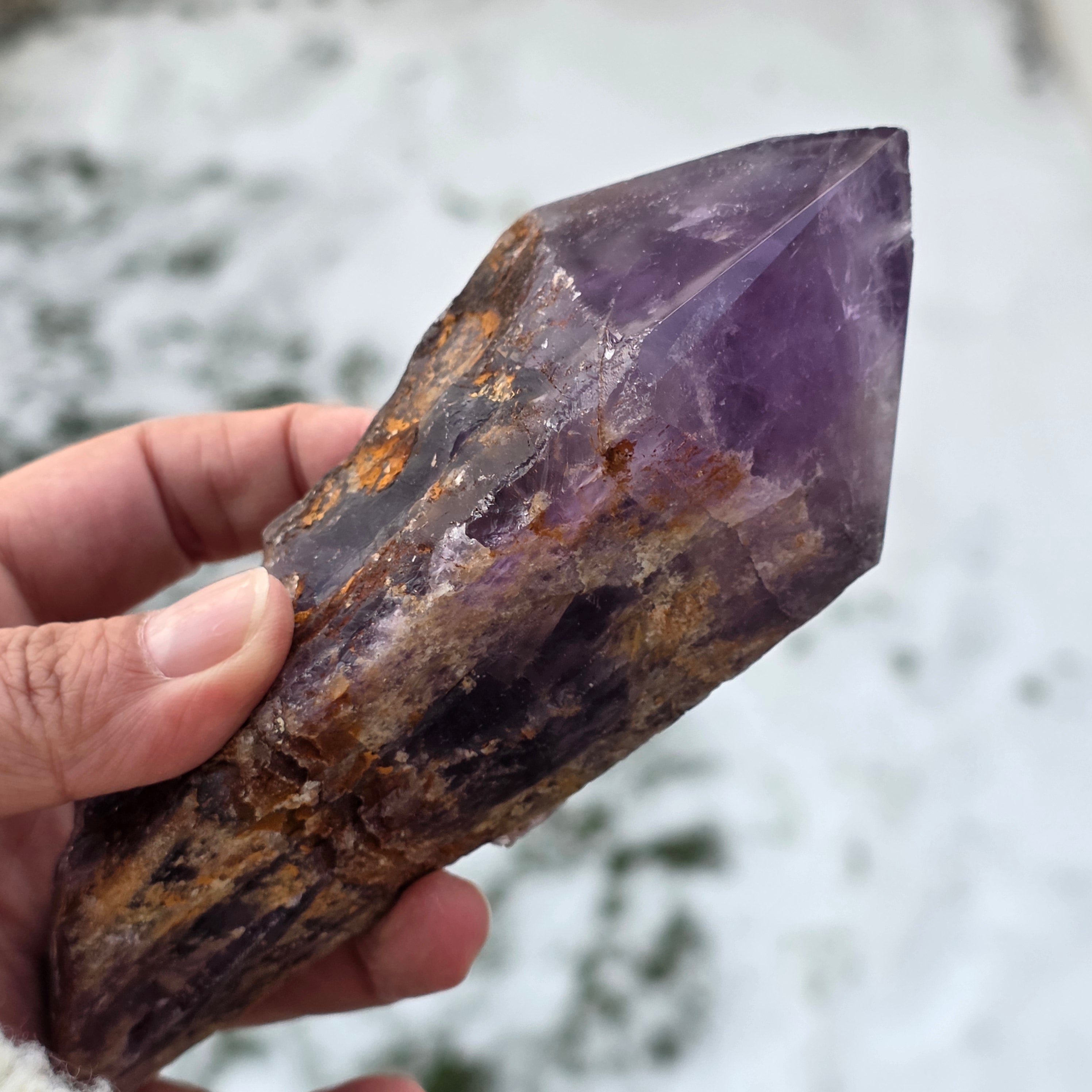 Der Bahia-Amethyst, manchmal auch „Drachenecke“ genannt, wird aus der Region Bahia in Brasilien gewonnen. Jeder Kristall ist ein einzigartiges natürliches Exemplar, mit einer klar definierten Kristallform und weist Einkerbungen oder Vorsprünge über seine gesamte Länge auf. Diese Kristalle werden nicht aus einer größeren Gruppe herausgelöst, sondern bilden sich einzeln, Stück für Stück.