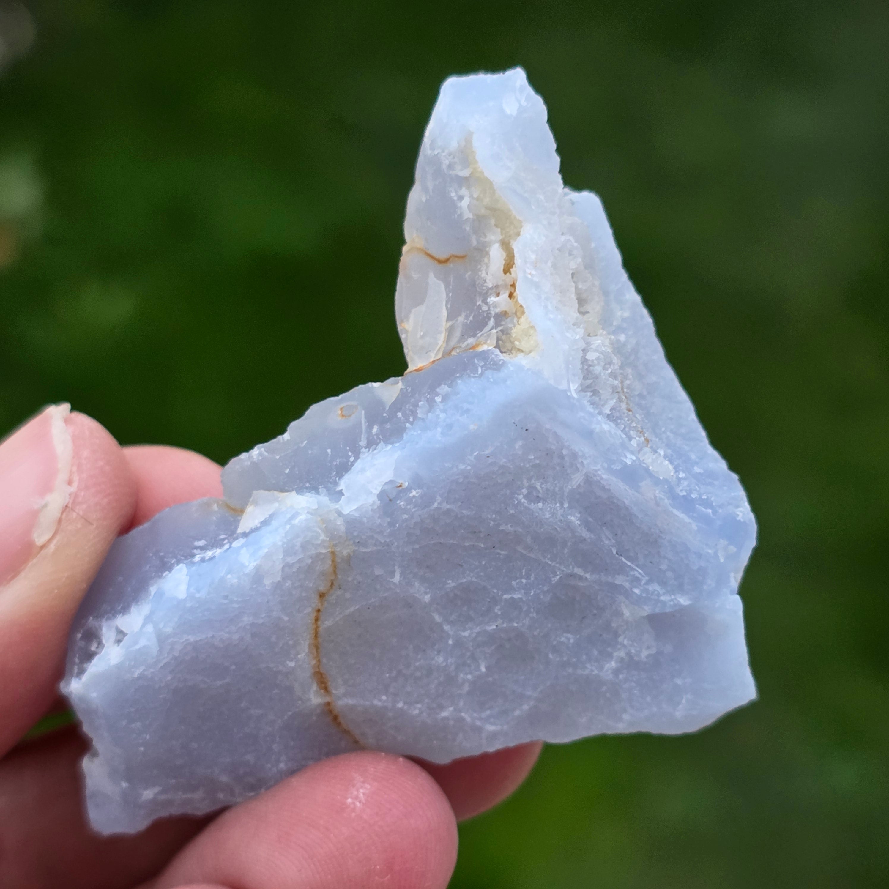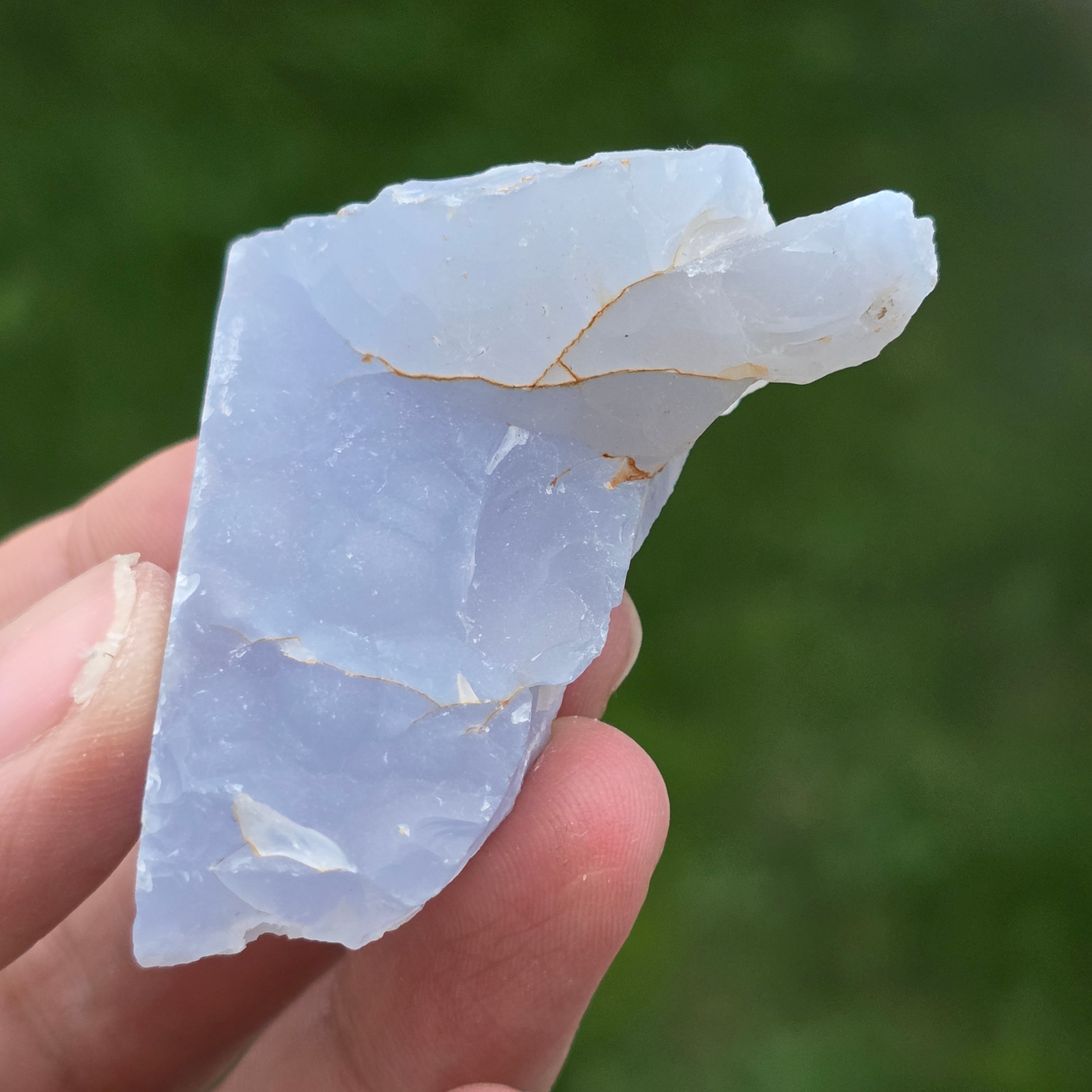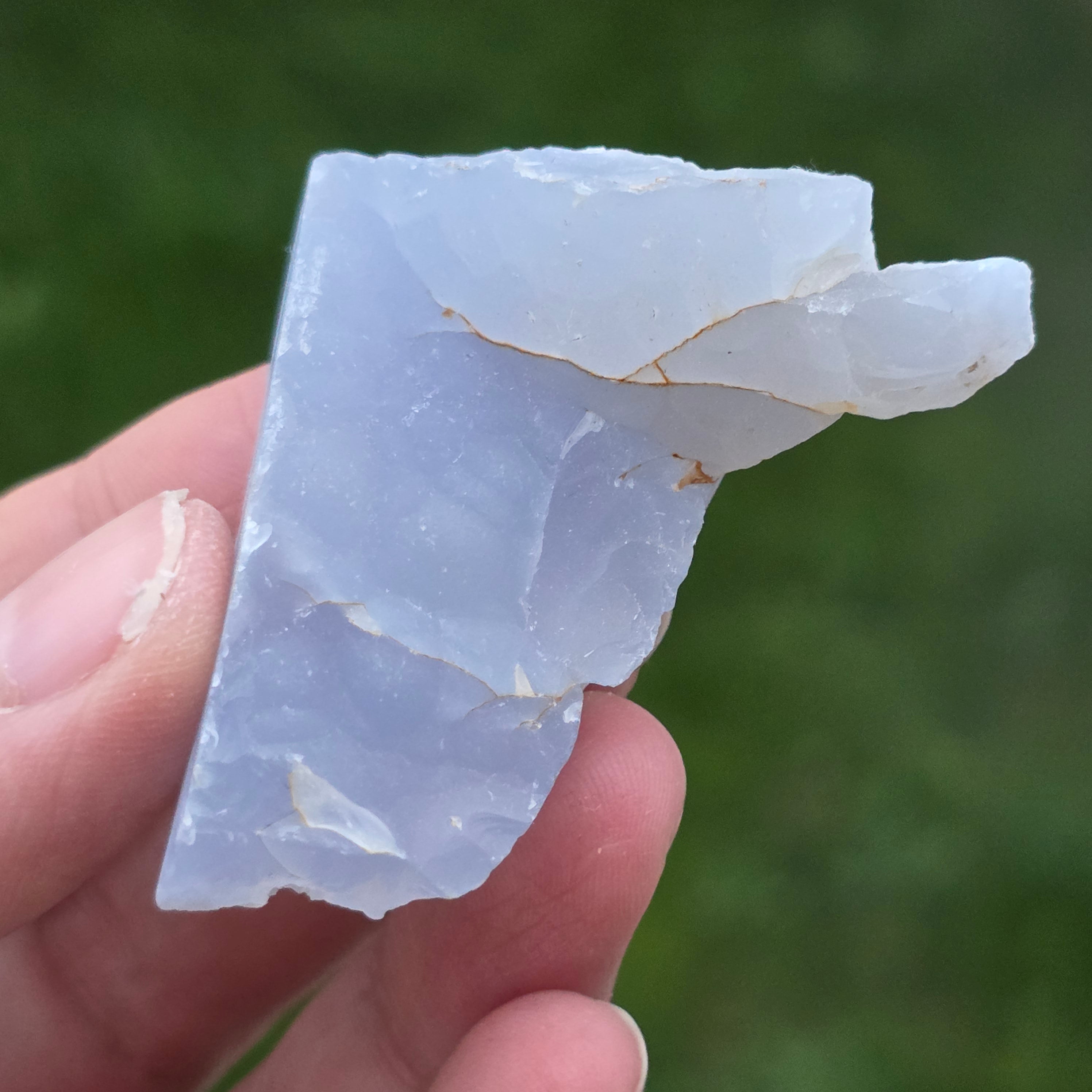 Blauer Chalcedon, auch bekannt als blauer Achat oder Himmelschalcedon, ist eine mikrokristalline Quarzvarietät, die Blautöne aufweist.