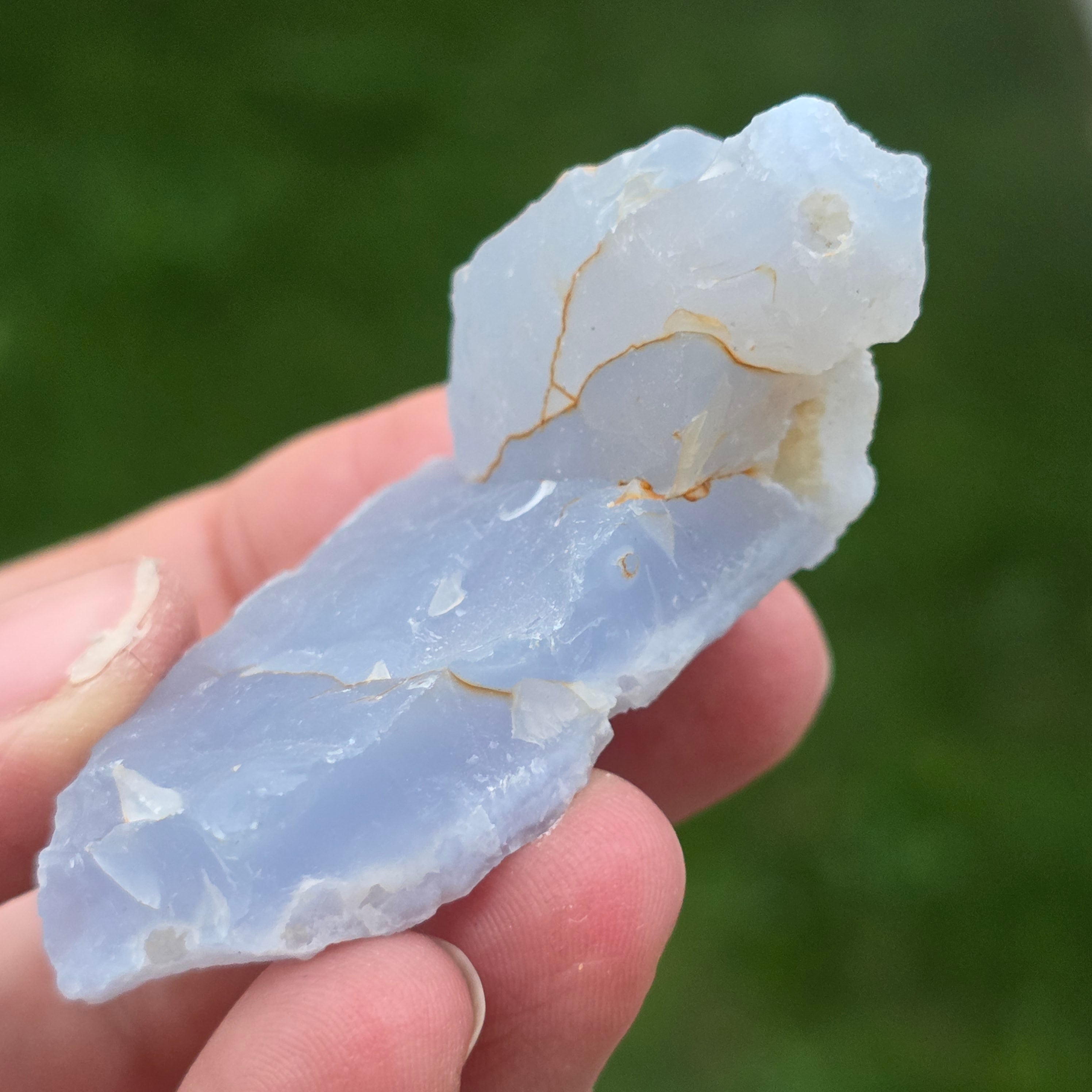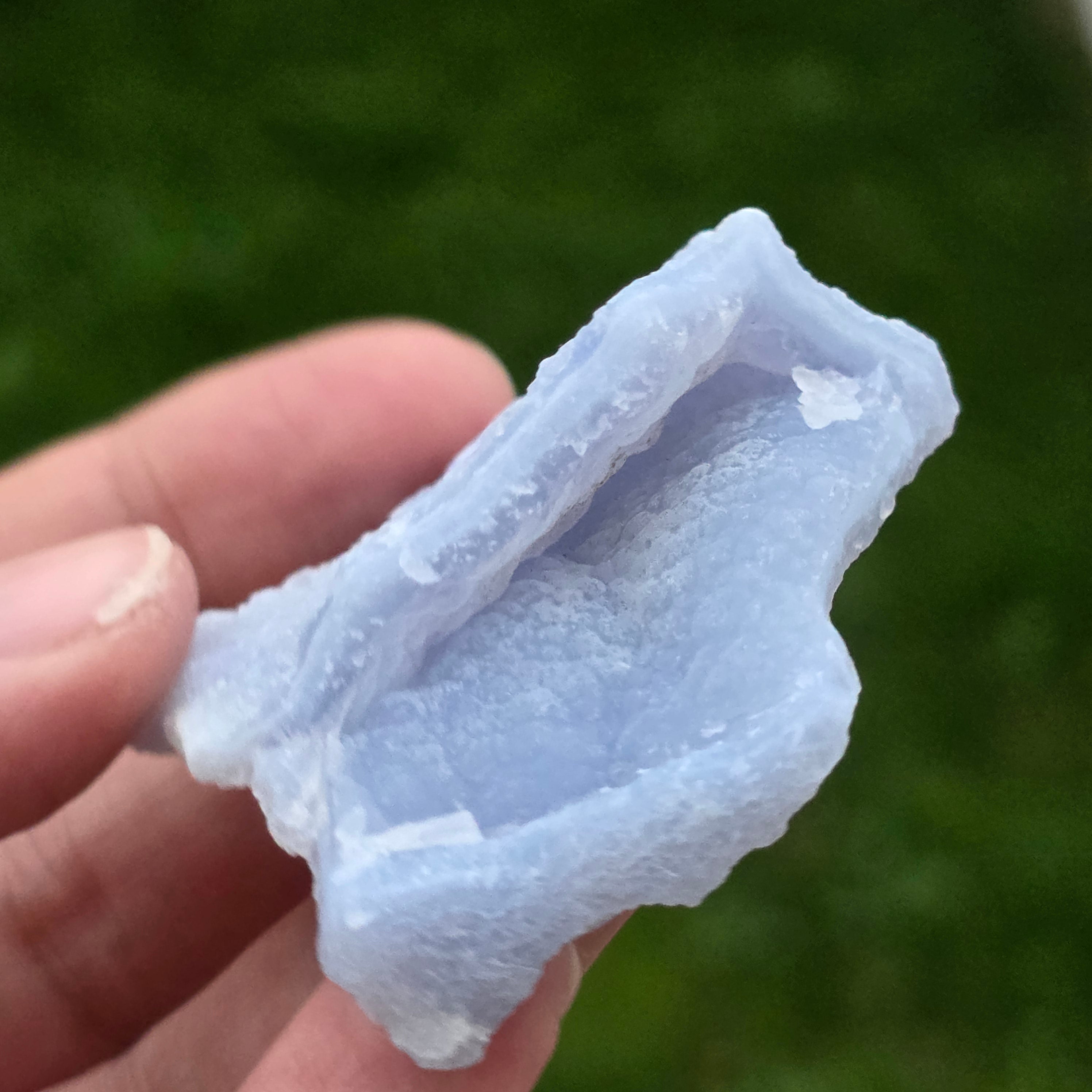 Blauer Chalcedon wird im Allgemeinen mit Kommunikation, Selbstausdruck und Wahrheit in Verbindung gebracht und kann helfen, authentische Kommunikation zu fördern.