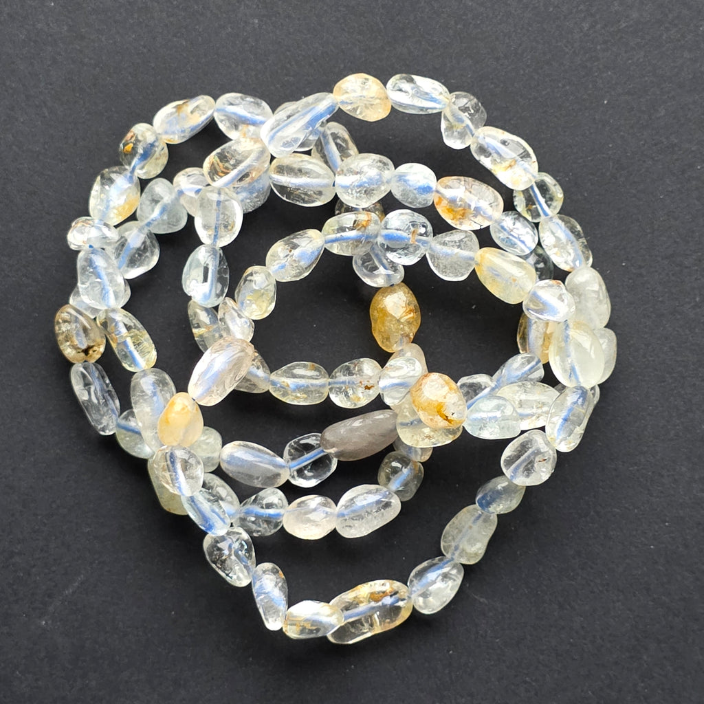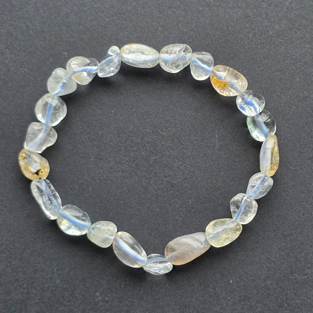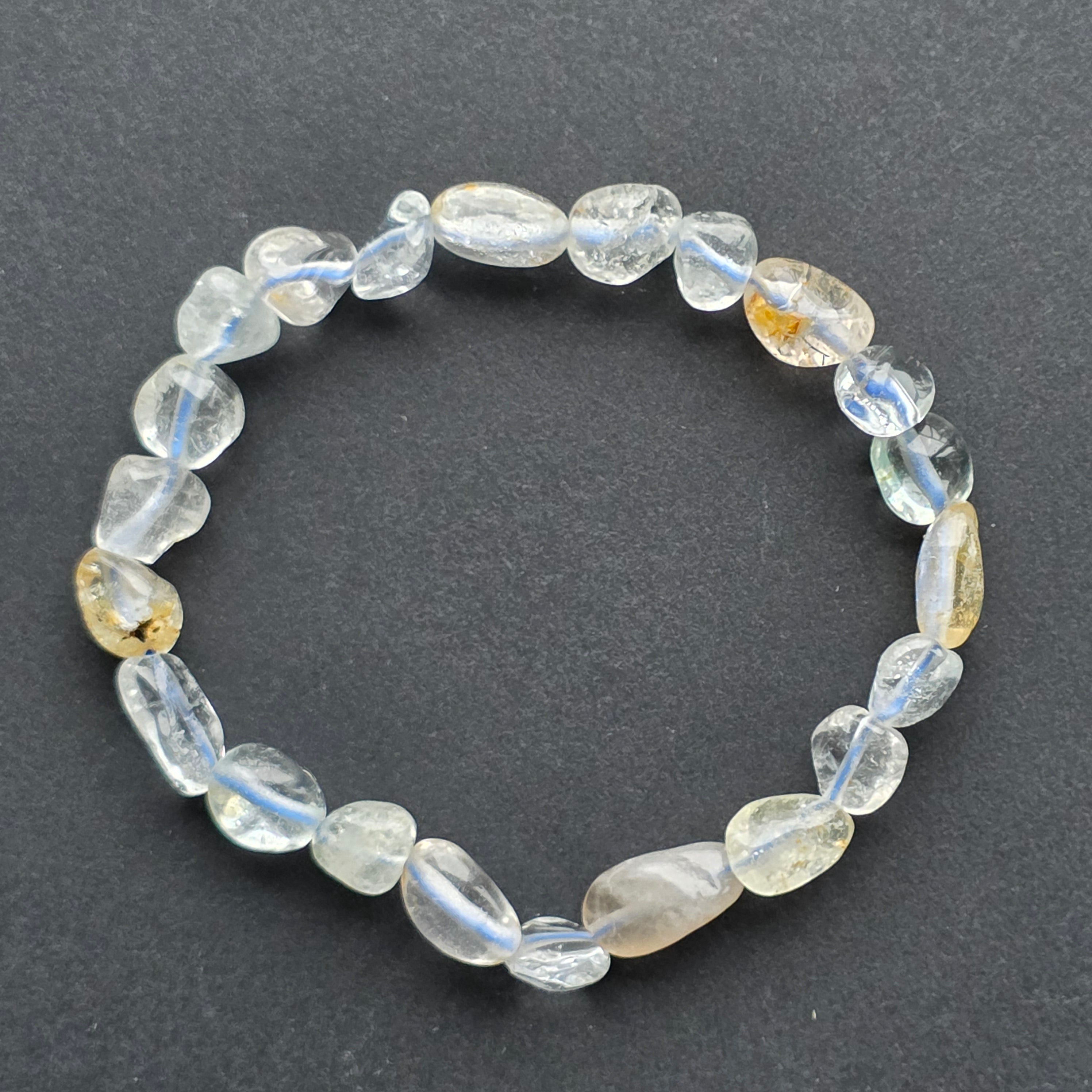 Brățara din topaz Tumble este o celebrare a luminii în forma ei cea mai pură. Pietricelele netede, rotunjite natural, creează un joc delicat de nuanțe – albastru pal, galben cald și fragmente translucide care surprind lumina asemenea valurilor ce se sparg pe nisip. Fiecare bucățică de topaz are o formă organică unică, ca și cum ar păstra în interior povestea propriului drum prin natură.