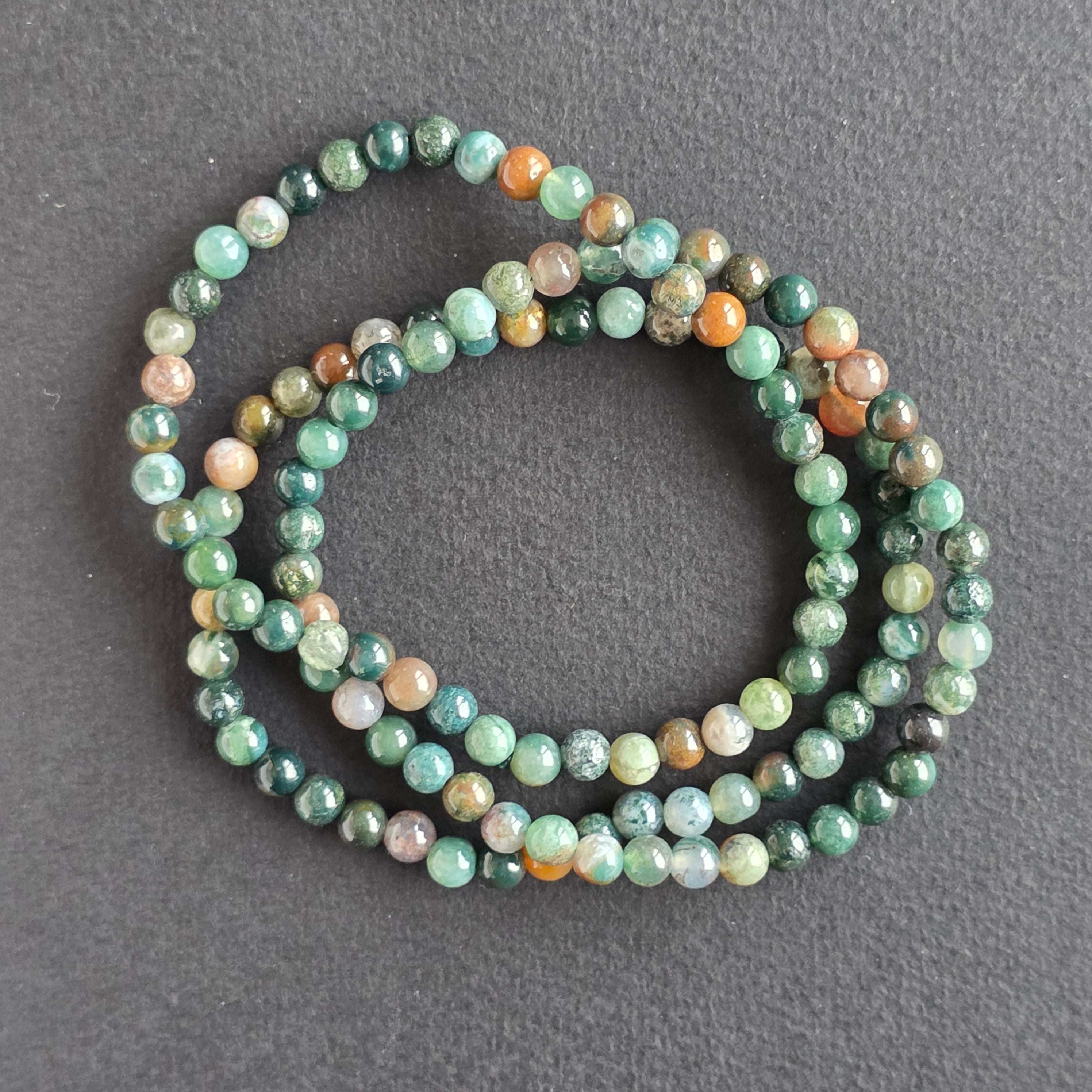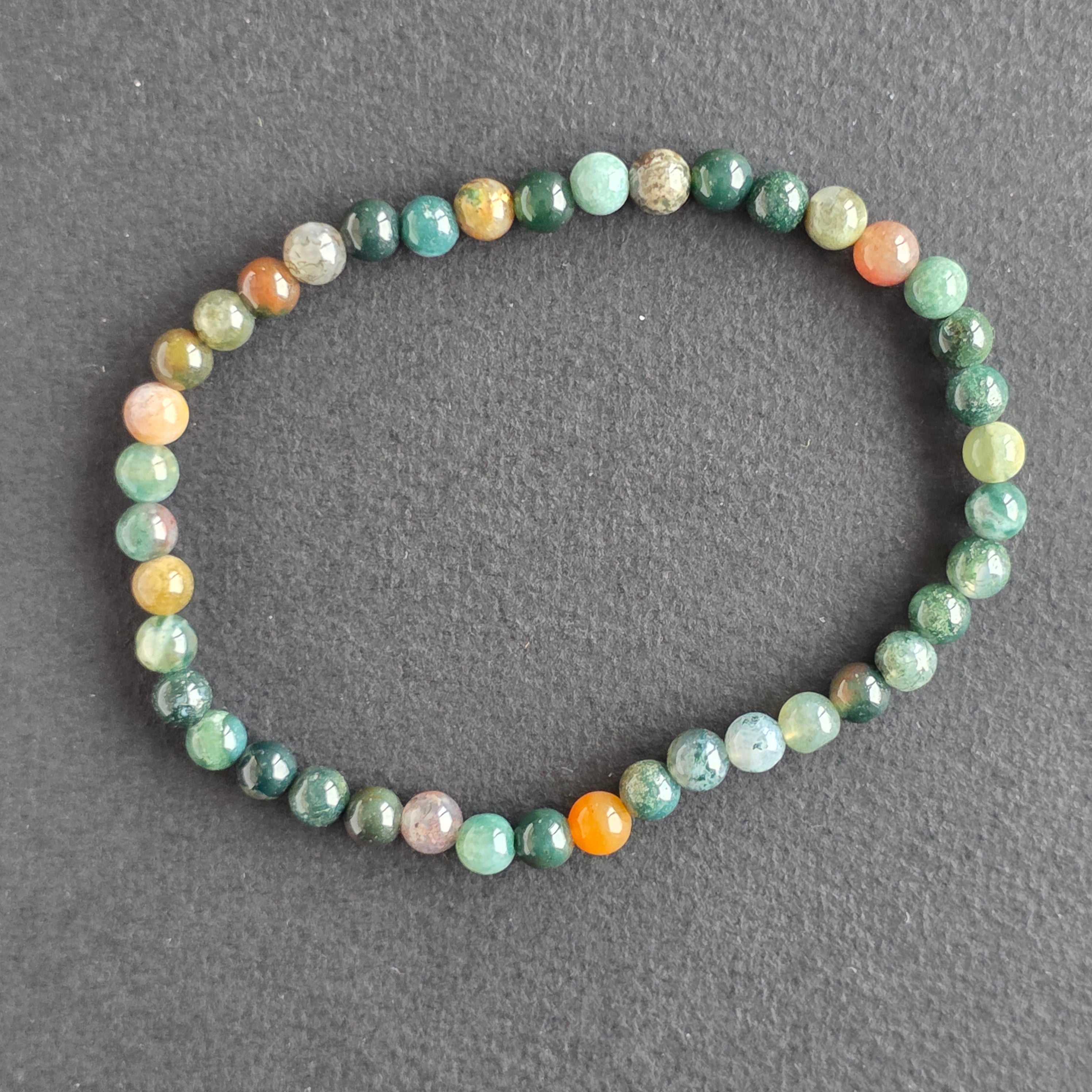 Această brățară din agat indian, realizată din mărgele sferice de 6 mm, impresionează prin diversitatea cromatică subtilă. Nuanțele sale naturale de verde, roșu, brun și gri se împletesc într-un mozaic armonios, fiecare brățară fiind o piesă unică.
