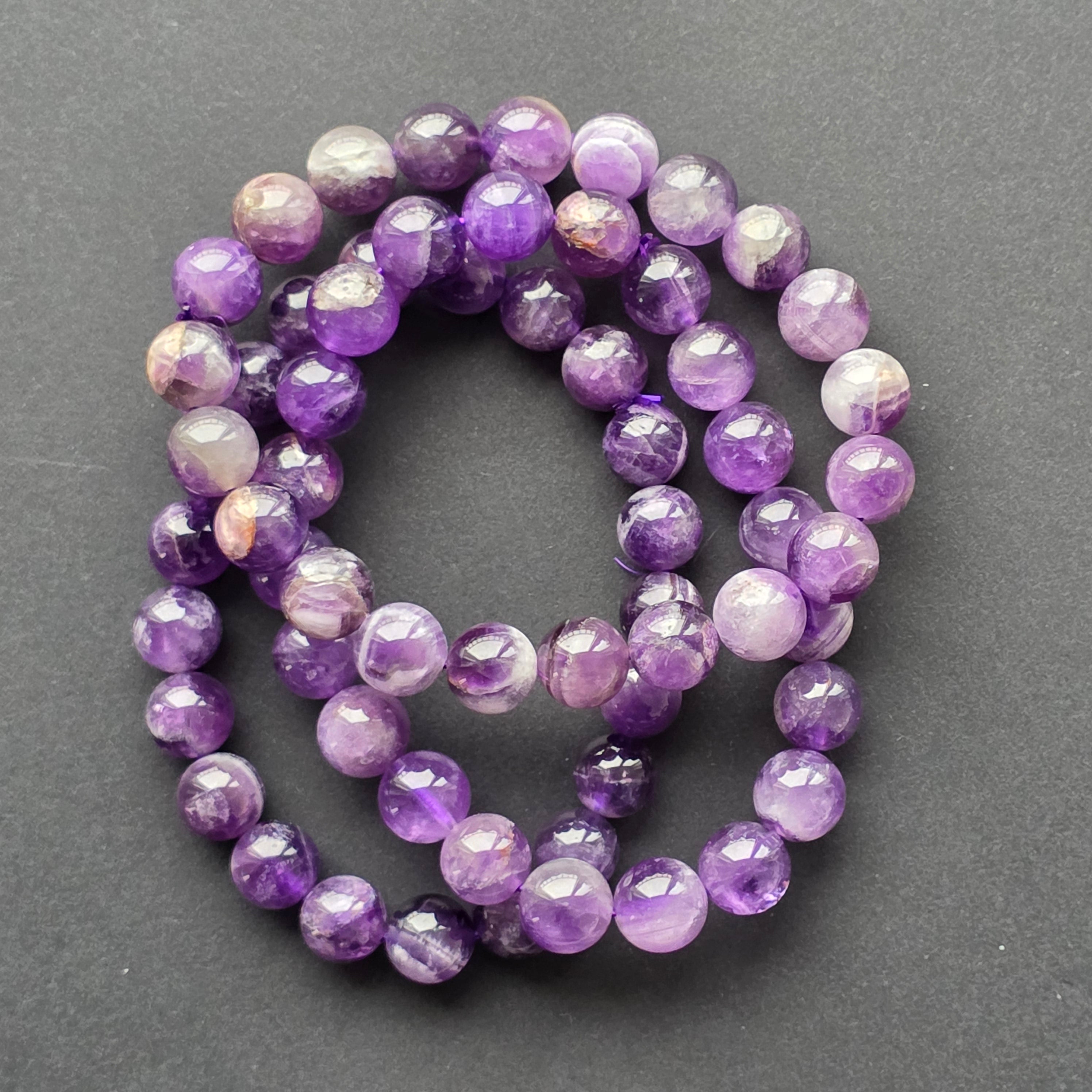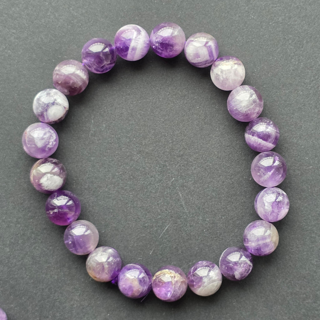 Fiecare mărgea surprinde lumina în reflexii subtile, iar tonurile variate de mov — de la nuanțe profunde până la accente diafane — transformă brățara într-o piesă elegantă, calmă și armonioasă. Este ușor de purtat, fină la încheietură și potrivită atât pentru ținute casual, cât și pentru un stil mai sofisticat.