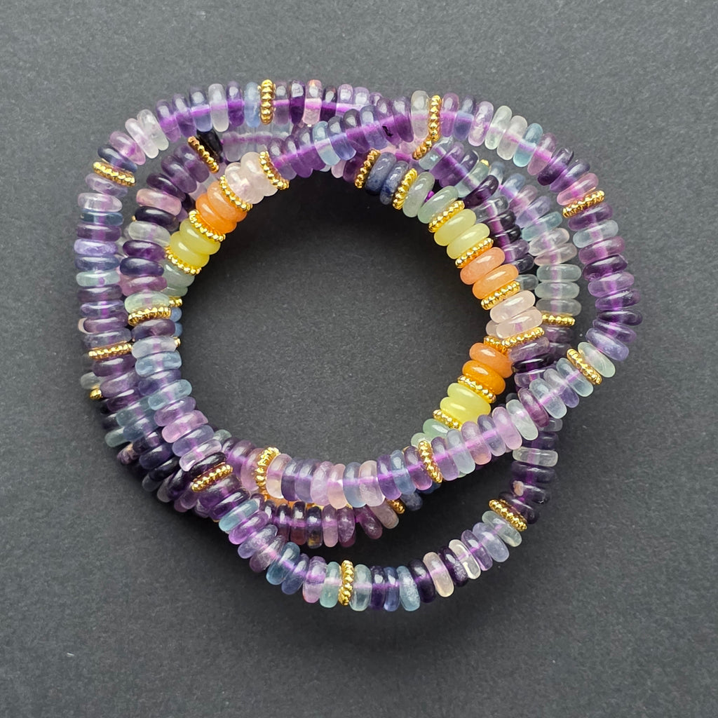 Brățara realizată din fluorină mov se distinge prin transparența ei ușor misterioasă, cu nuanțe care oscilează între liliachiu, violet profund și tonuri reci de ametist. Discurile subțiri formează o structură elegantă, fină, care aduce pe încheietură o estetică calmă și echilibrată.