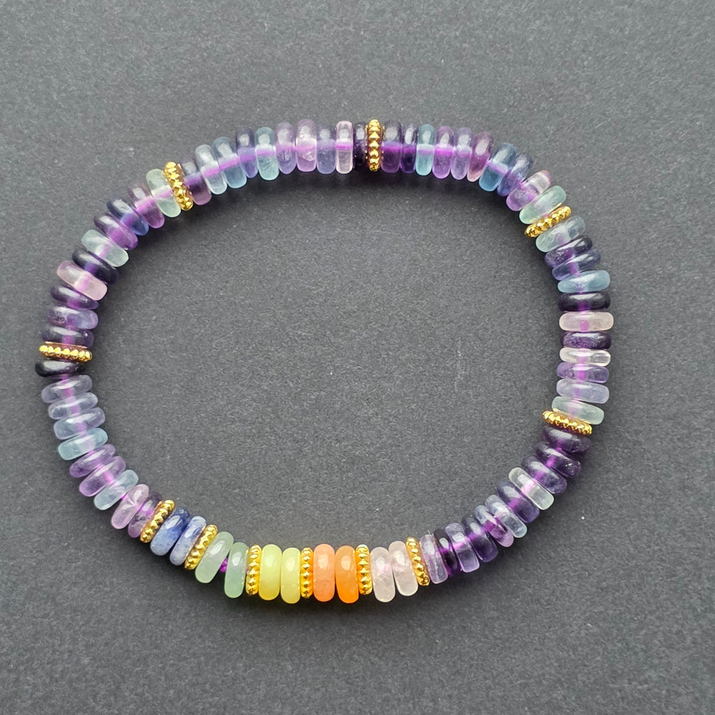 În zona centrală se află un segment dedicat celor 7 chakre, creat din pietre multicolore ce adaugă un accent vibrant și simbolic. Acest contrast dintre movul eteric al fluorinei și culorile calde ale chakrelor creează o brățară ce radiază armonie, expresivitate și sensibilitate vizuală.