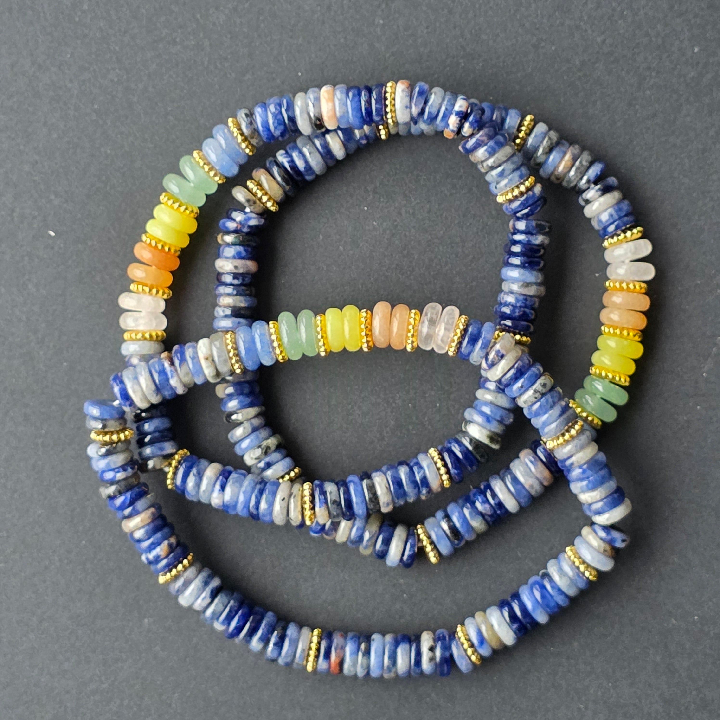 Segmentul central, alcătuit din pietre în culorile celor 7 chakre, aduce o notă vibrantă și echilibrată, simbolizând călătoria interioară și armonia personală. Contrastul dintre albastrul profund și tonurile calde ale chakrelor creează un design modern, care poate fi purtat atât ca accesoriu de zi cu zi, cât și în combinații creative cu alte brățări.