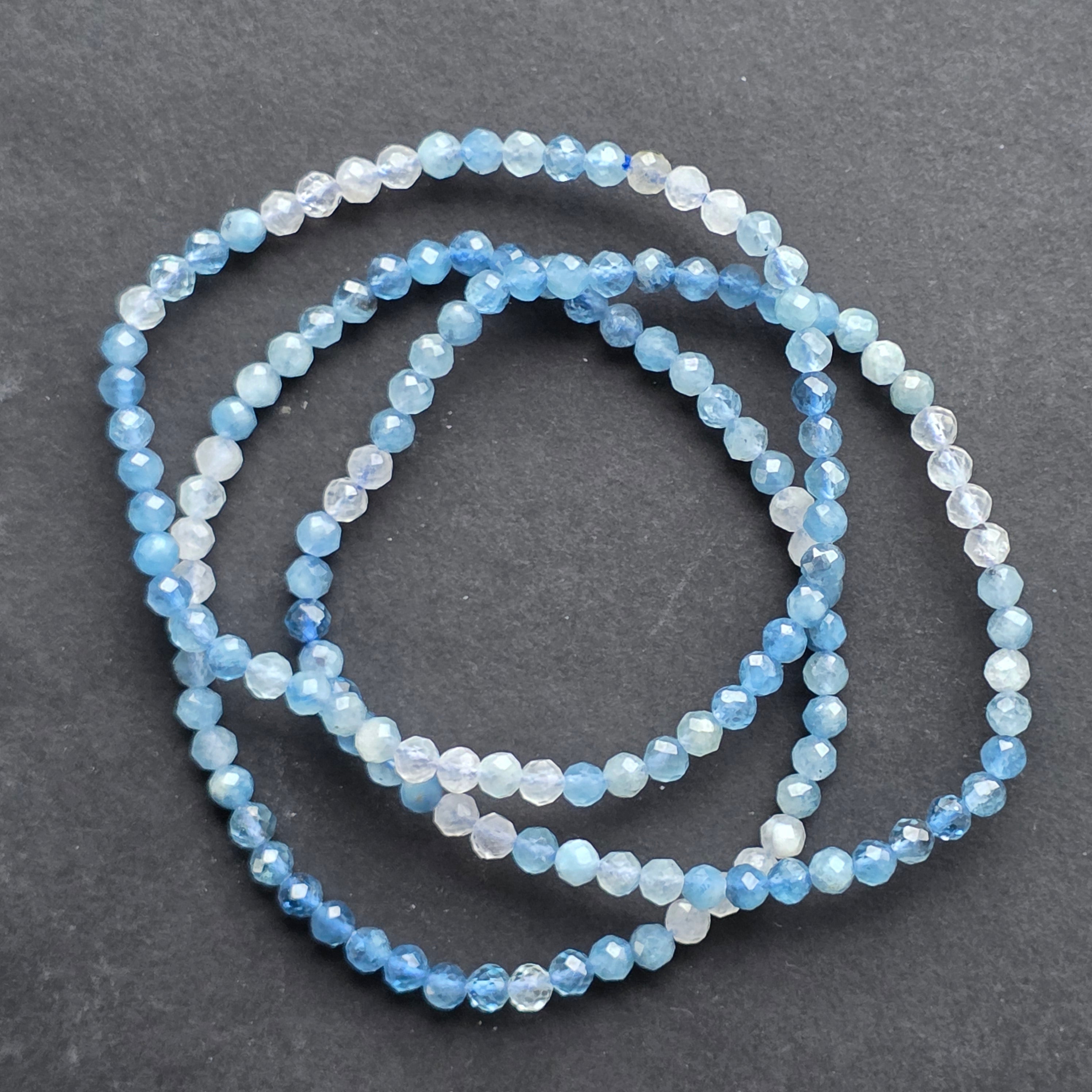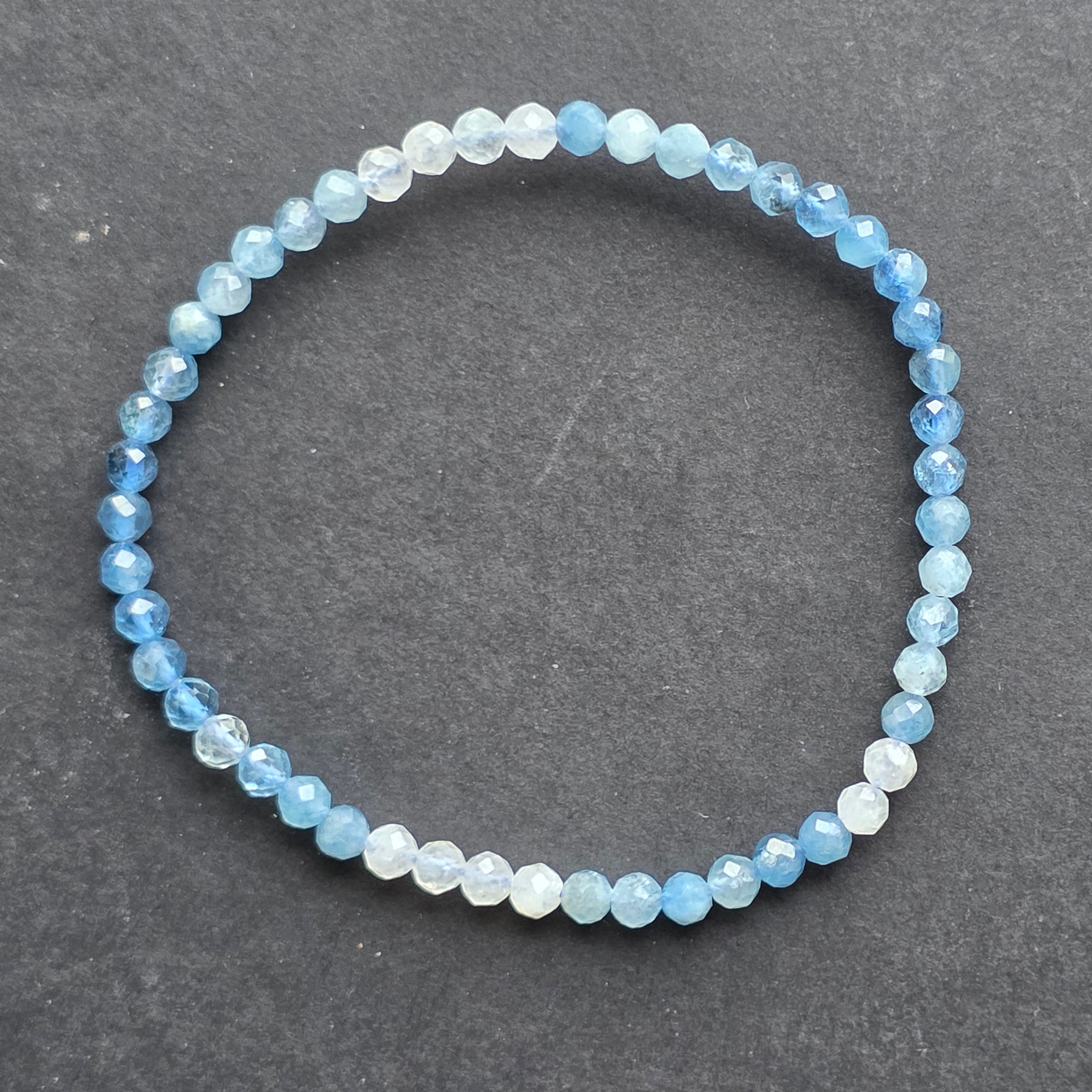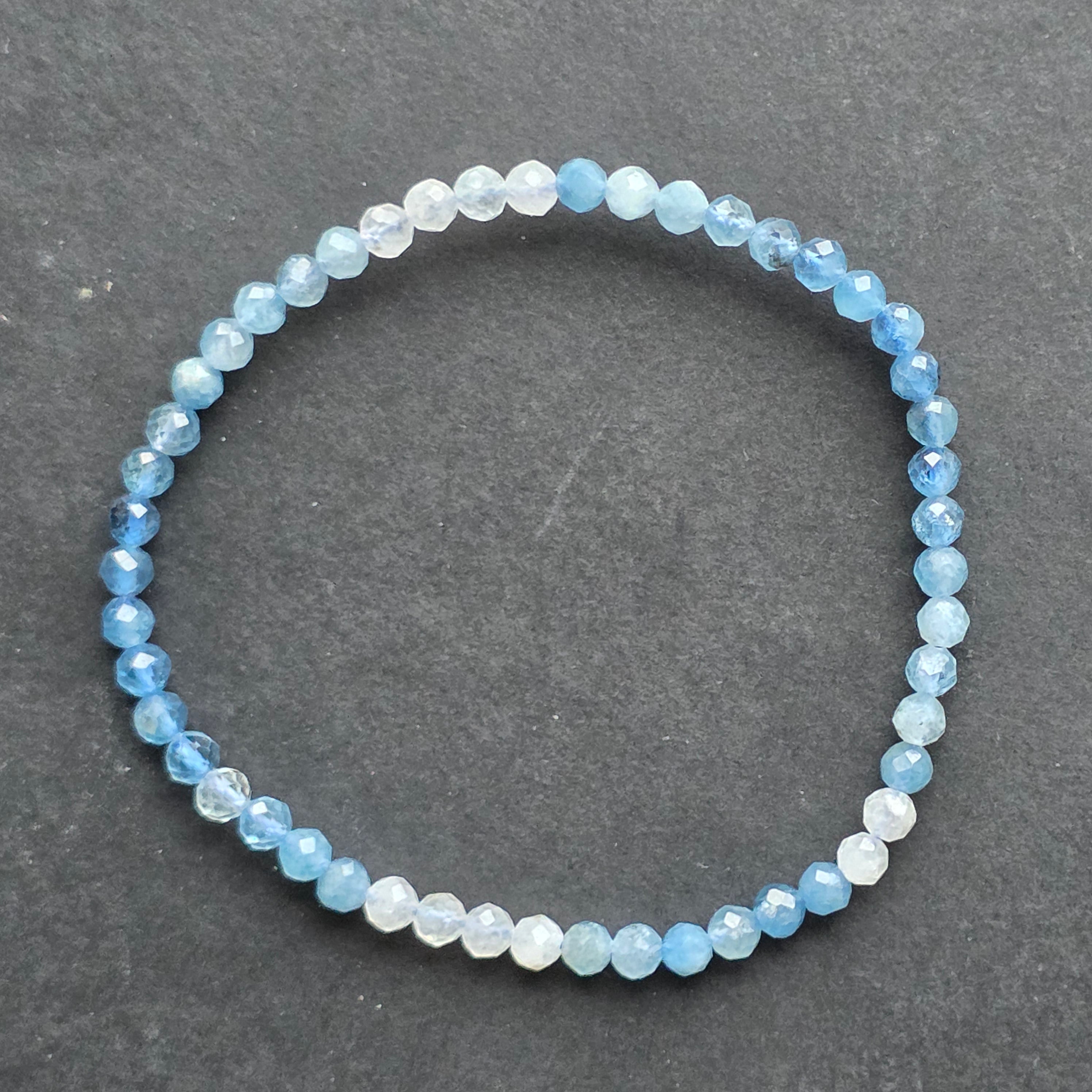 O brățară ca o respirație a mării, purtând reflexele blânde ale luminii care se joacă pe valuri. Mărgelele fațetate de acvamarin natural, cu diametrul de 4 mm, surprind toate nuanțele de albastru diafan – de la tonuri palide, translucid-cristaline, până la umbre ușor verzui care evocă adâncimea apelor tropicale. Este o bijuterie a calmului și a curajului interior, o amintire constantă a echilibrului dintre inimă și rațiune.
