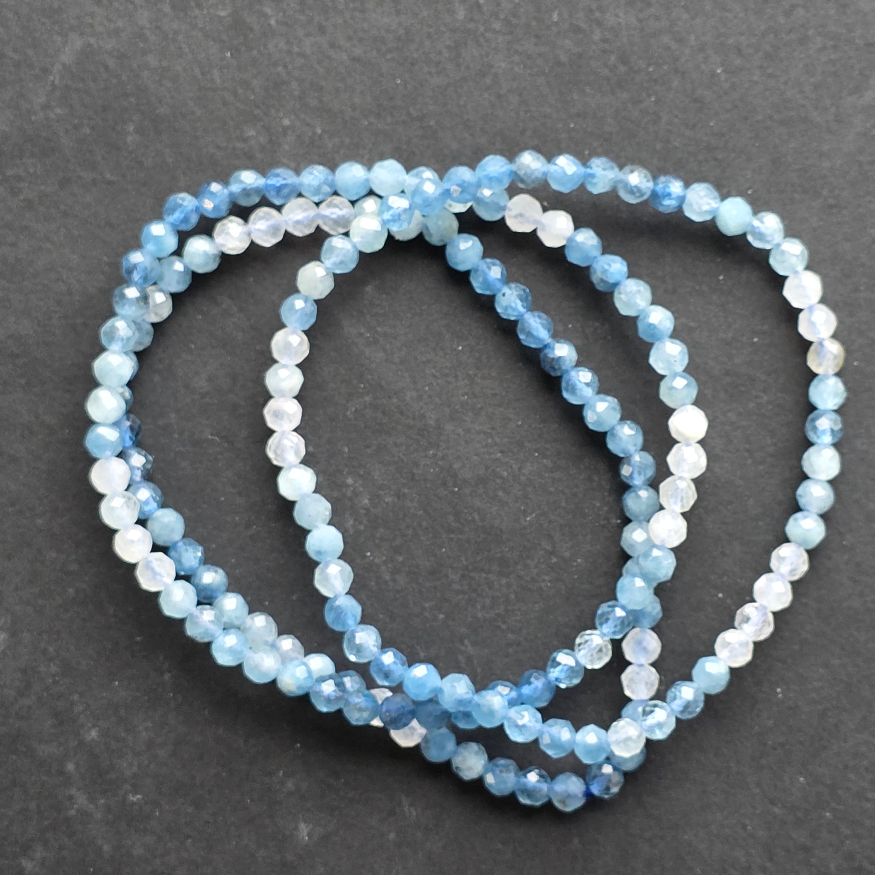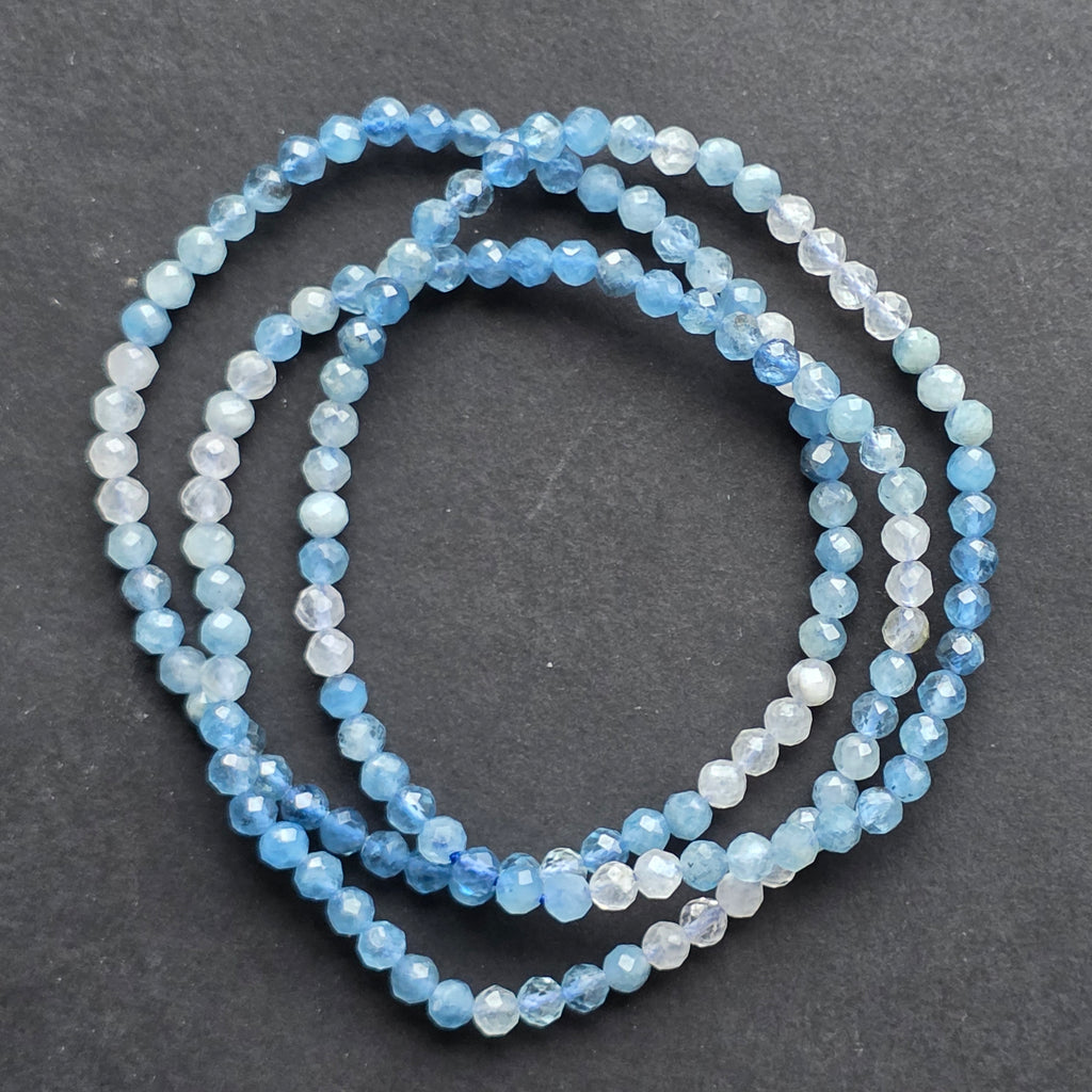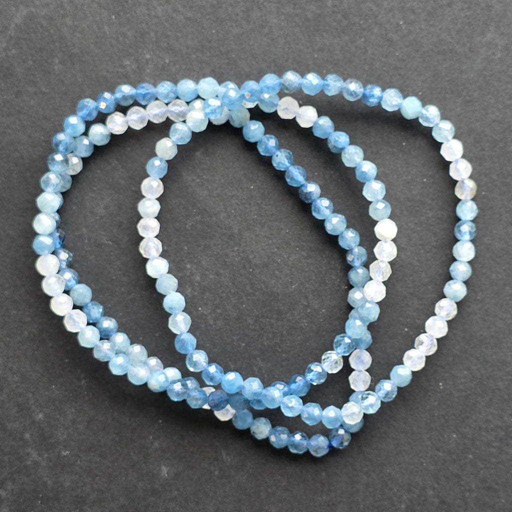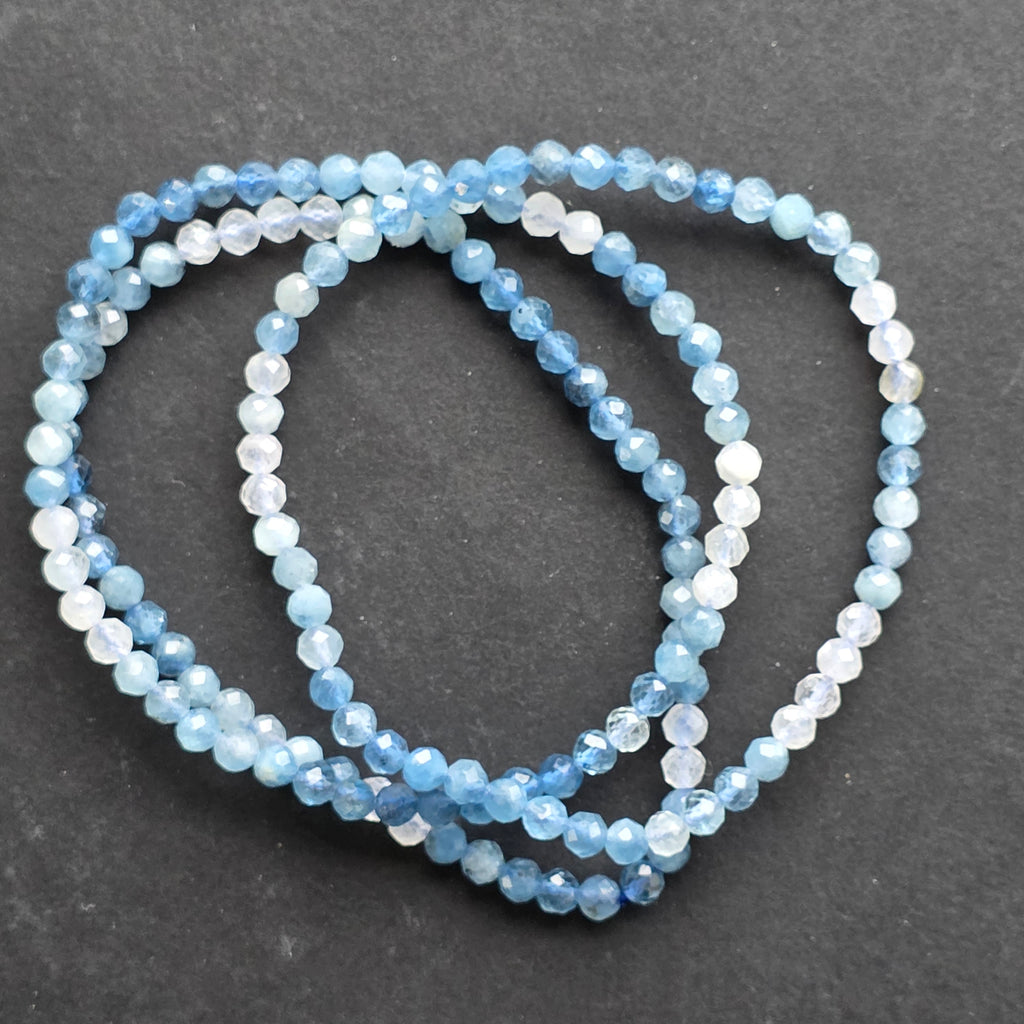 O brățară ca o respirație a mării, purtând reflexele blânde ale luminii care se joacă pe valuri. Mărgelele fațetate de acvamarin natural, cu diametrul de 4 mm, surprind toate nuanțele de albastru diafan – de la tonuri palide, translucid-cristaline, până la umbre ușor verzui care evocă adâncimea apelor tropicale. Este o bijuterie a calmului și a curajului interior, o amintire constantă a echilibrului dintre inimă și rațiune.