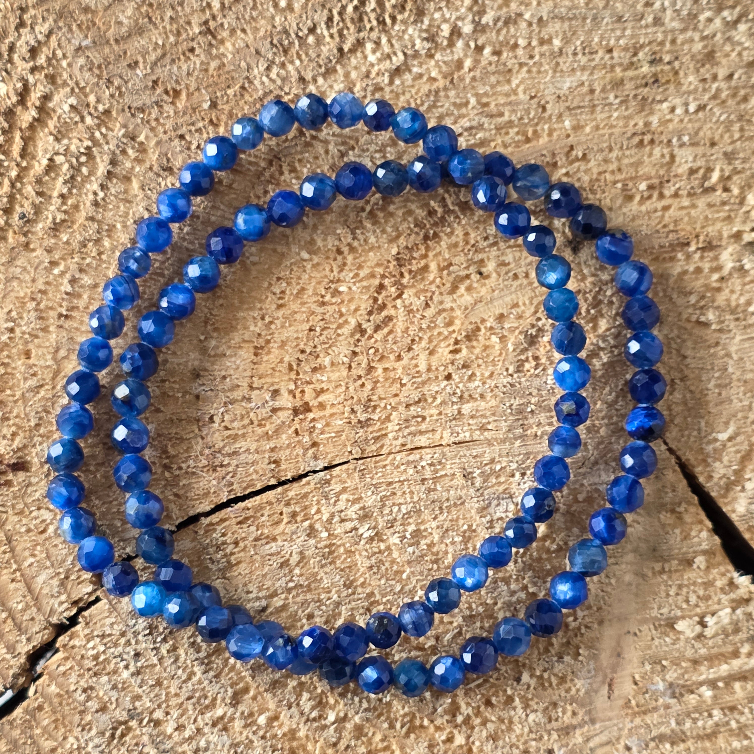 O brățară care poartă adâncimea cerului și liniștea valurilor. Mărgelele fațetate de kyanit natural, cu diametrul de 4 mm, reflectă nuanțe fascinante de albastru intens, uneori străbătute de umbre argintii sau linii deschise ce amintesc de textura cristalină a gheții. Este o bijuterie rafinată și plină de prezență, creată pentru cei care caută claritate, armonie și conectare la adevărul propriu.