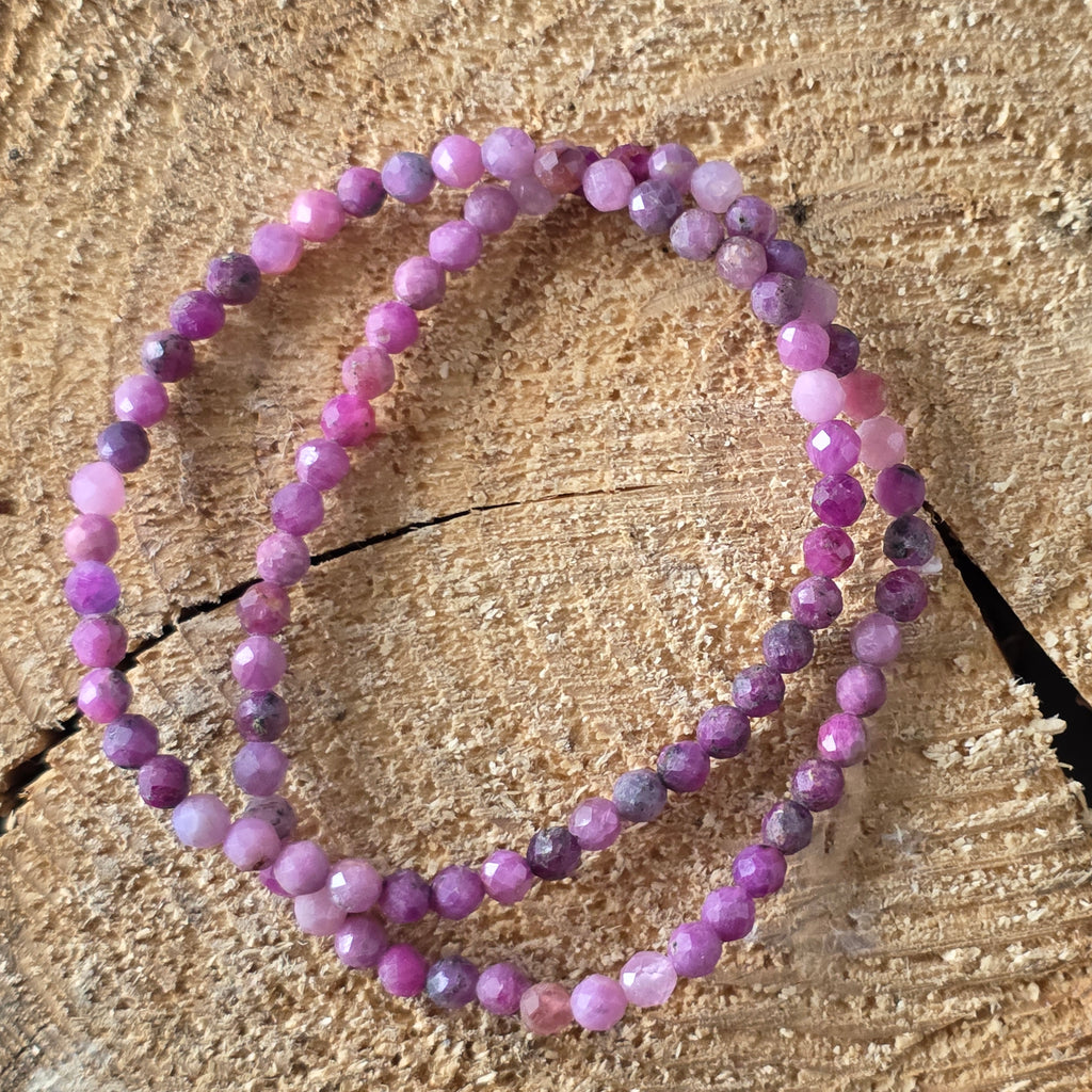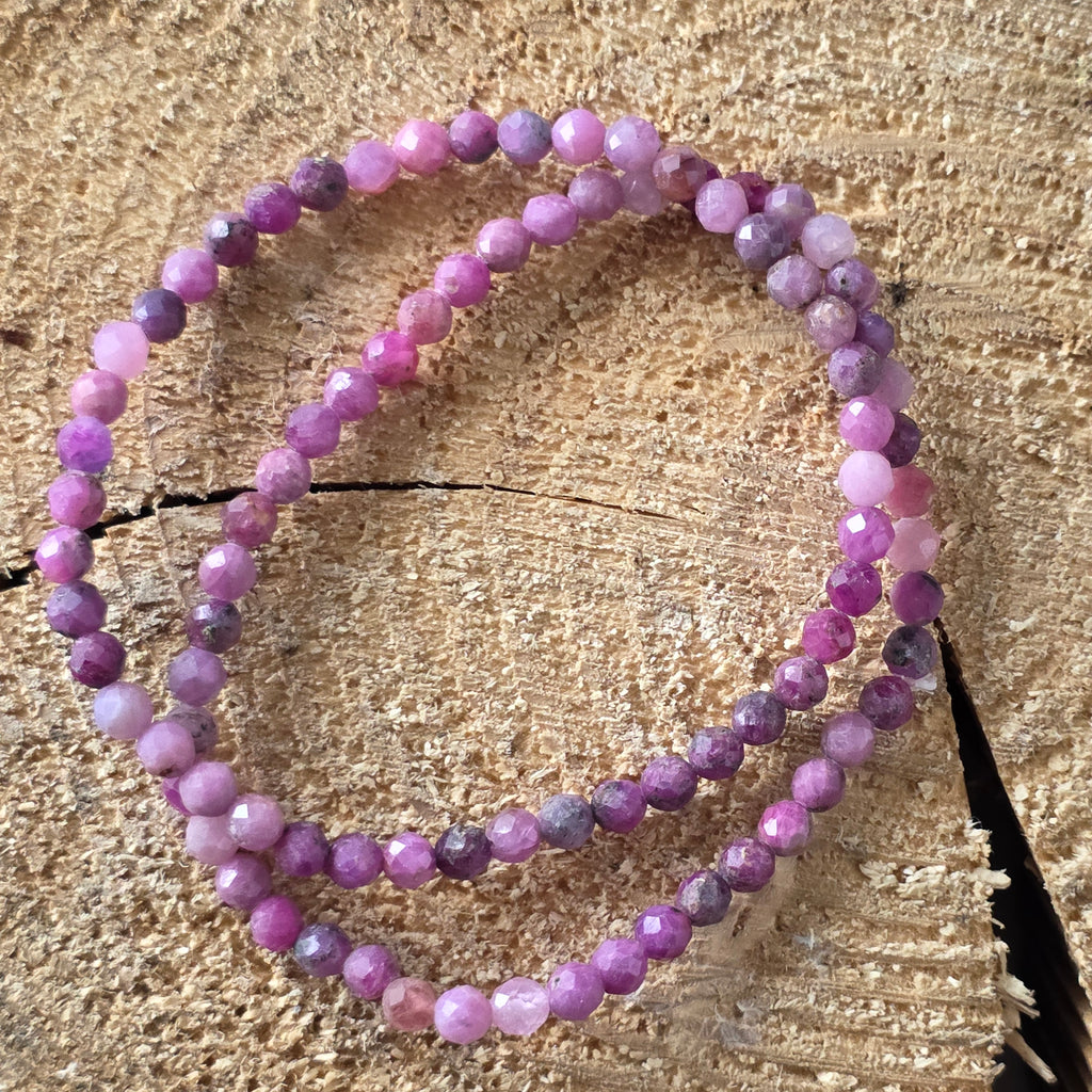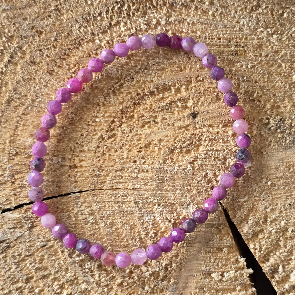 O brățară care poartă în ea flacăra vie a vieții. Mărgelele fațetate de rubin natural, cu diametrul de 4 mm, strălucesc în tonuri bogate de roșu intens, uneori cu accente purpurii sau reflexe profunde de vișiniu. Fiecare piatră pare să pulseze cu o energie caldă, vitală, asemenea unei inimi care bate în ritmul propriei chemări.