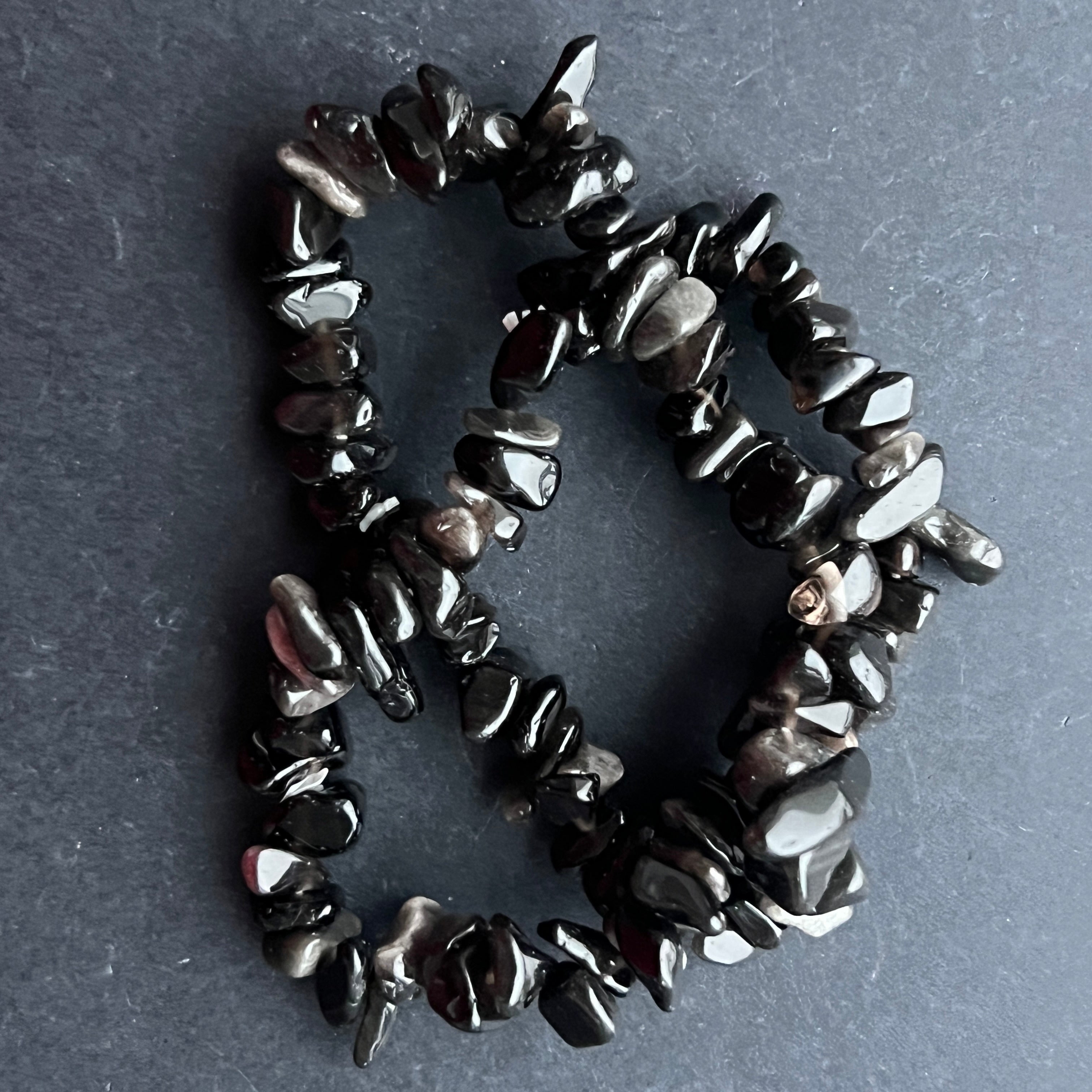 Această brățară din obsidian argintiu, realizată din chipsuri naturale, este o piesă elegantă și misterioasă, ce captează lumina și o reflectă în nuanțe subtile de auriu. Fiecare fragment de piatră are jocuri cromatice unice, transformând brățara într-un accesoriu rafinat și deosebit.
