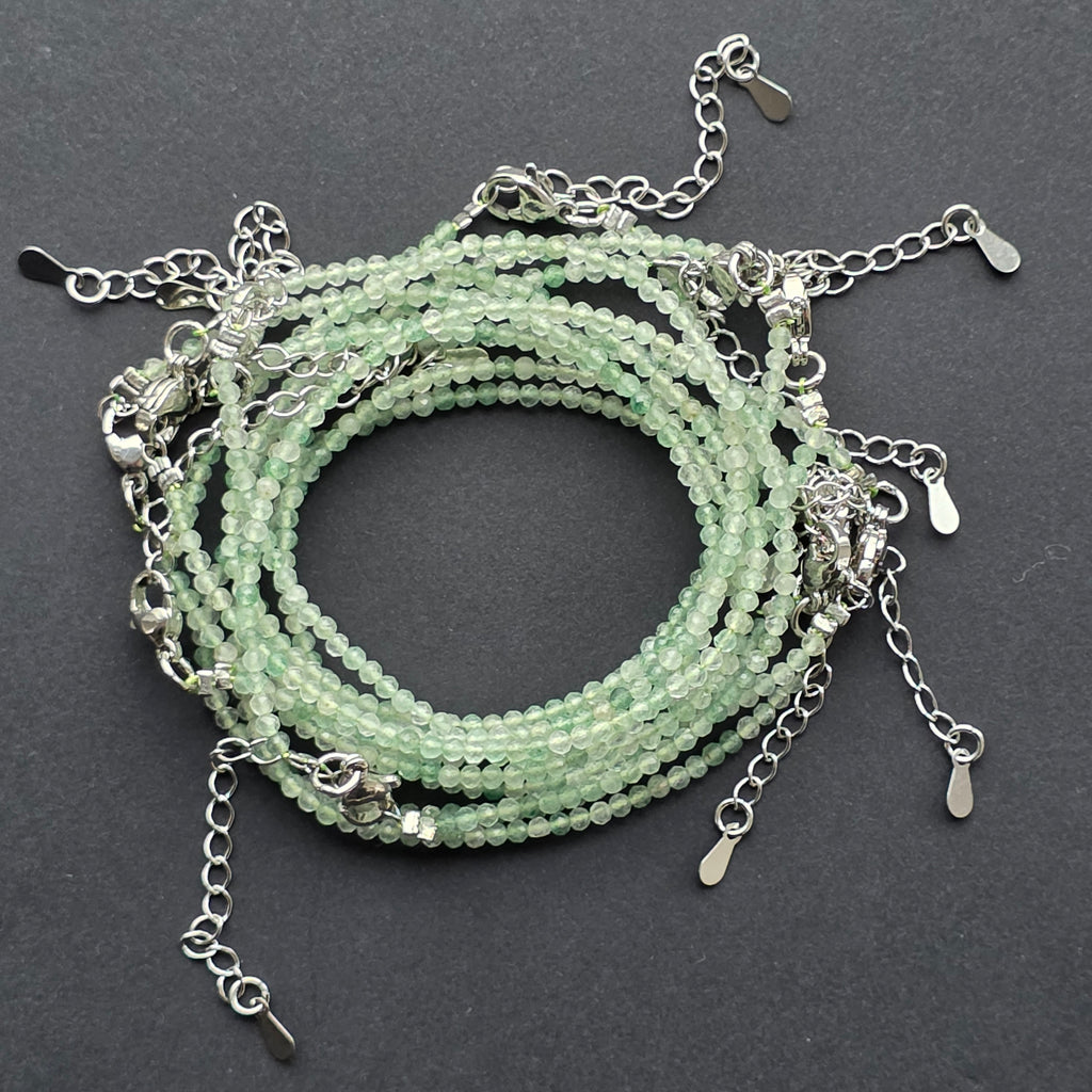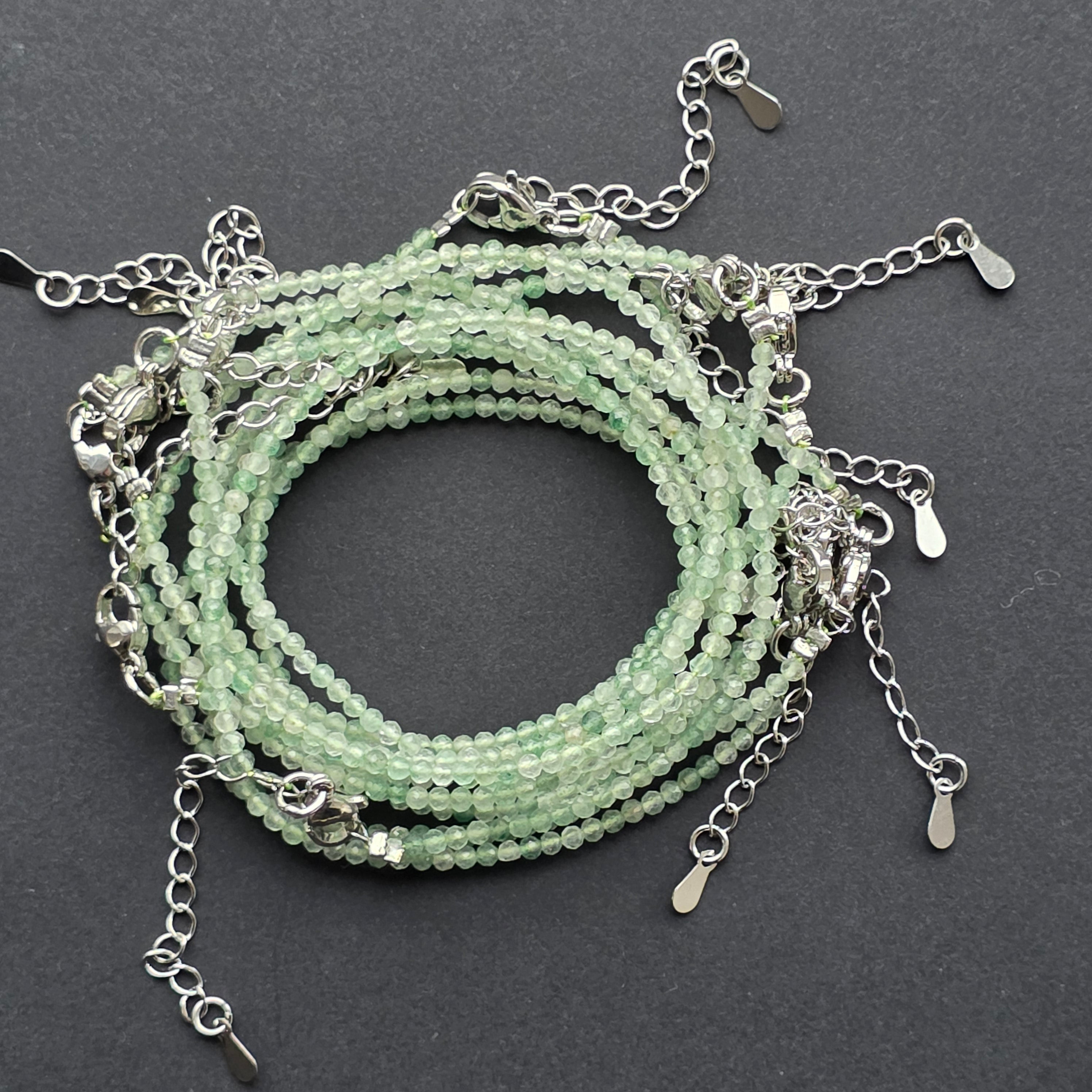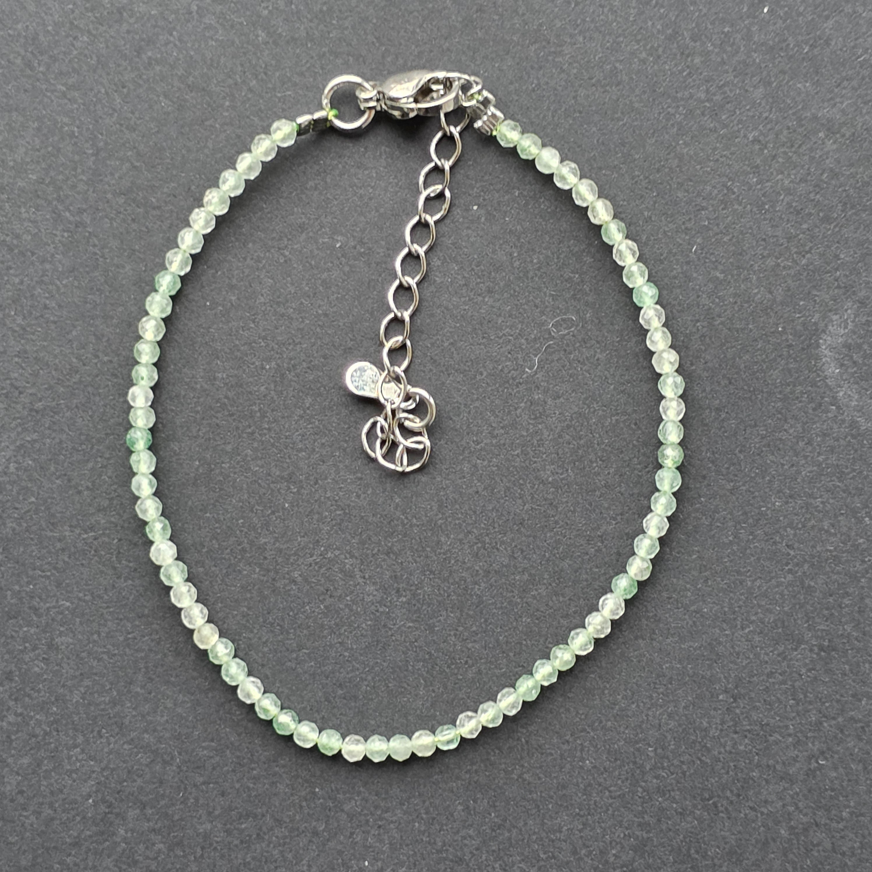 Aventurinul, piatra optimismului și a prospețimii sufletești, își dezvăluie magia în mărgelele sale minuscule de 2 mm, fațetate pentru a surprinde lumina în nuanțe verzi, fine ca un început de primăvară. Brățara pare aproape pictată în tonalități blânde — o respirație calmă, o energie lină, discretă, dar mereu prezentă.