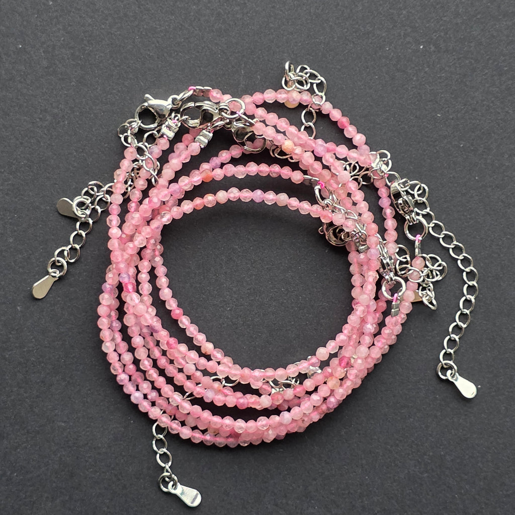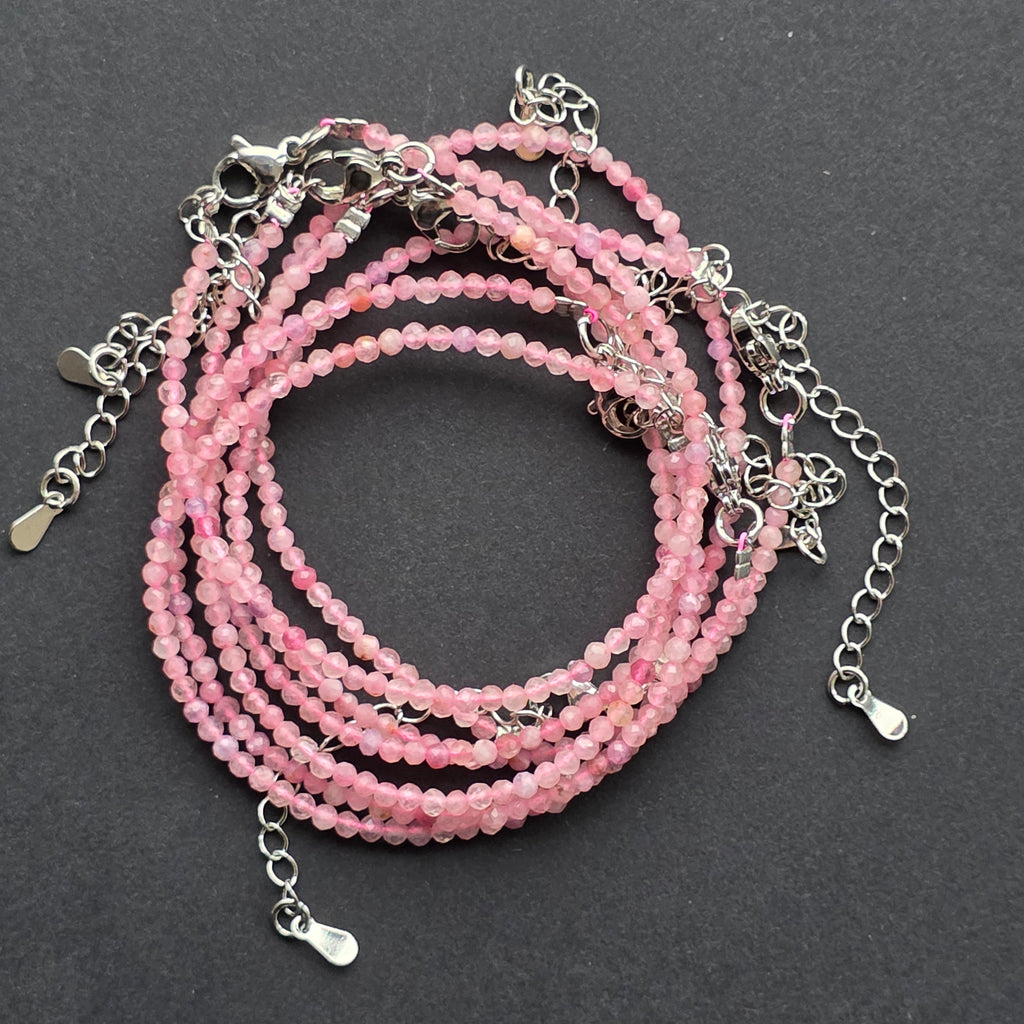 Cuartul roz este una dintre cele mai îndrăgite pietre ale lumii minerale, cunoscut pentru delicatețea și lumina sa caldă. În această variantă „mix”, fiecare mărgea păstrează o nuanță ușor diferită — de la roz lapte foarte deschis până la rose pudrat sau transparent, ca reflexele unei dimineți liniștite. Cu dimensiuni fine de doar 2 mm, mărgelele fațetate surprind lumina într-un mod discret, asemenea unor picături ce pulsează cu blândețe.