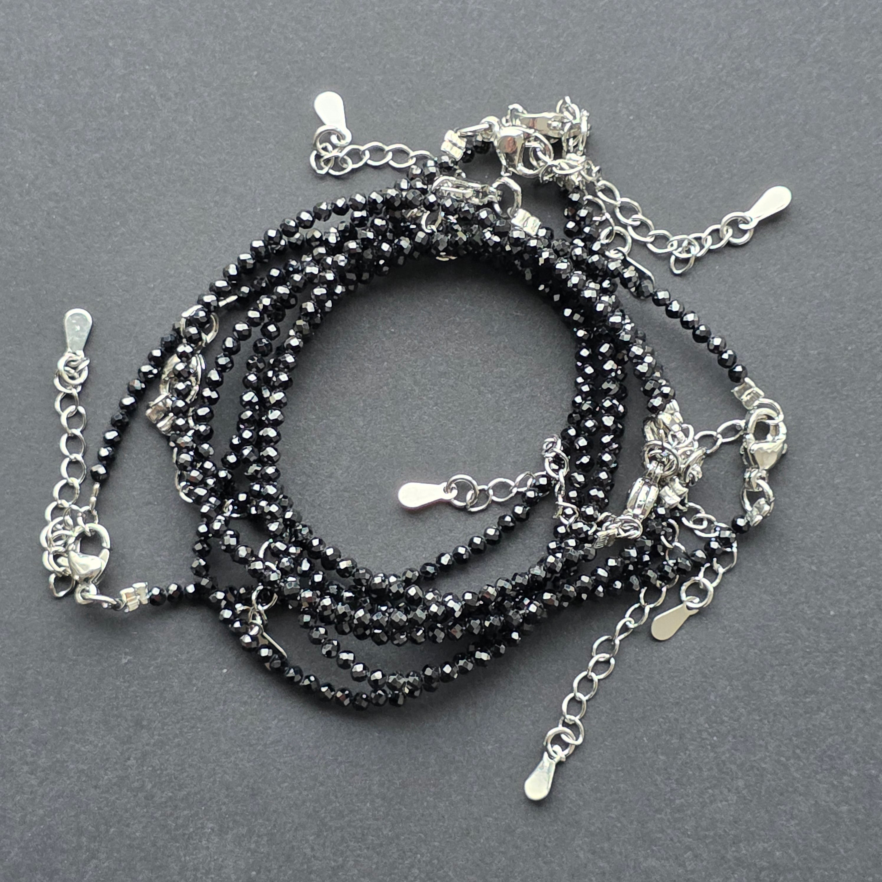 În această brățară delicată, spinelul negru se dezvăluie într-o strălucire aparte — profundă, densă și impecabilă. Mărgelele fine de 2 mm, fațetate cu precizie, transformă lumina în reflexe discrete, aproape hipnotice, ca o noapte limpede în care fiecare mișcare aprinde o scânteie tăcută.
