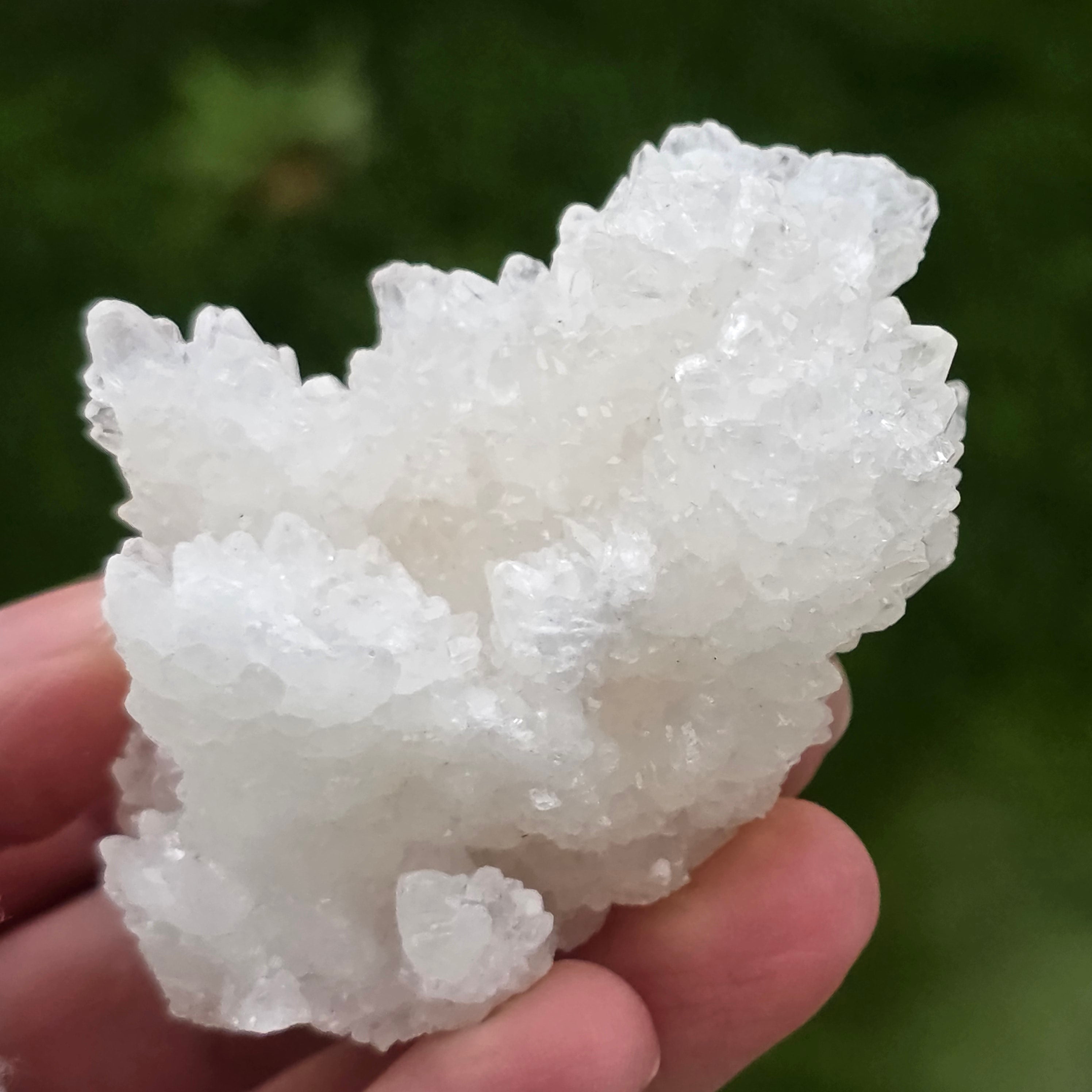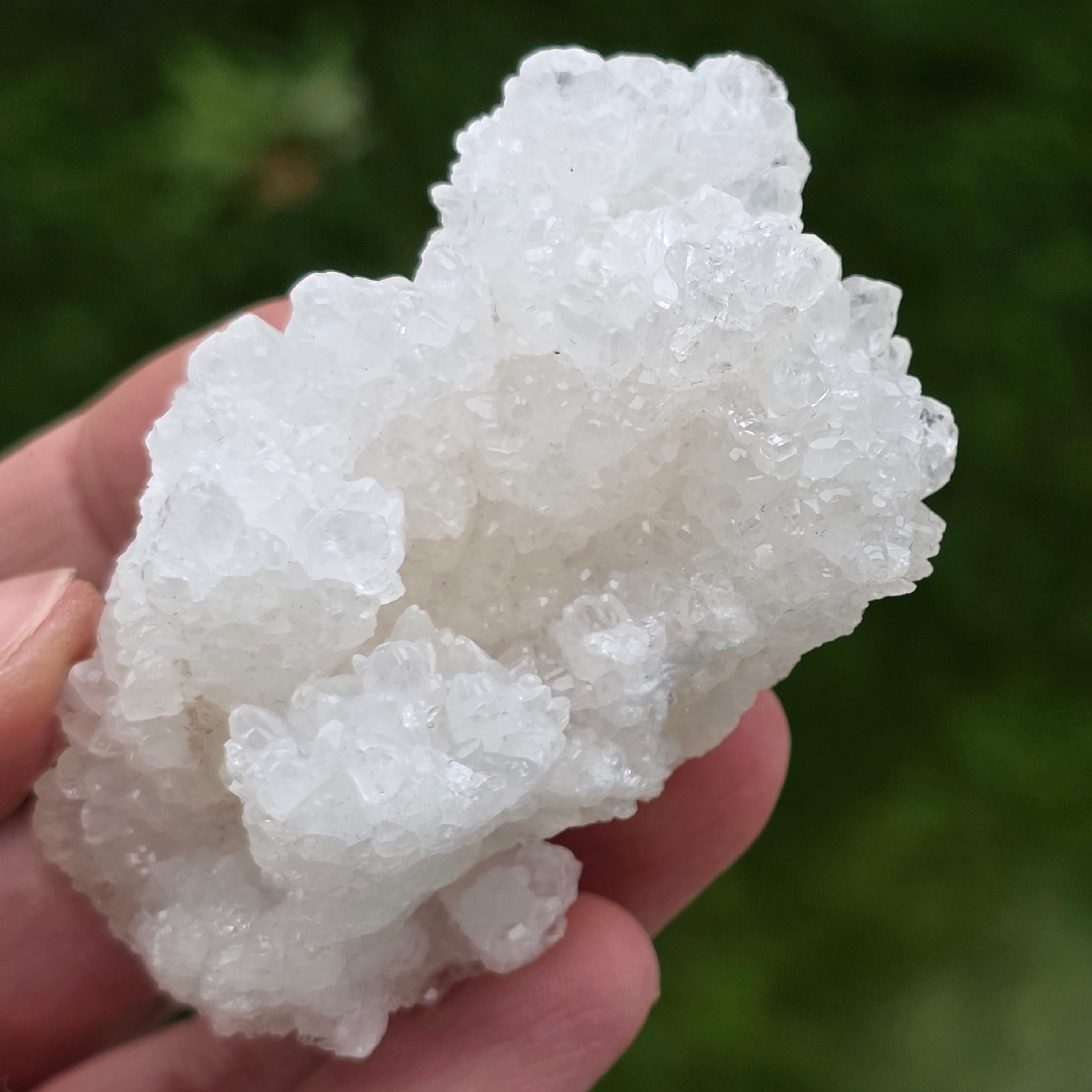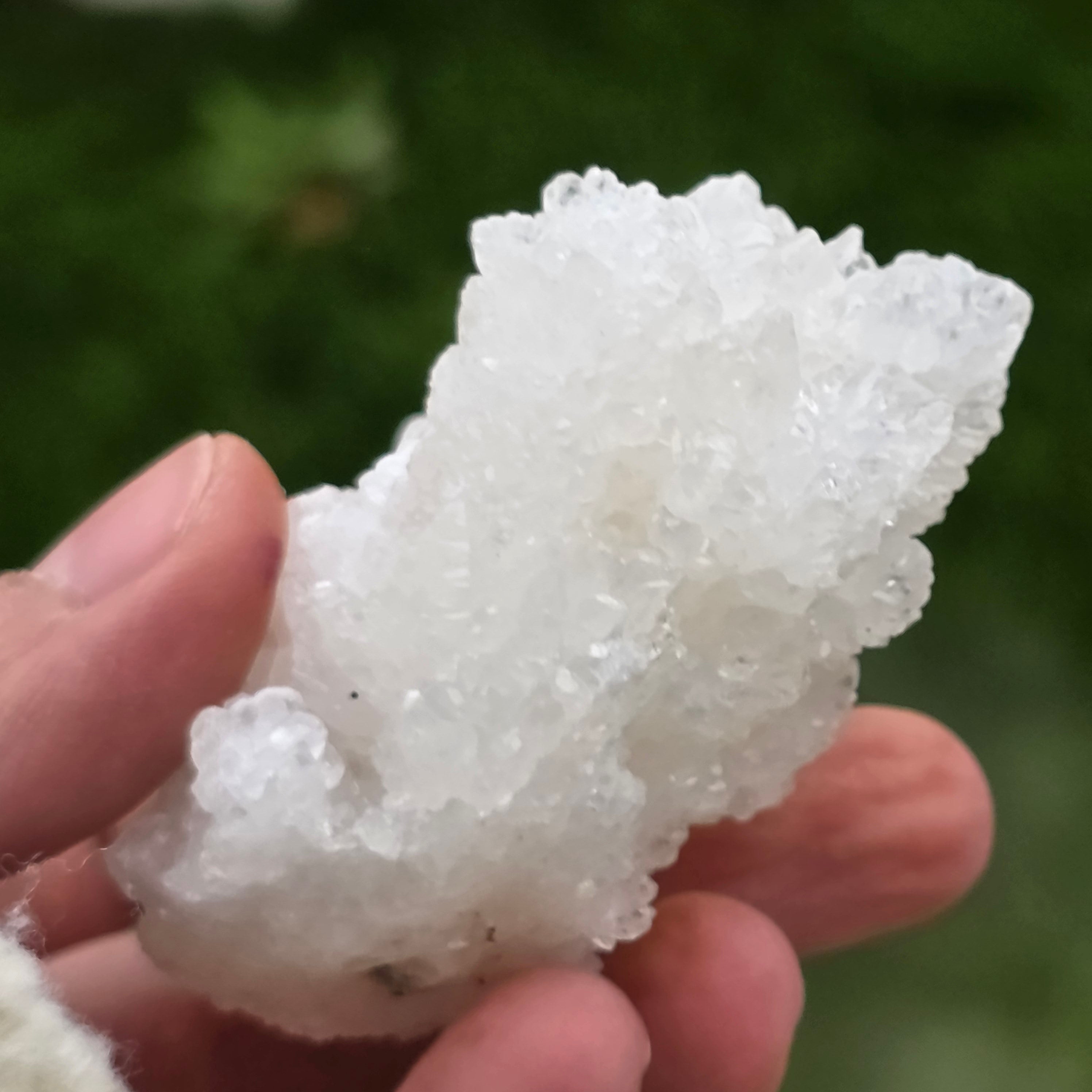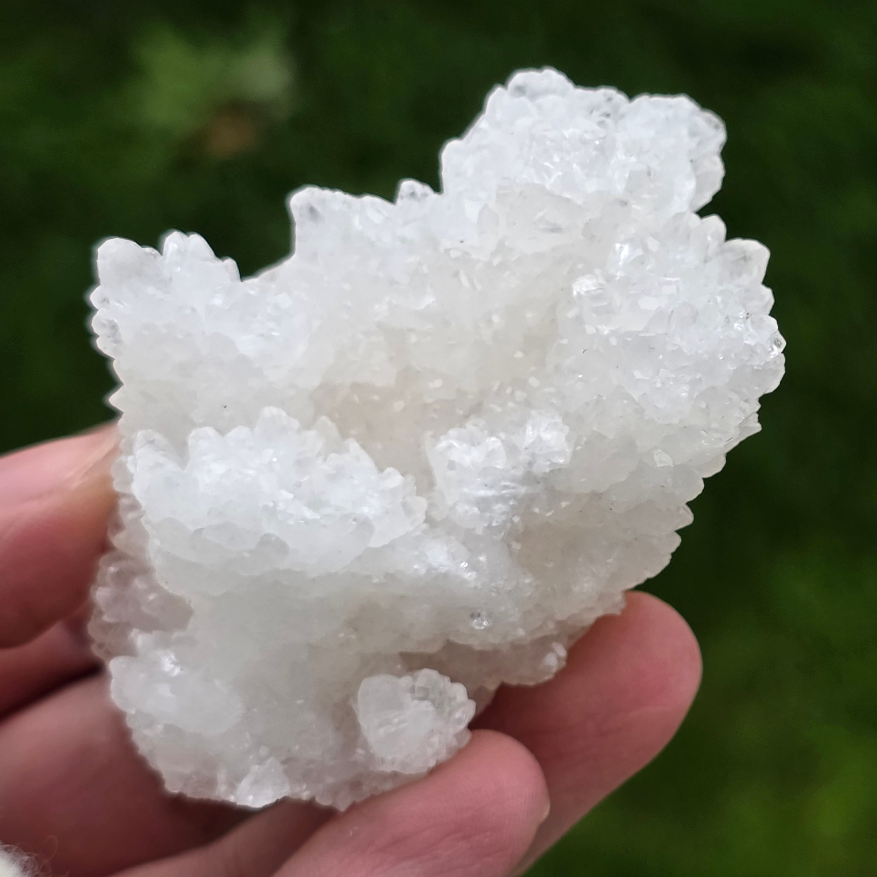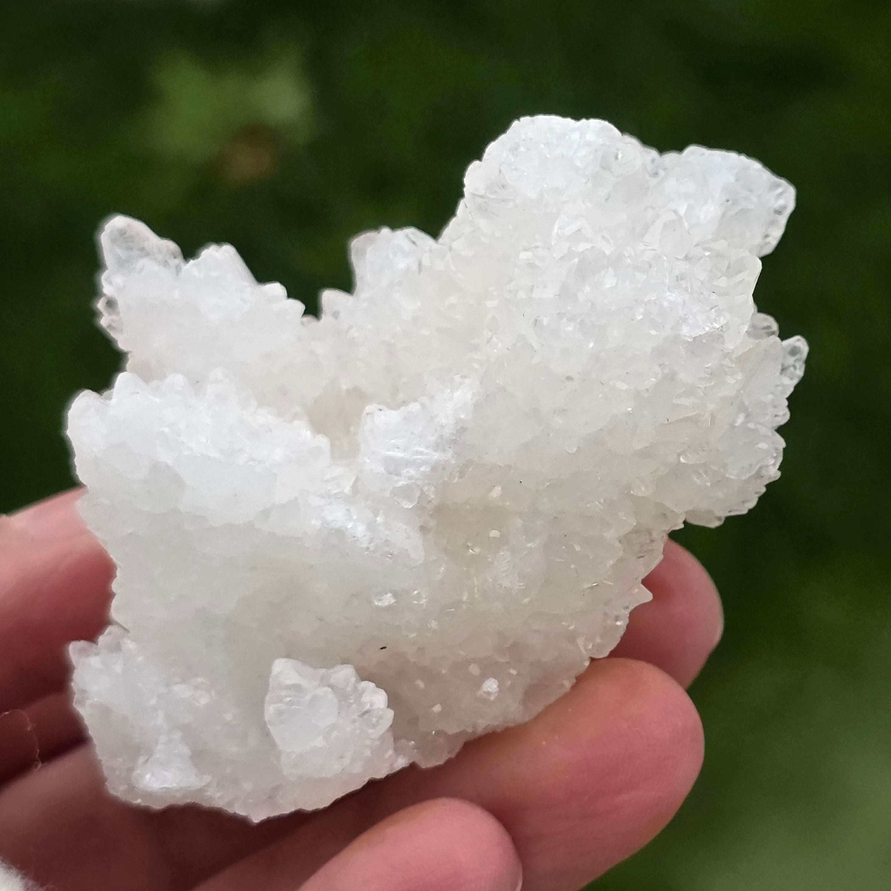 Cristalele sunt dispuse în structuri neregulate, rotunjite, cu suprafețe ușor sclipitoare, amintind de formațiuni întâlnite în interiorul peșterilor. Textura bogată și volumul bine definit conferă fiecărui exemplar un caracter autentic și expresiv, foarte apreciat în colecțiile de minerale și ca piesă decorativă naturală.