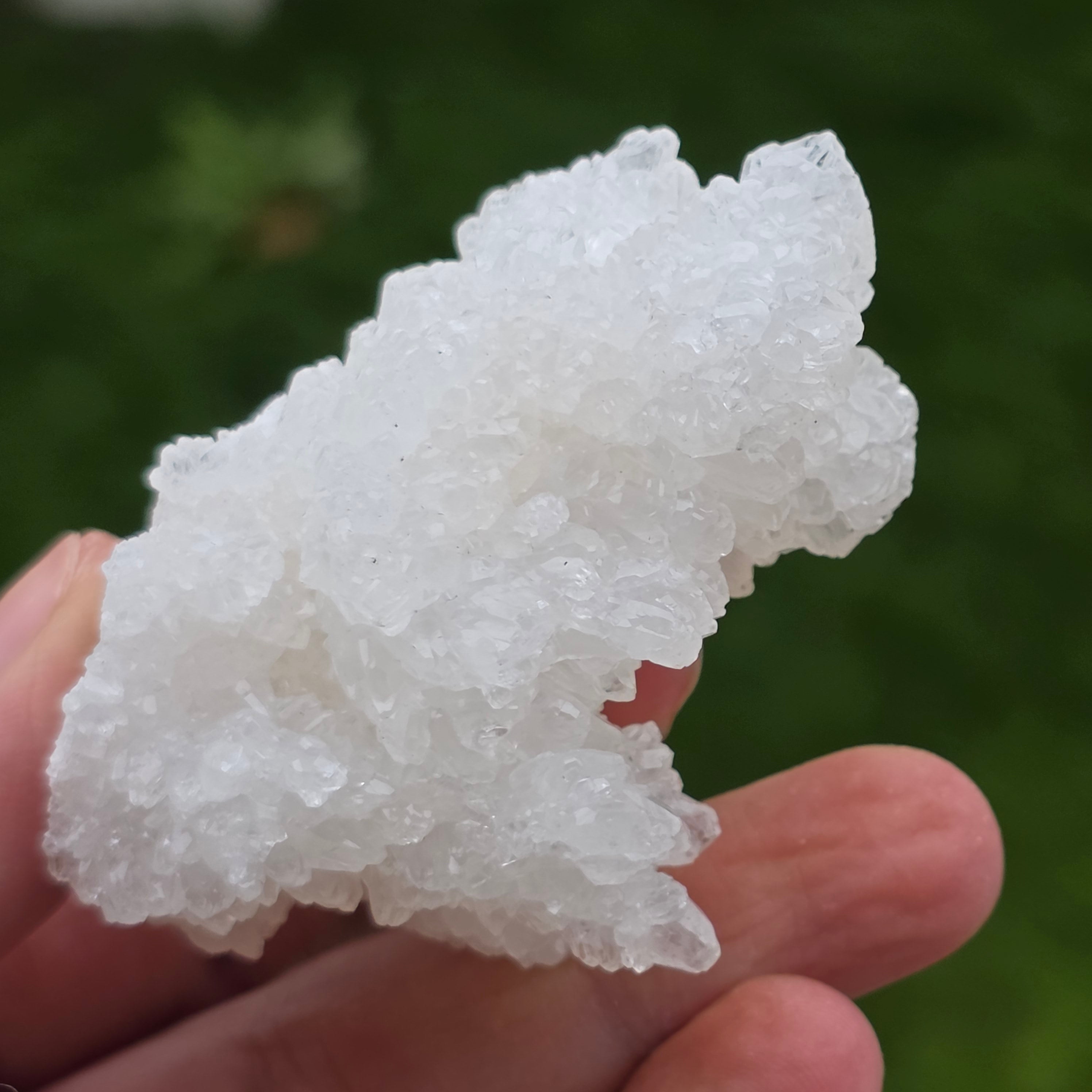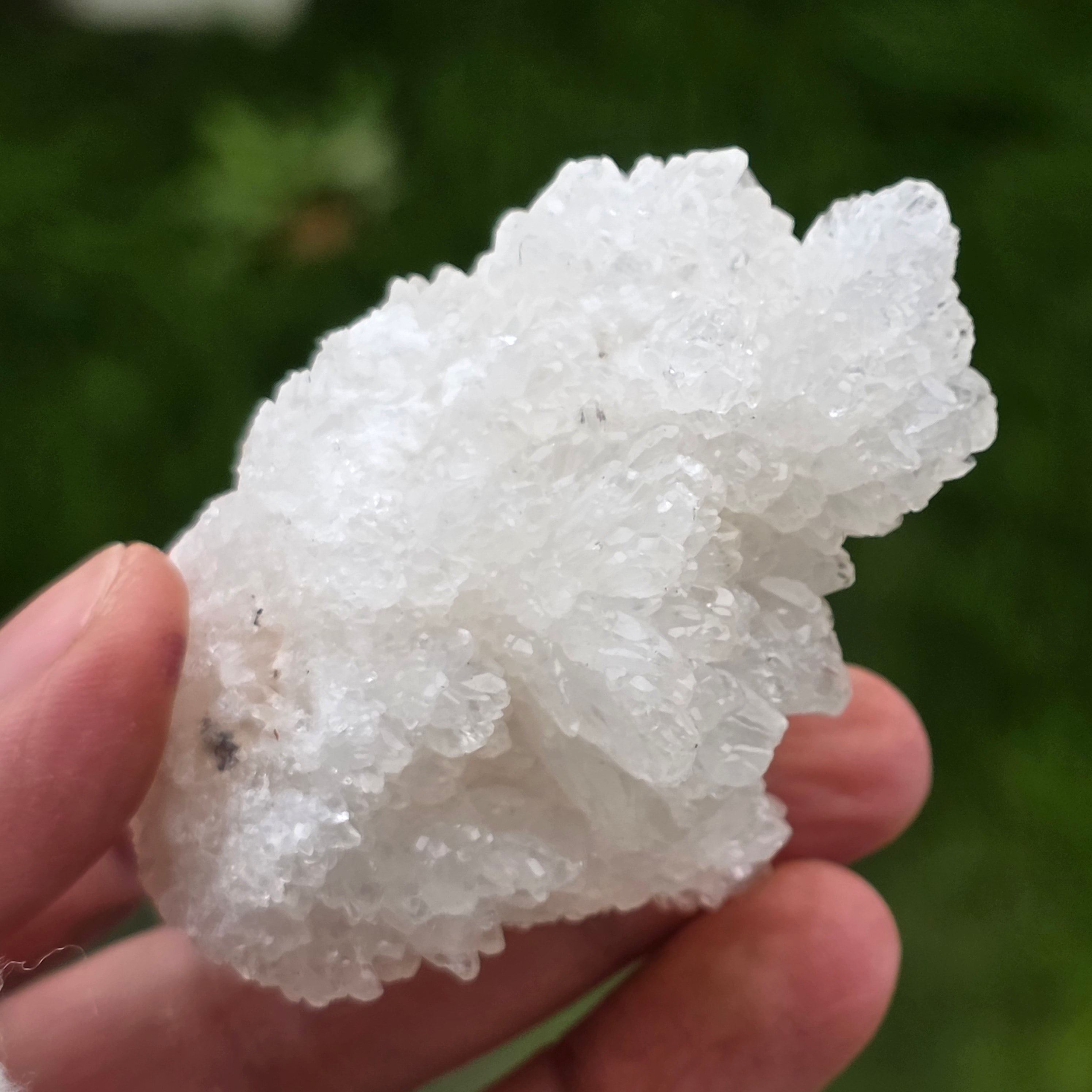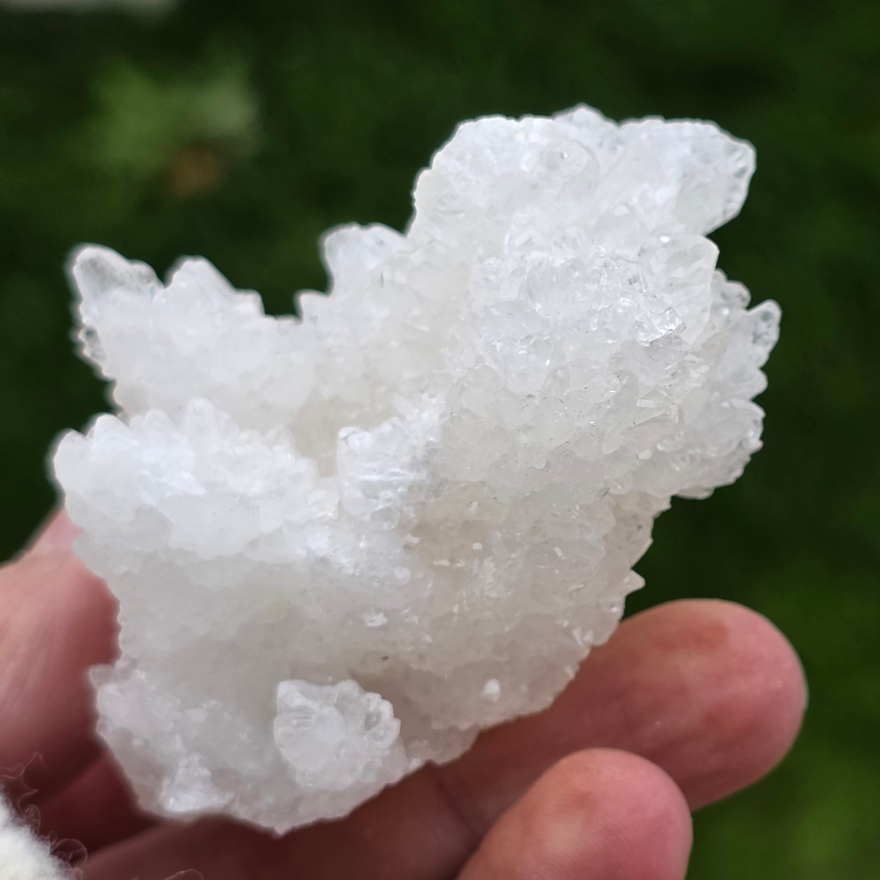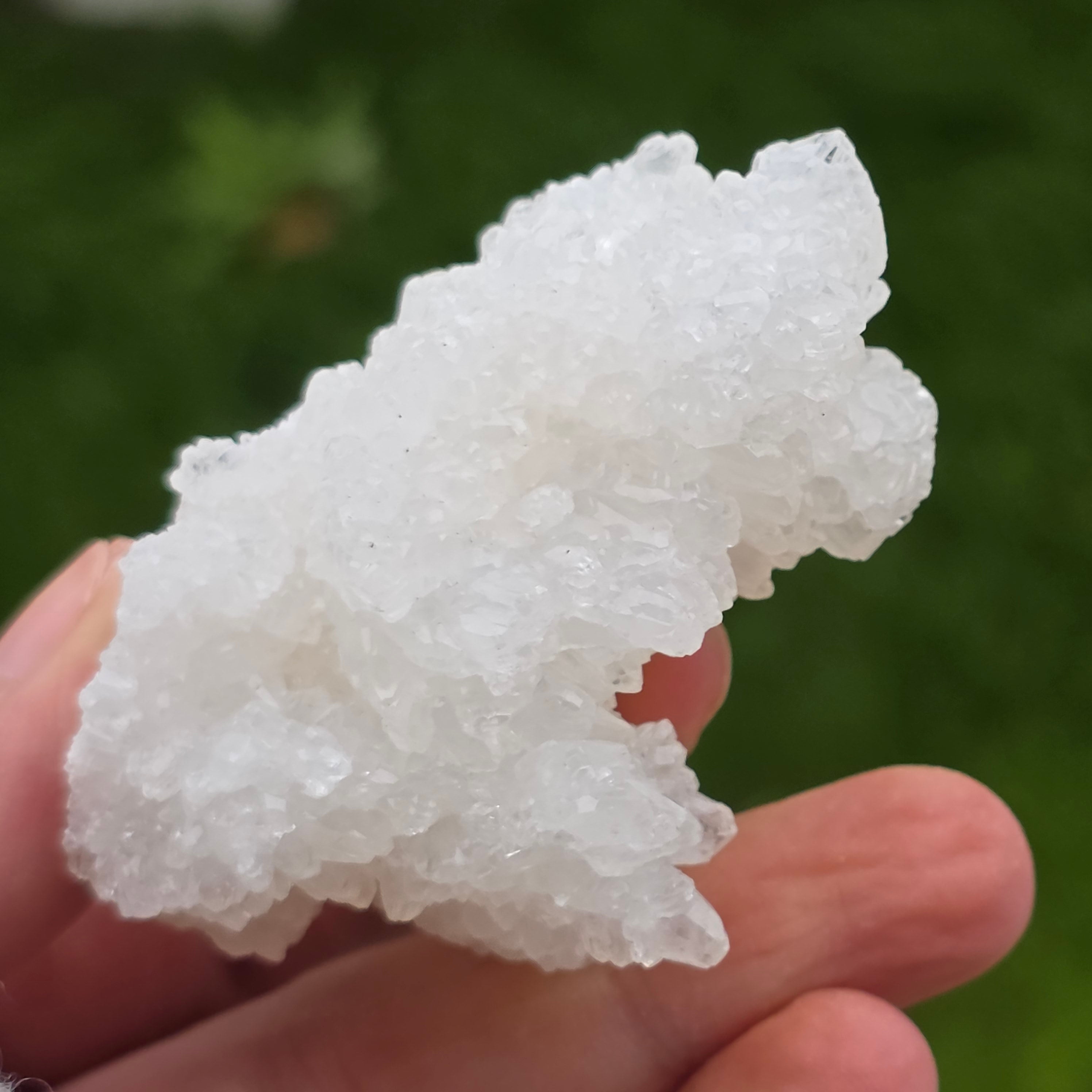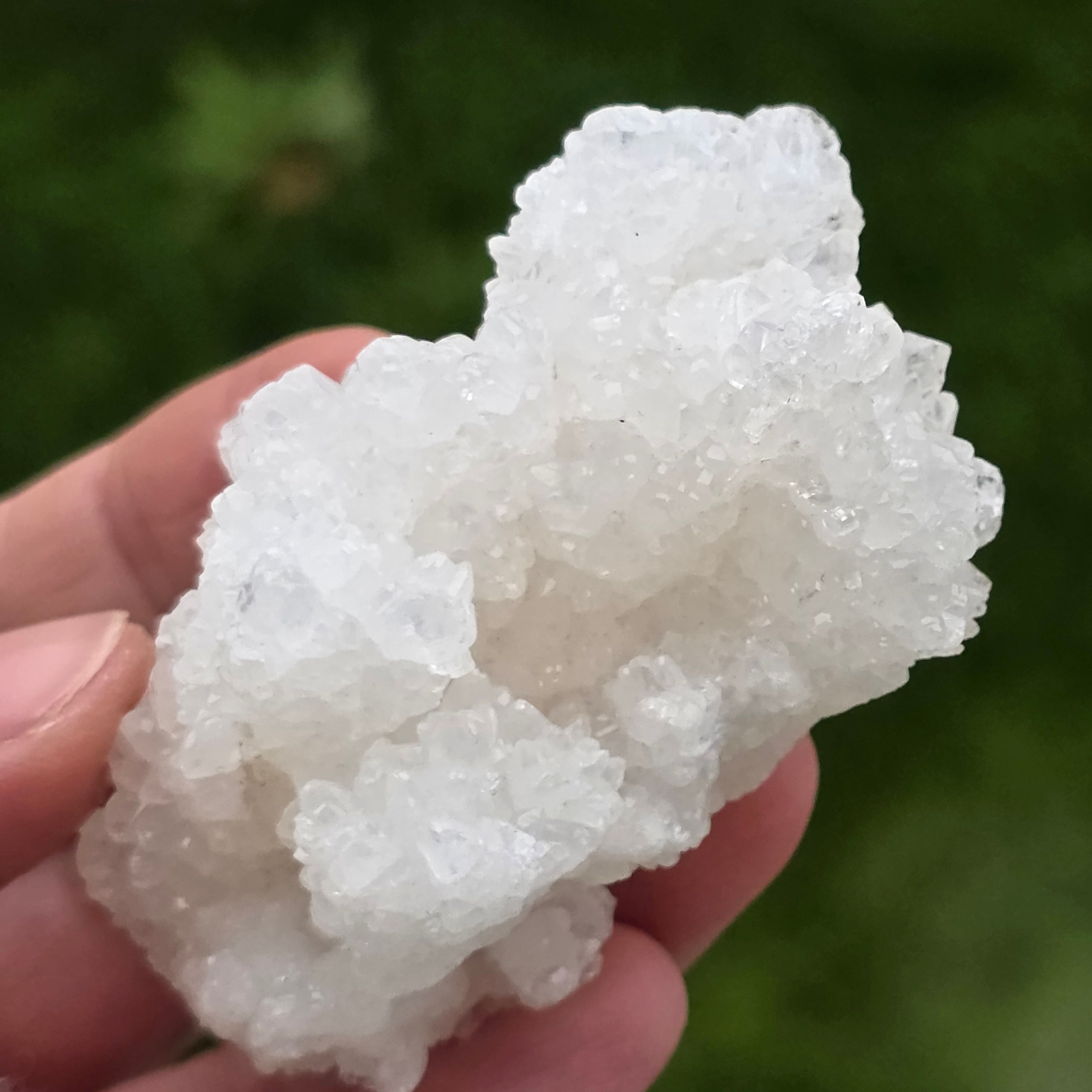 Cristalele sunt dispuse în structuri neregulate, rotunjite, cu suprafețe ușor sclipitoare, amintind de formațiuni întâlnite în interiorul peșterilor. Textura bogată și volumul bine definit conferă fiecărui exemplar un caracter autentic și expresiv, foarte apreciat în colecțiile de minerale și ca piesă decorativă naturală.