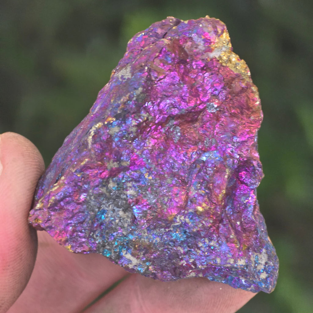 Calcopirita albastră și cea mov sunt asociate cu creșterea spirituală, intuiția și conectarea cu energiile superioare. Se crede că ajută la calmarea minții și stimularea creativității. Nuanțele sale irizate sunt legate simbolic de echilibru și armonie.