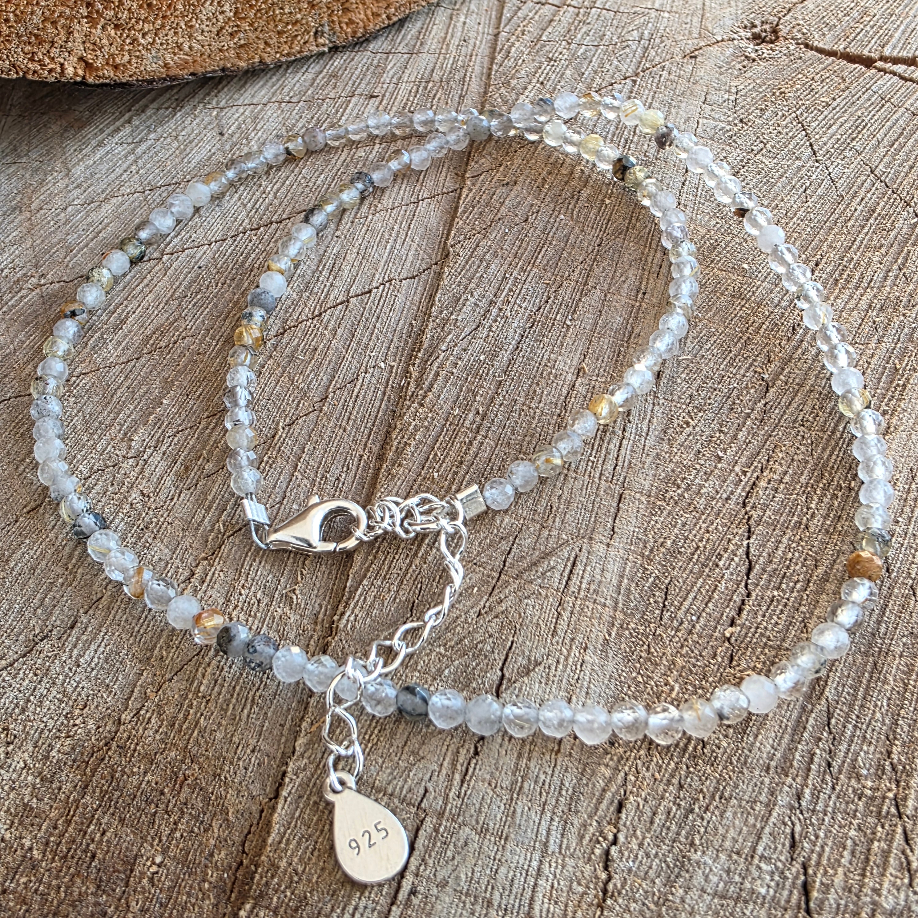 Der Thread besteht aus Perlen durch 3 mmJeder von ihnen hält eine ganze Welt im Inneren. Diese seltene Quarzsorte enthält feine Routylnadeln - goldene Garne oder Kupferkupfer, wie am Kristall befestigte Sonnenfilamente. Seine diskreten Reflexe fangen das Licht in subtilen Winkeln auf und erzeugen einen Eindruck von lebenden, aber ruhigen Bewegungen.